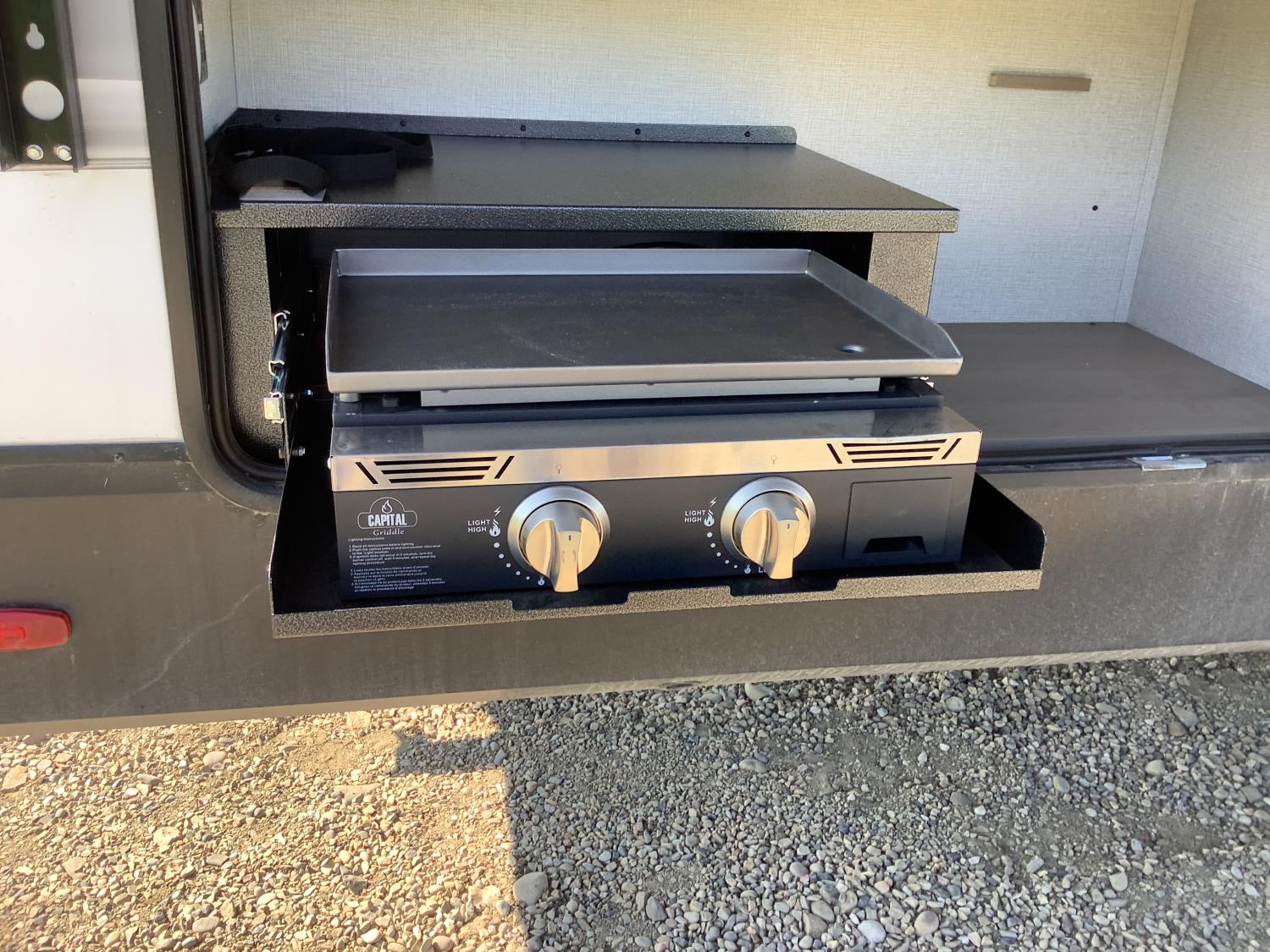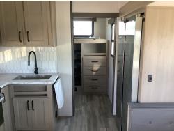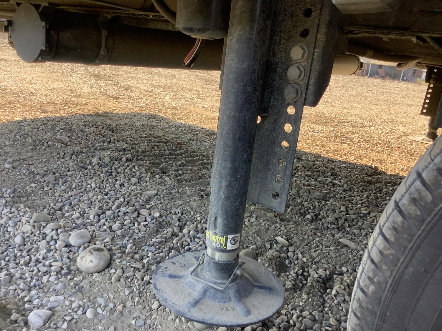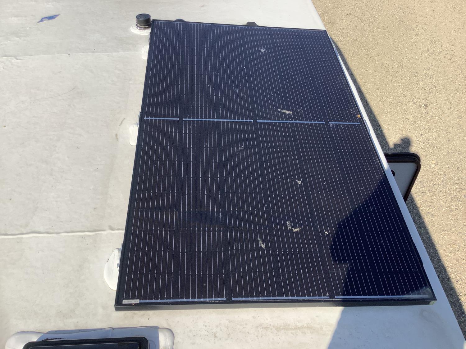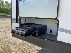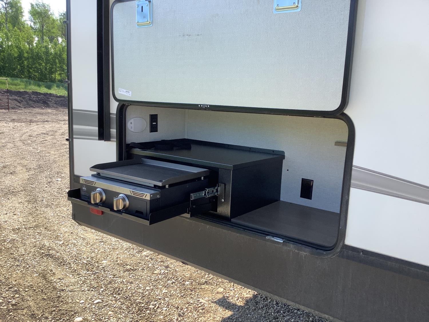 A/C, outdoor kitchen, power awning, Full size fridge with freezer, one TV, furnace, full size bathroom, one slide, (2) rear bunks, fresh water system station, electronic control for leveling jacks, rear tow hitch, tire line control, roof mount solar charging system, (2) propane tanks, 225/75R15 tires