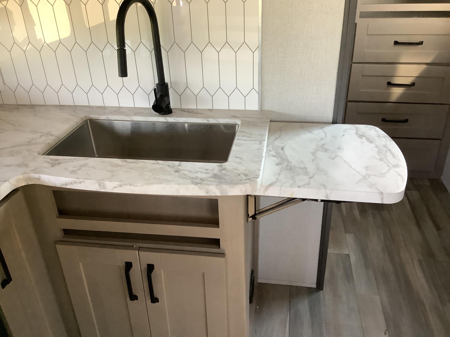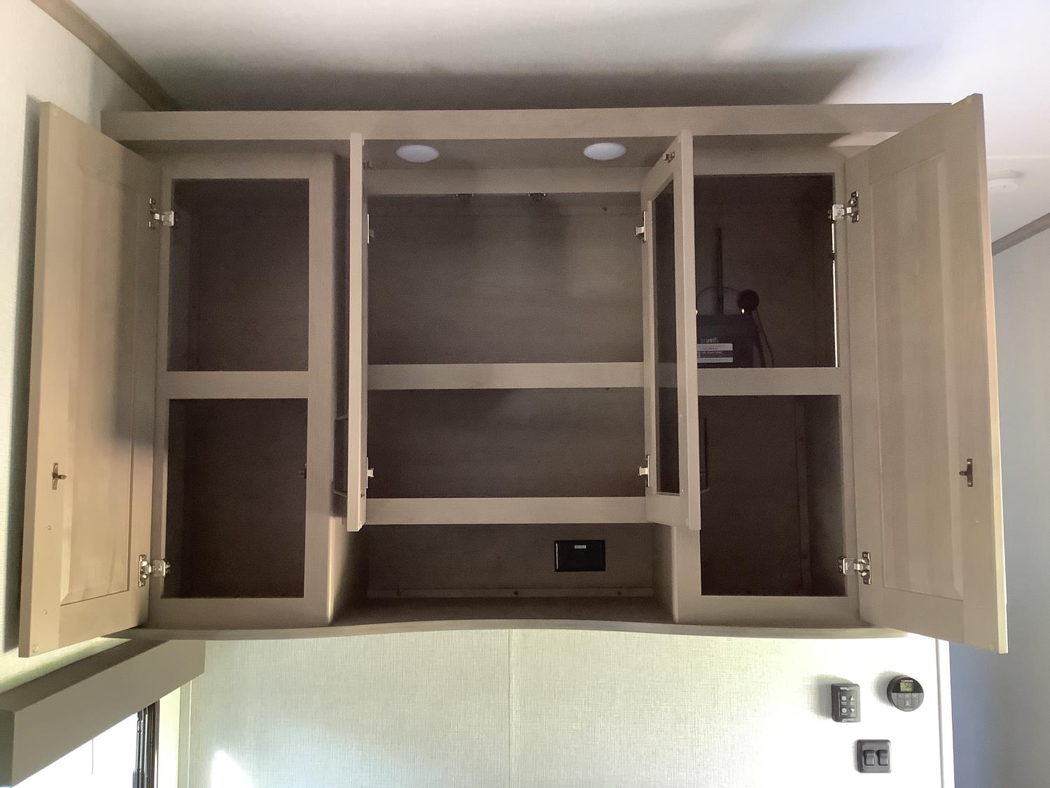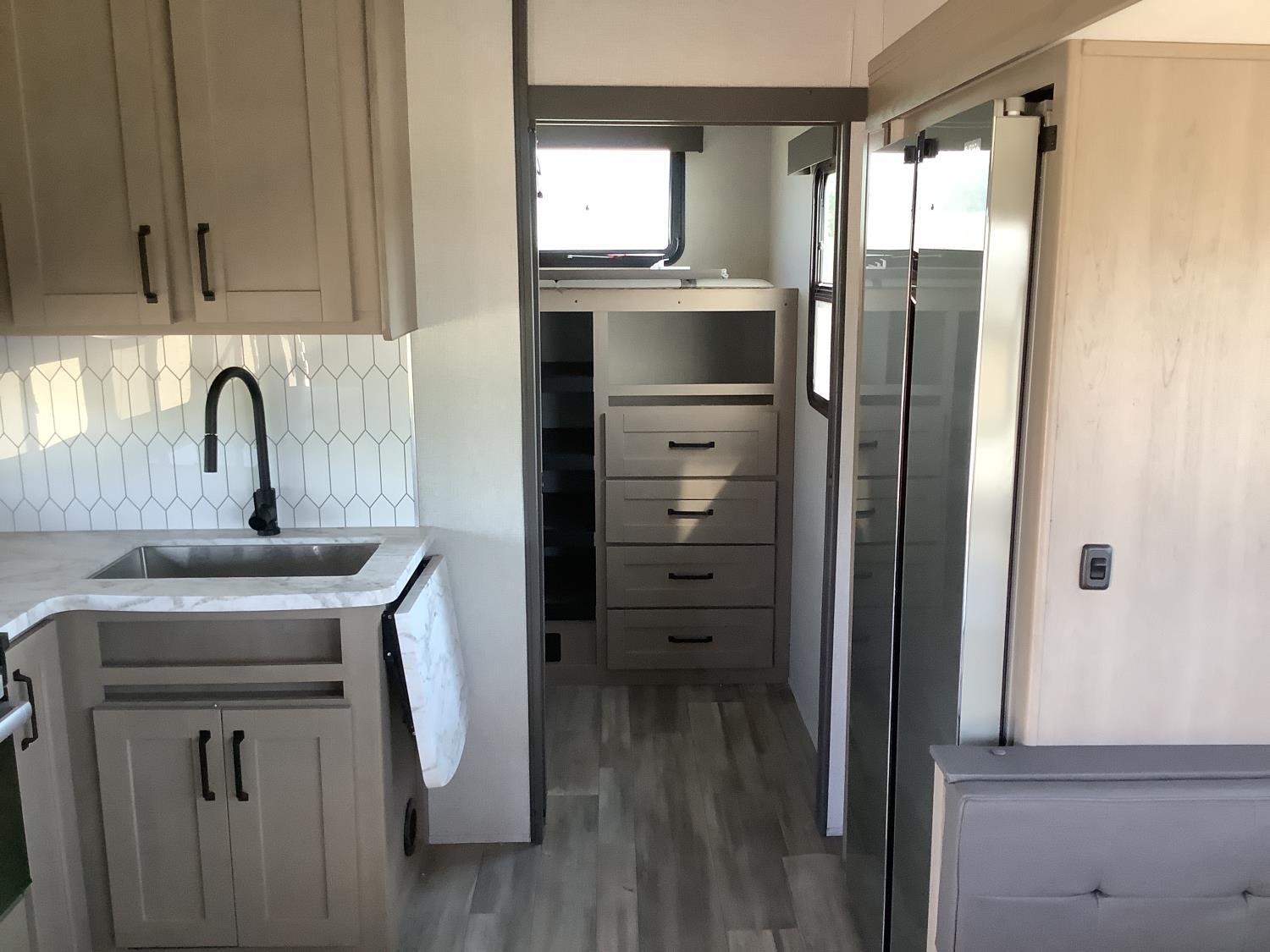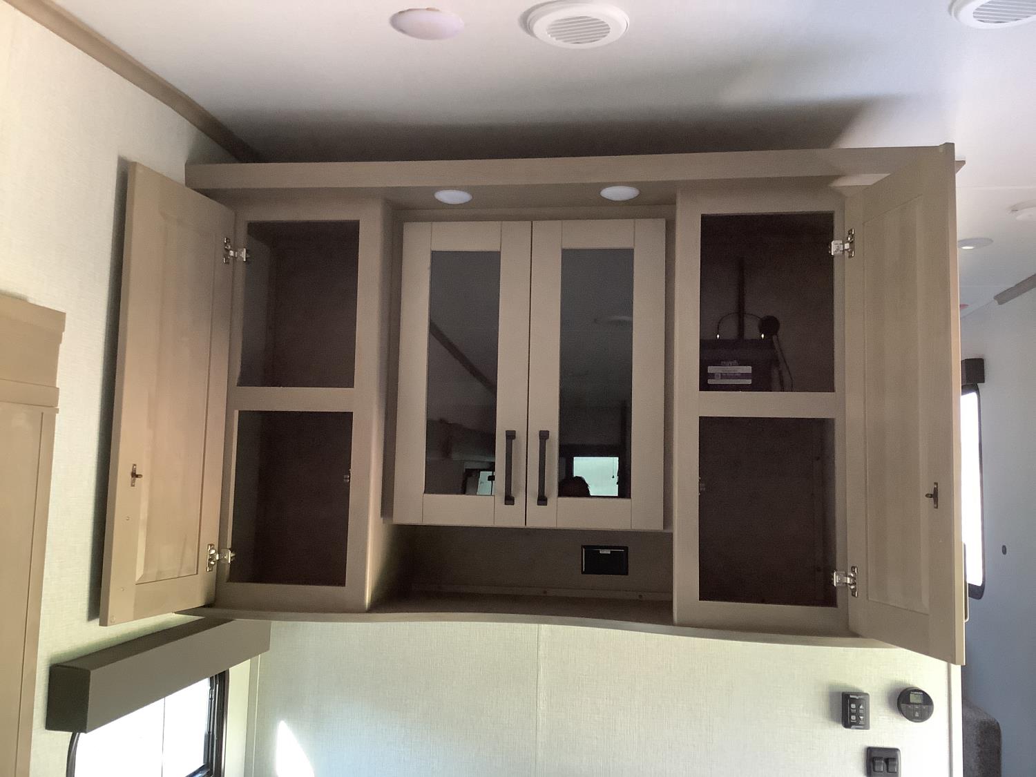 A/C, outdoor kitchen, power awning, Full size fridge with freezer, one TV, furnace, full size bathroom, one slide, (2) rear bunks, fresh water system station, electronic control for leveling jacks, rear tow hitch, tire line control, roof mount solar charging system, (2) propane tanks, 225/75R15 tires