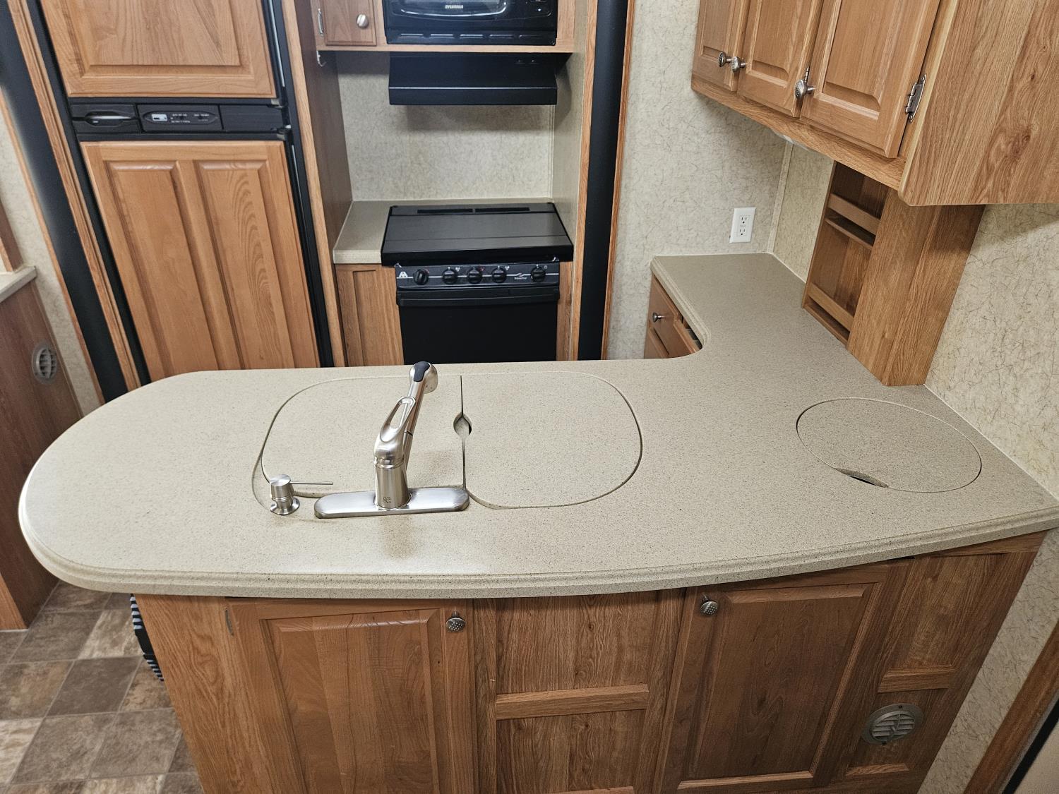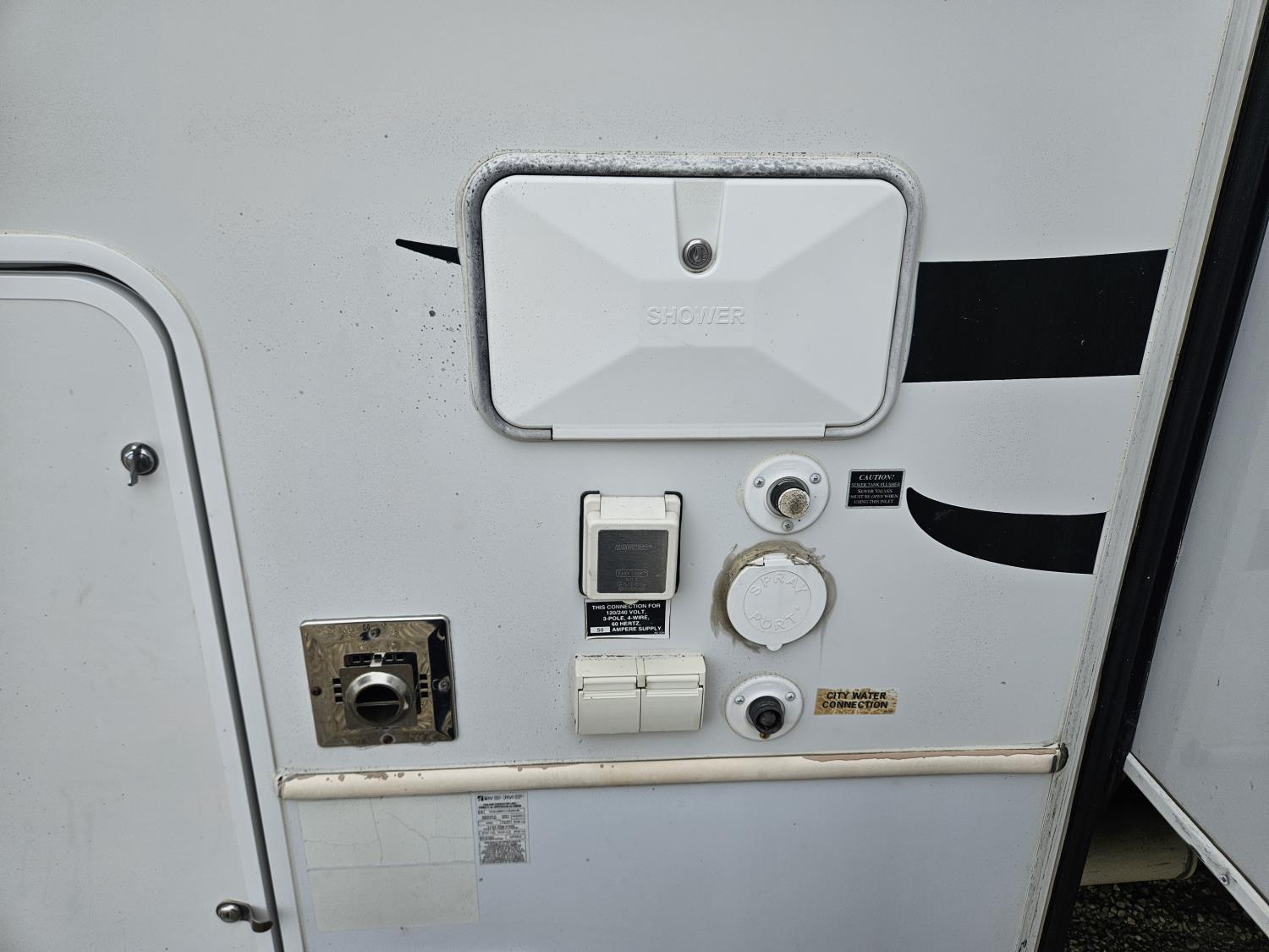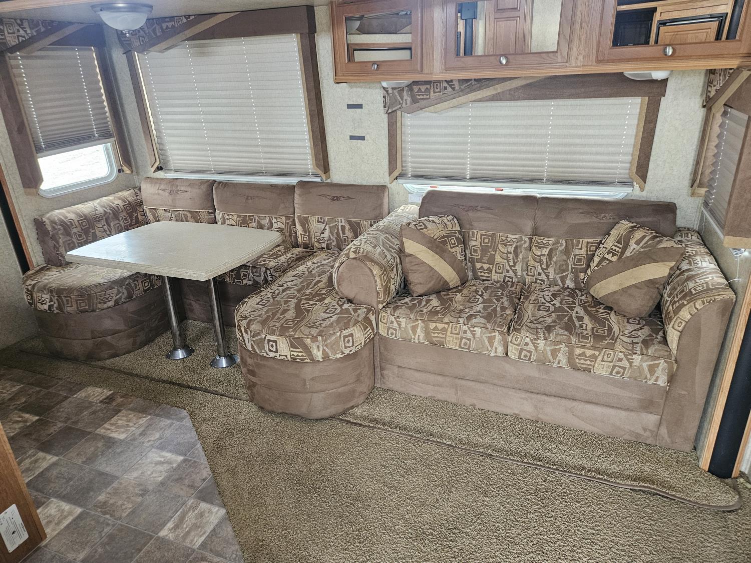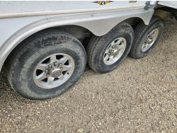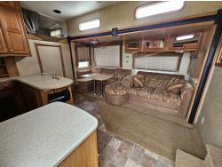 Sleeps 8, stove, fridge, microwave, full bath, master bedroom, A/C, outdoor shower, 3 slides, manual awning, Onan QG 5500 generator, spring suspension, electric brakes, u shaped dinette, hide abed sofa, (2) furnaces, (2) AC units, 12 ft garage, tv, DVD player, indoor outdoor stereo, (2) 30 lb propane tanks, fueling station, 235/85R16 tires