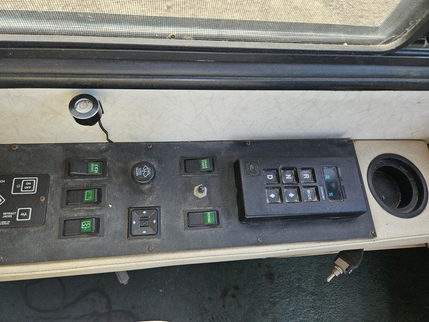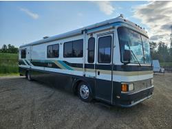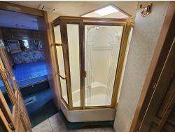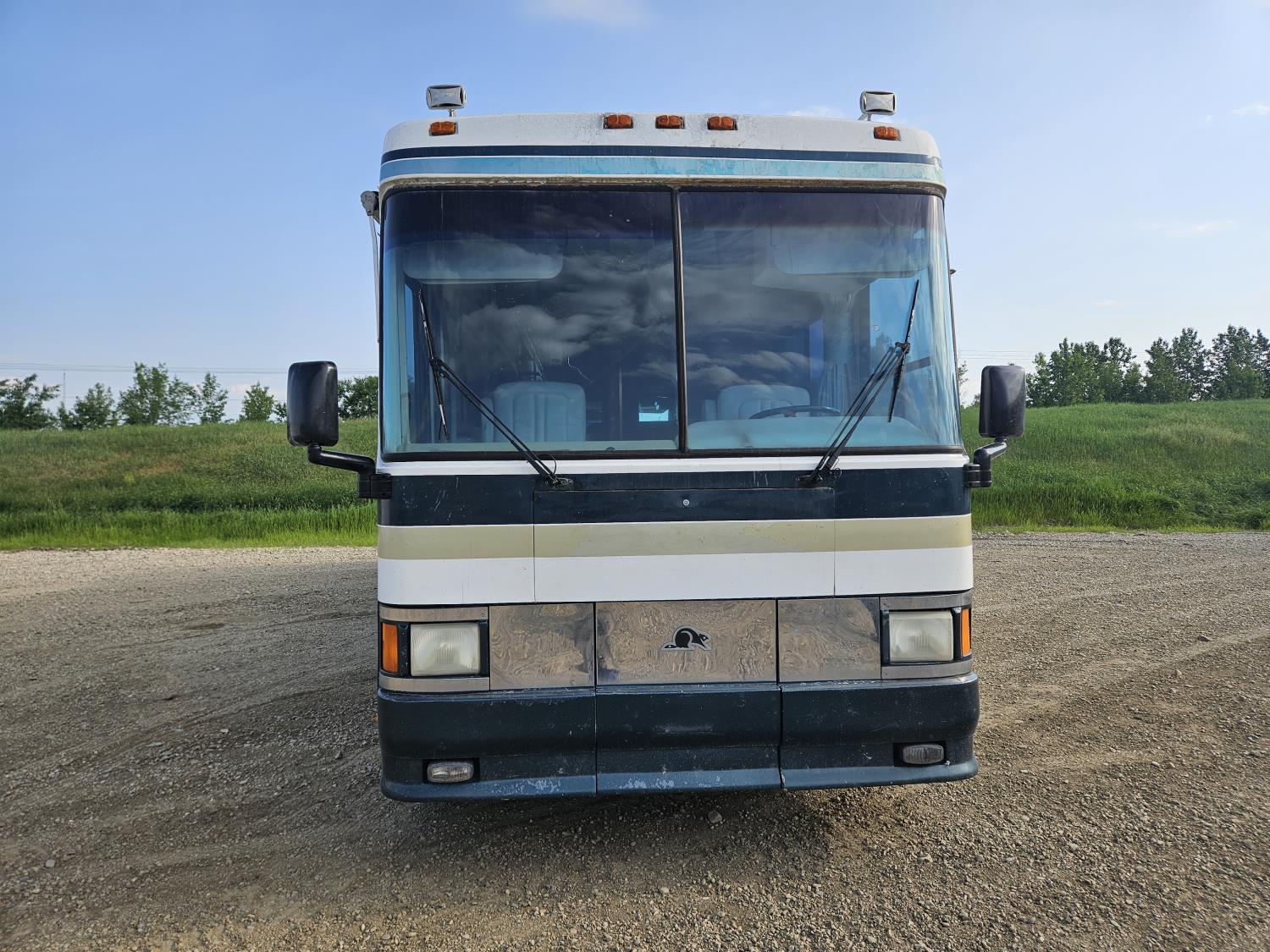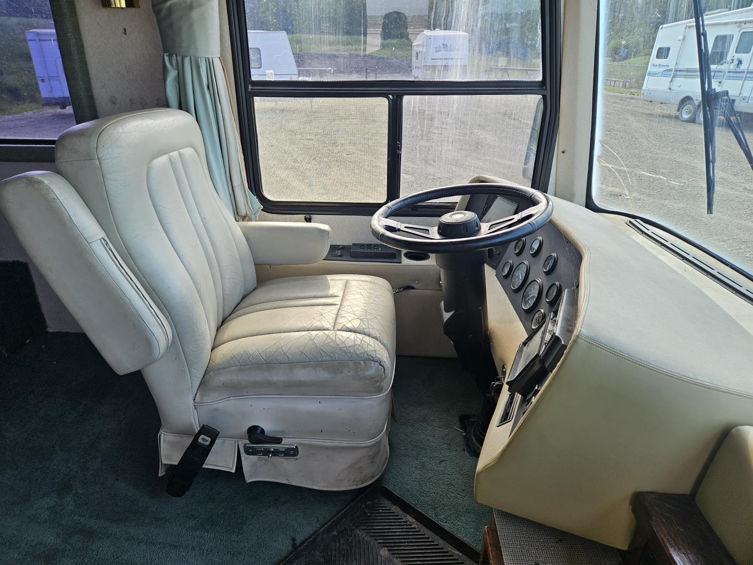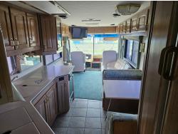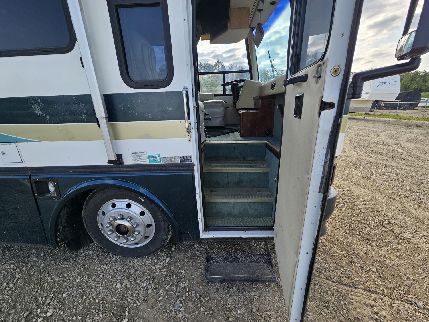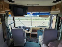 Cat 3126 6 cylinder diesel engine, automatic transmission, air brakes, Onan Marquis 6500 LP generator, rear bedroom, full master bathroom, dinette, sofa, chair, fridge, stove, dishwasher, A/C, power levelling jacks, TV, electric step, under belly storage, new batteries, new tires, new window awnings, aluminum wheels, 255/70R22.5 tires