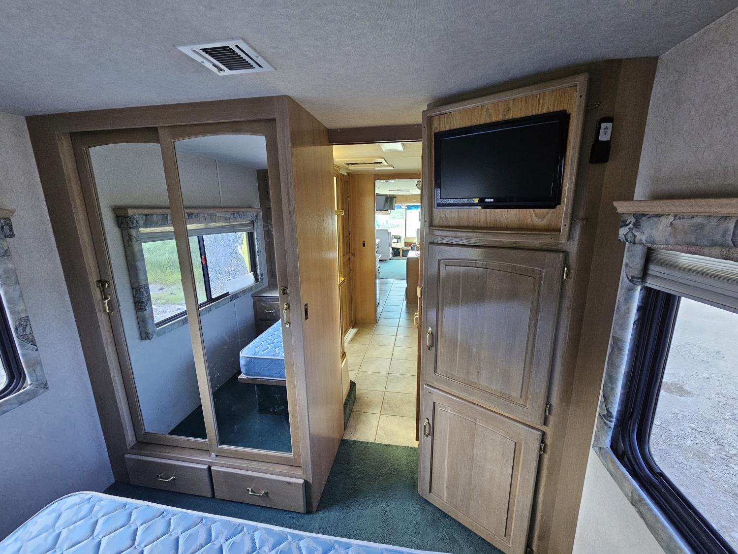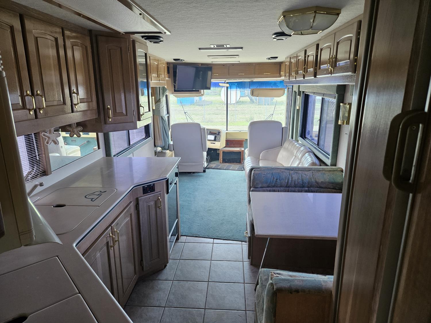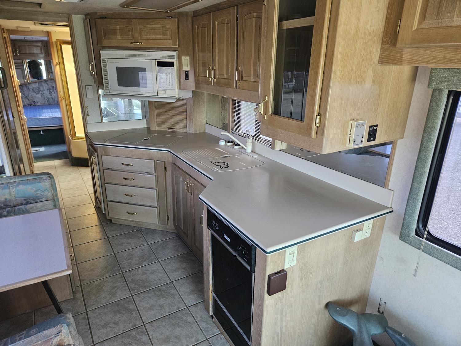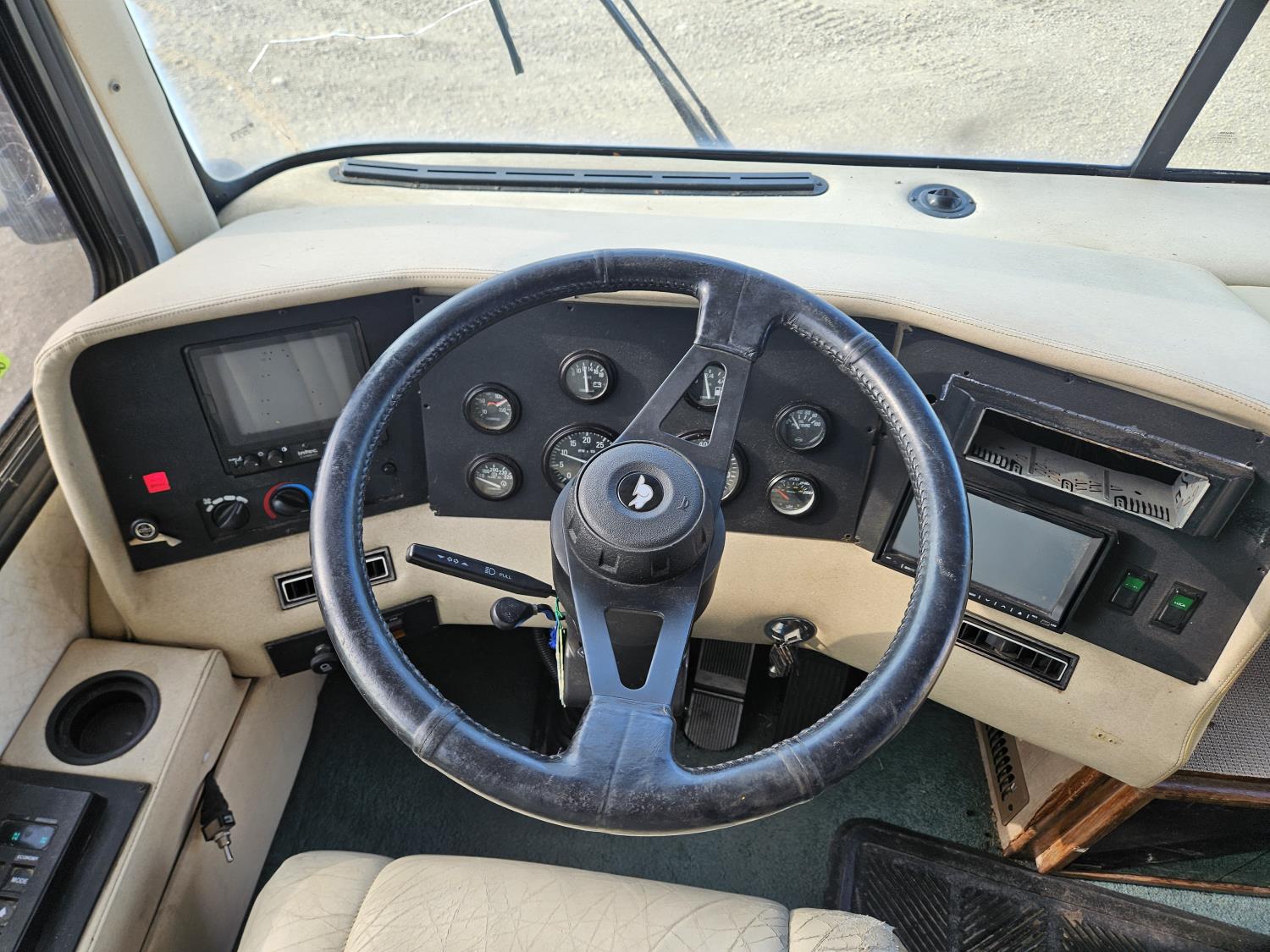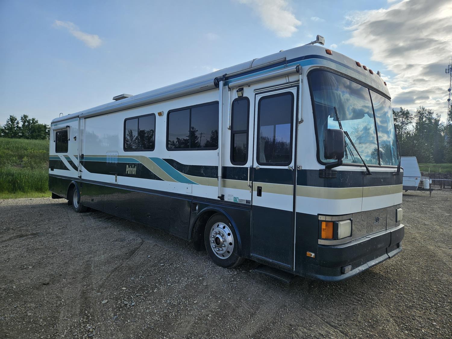 Cat 3126 6 cylinder diesel engine, automatic transmission, air brakes, Onan Marquis 6500 LP generator, rear bedroom, full master bathroom, dinette, sofa, chair, fridge, stove, dishwasher, A/C, power levelling jacks, TV, electric step, under belly storage, new batteries, new tires, new window awnings, aluminum wheels, 255/70R22.5 tires