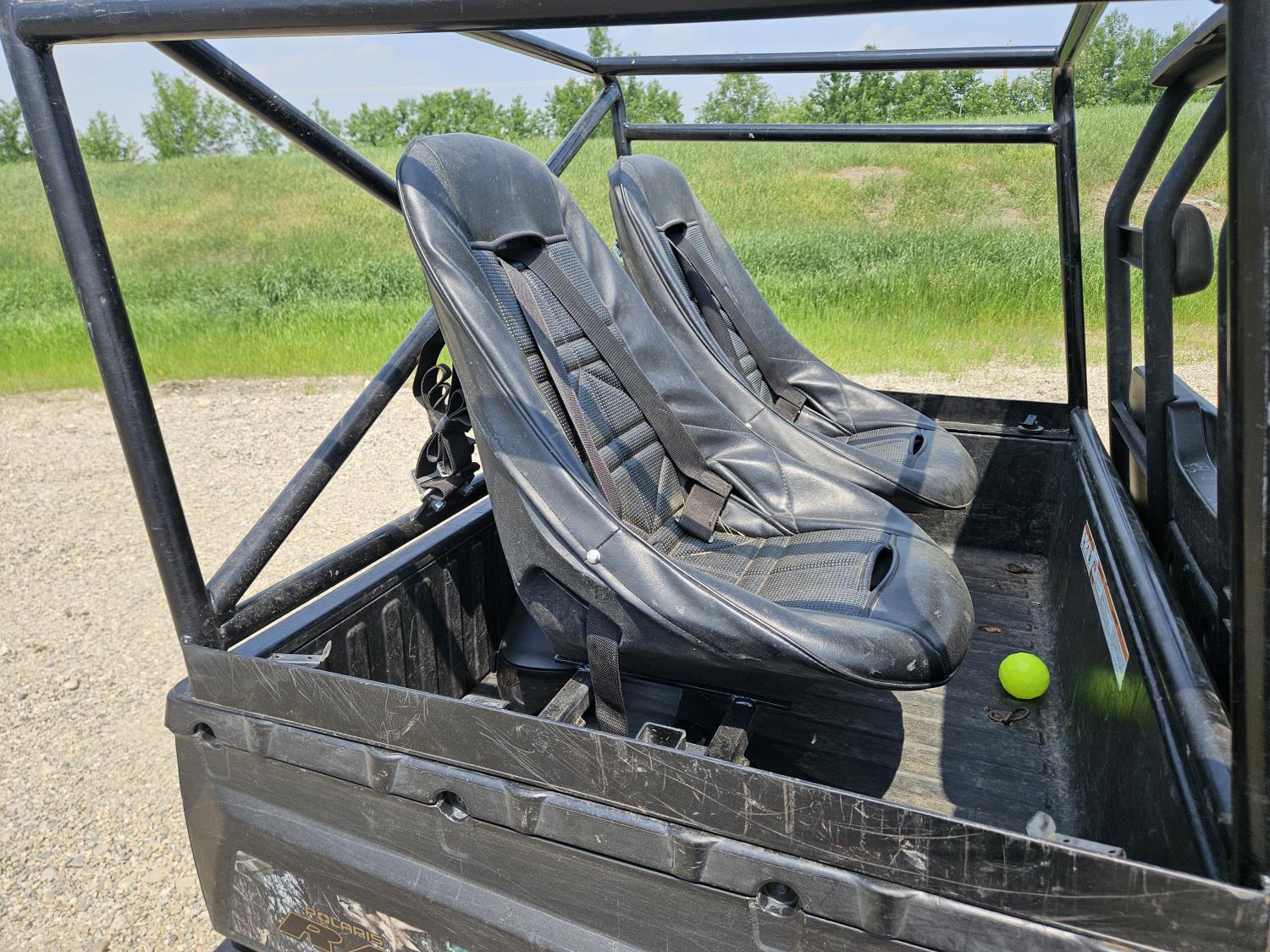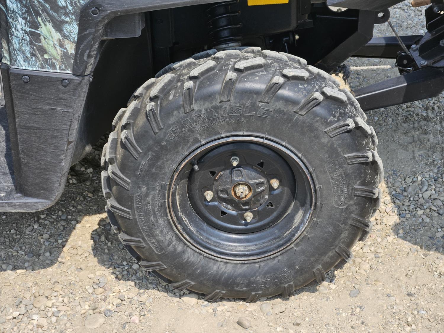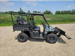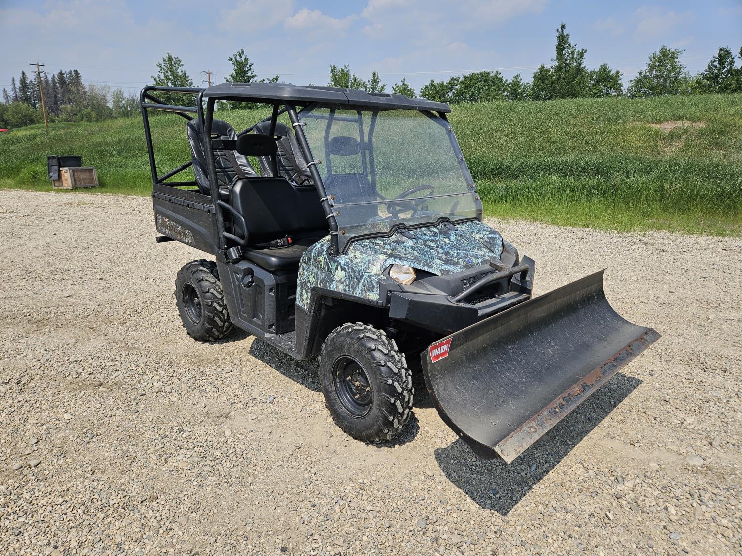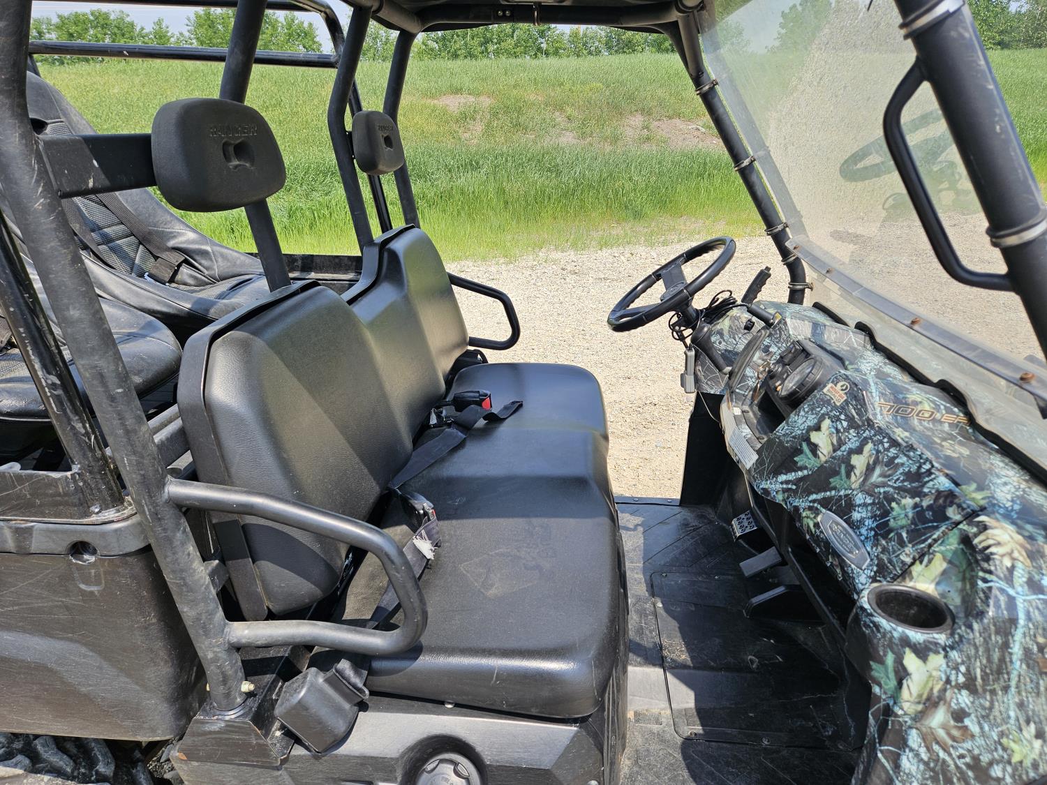 700 cc fuel injected water cooled engine, automatic transmission, Hi/Lo range, reverse, open canopy, 5 passengers, windshield, 72 inch front blade, front winch, electric dump box, receiver hitch, independent suspension, rear box roll cage, extra rear seats w/ 4 point harness, tilt steering, new battery, new front shocks, 4wd has intermediate issue, 26X8.00R12 front tires, 26X10.00R12 rear tires