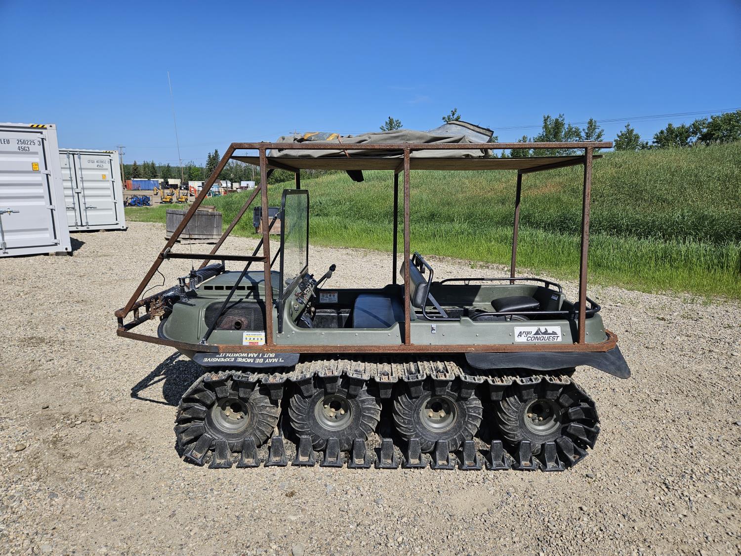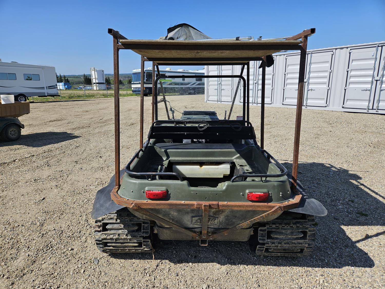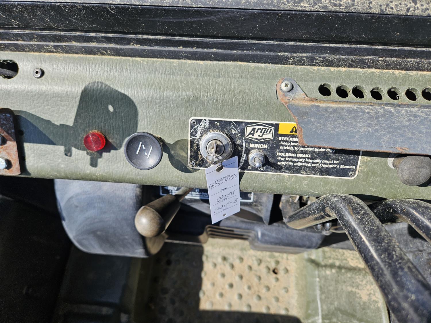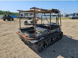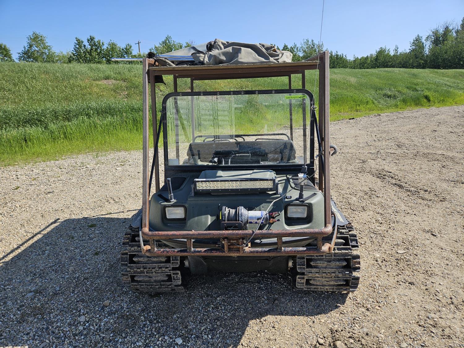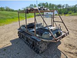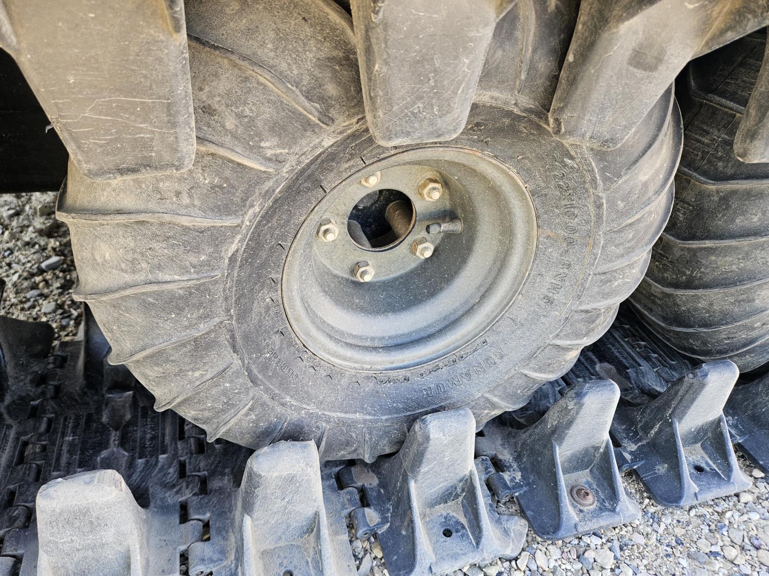 Kawasaki 20 HP gas engine, hydrostatic transmission with hi/lo reverse, front mount winch, twist throttle, enclosure canopy, tracks, spare track parts, receiver hitch, 22x10.00-8 tires