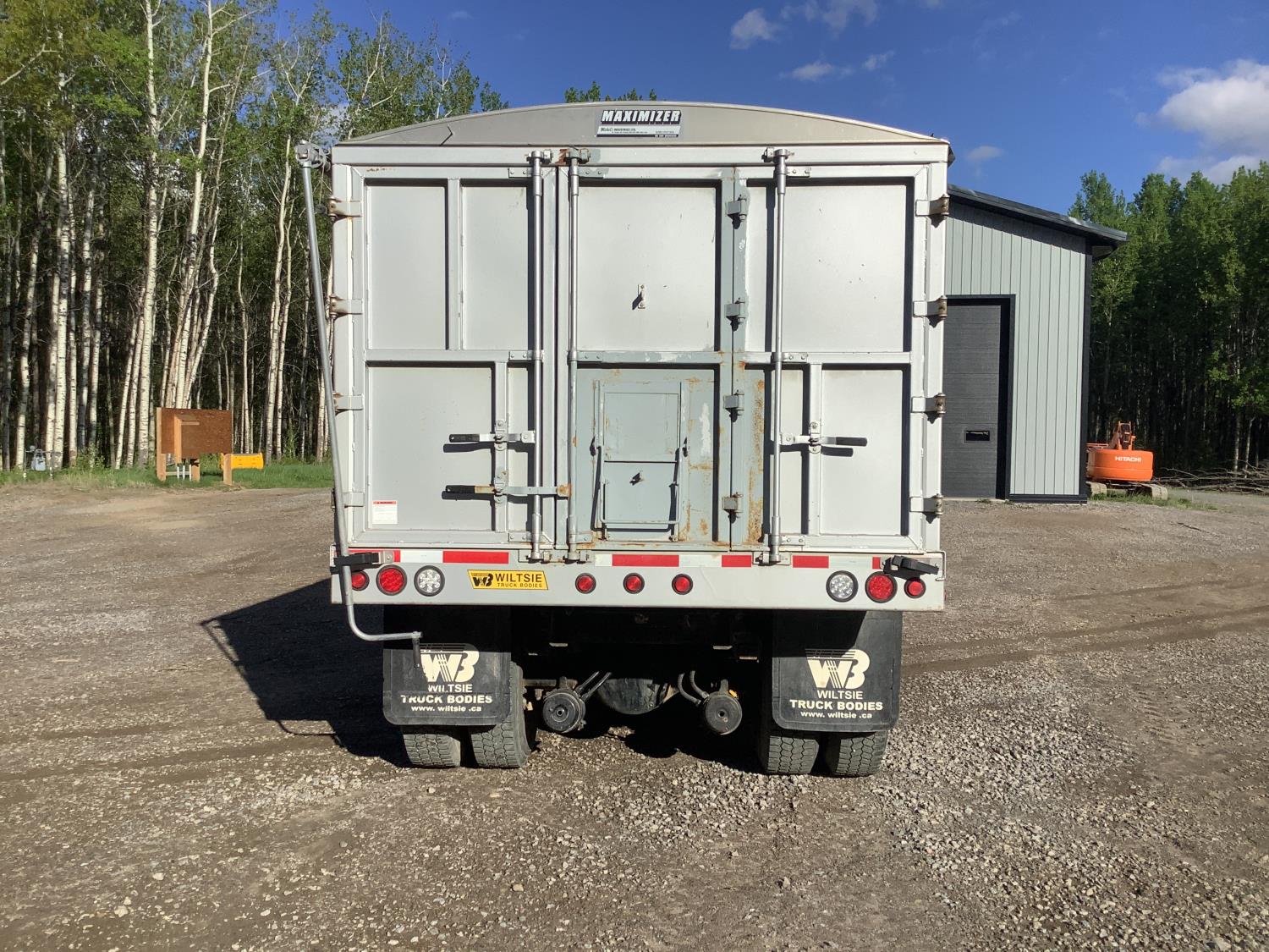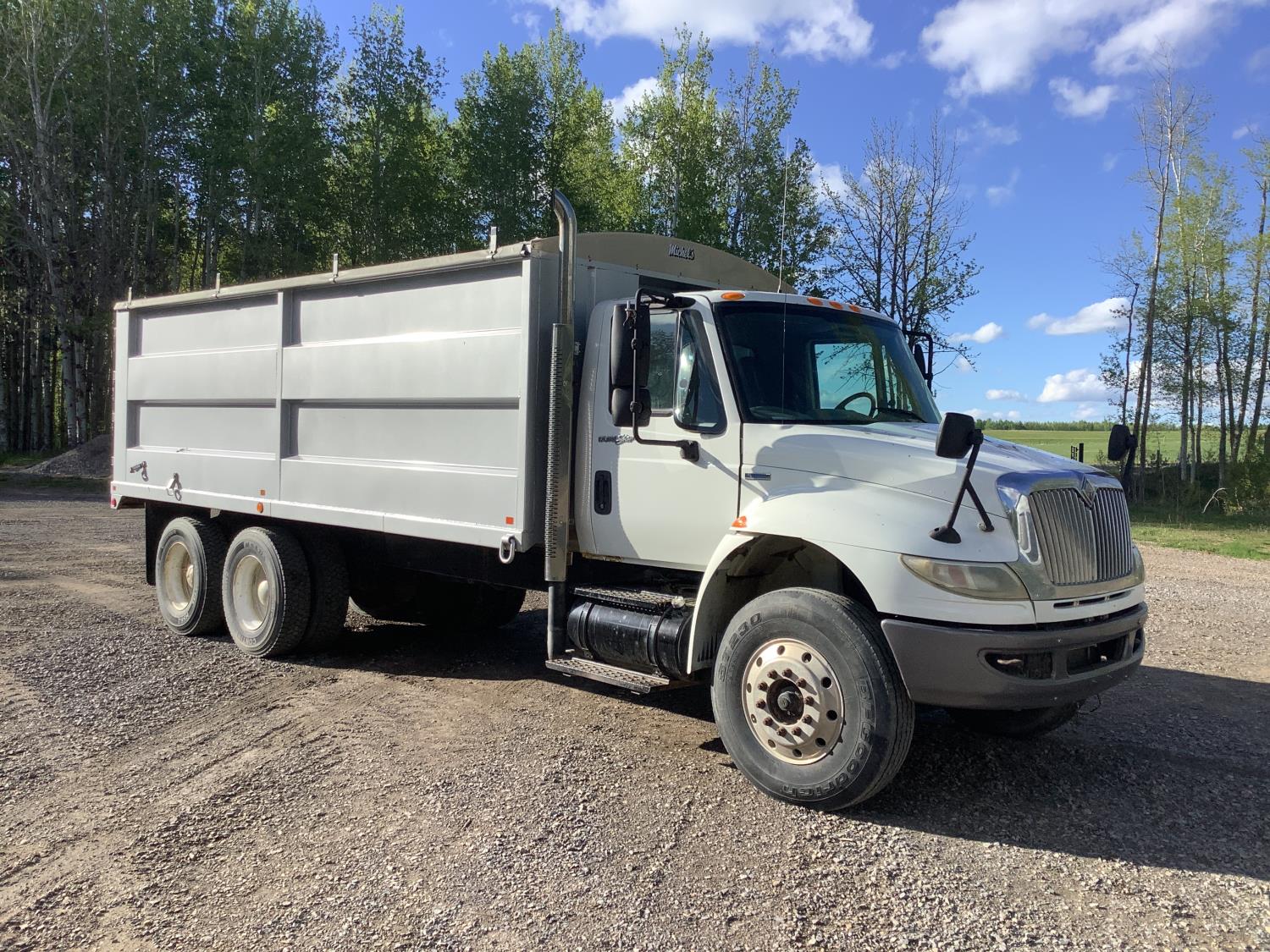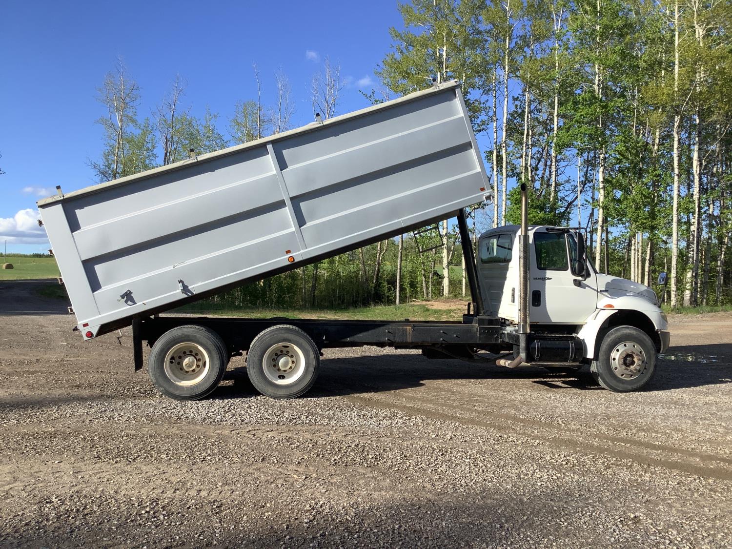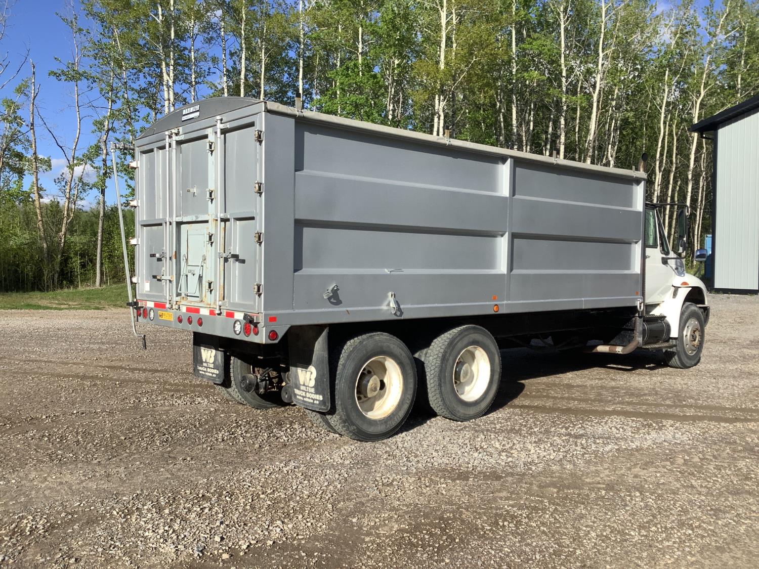 International 9 L 6 310 HP diesel engine, DEF deleted, engine brake, Fuller 10 speed manual transmission, A/C, air ride driver seat, P/W, P/L, 4 year old 20' Wiltsie grain box, 3 piece tailgate, hoist, PTO, roll tarp, single frame rail that has no rust, spring suspension, 14,000 lb front axle, 40,000 lb rear axles, full lockers, 11R22.5 tires