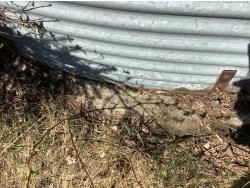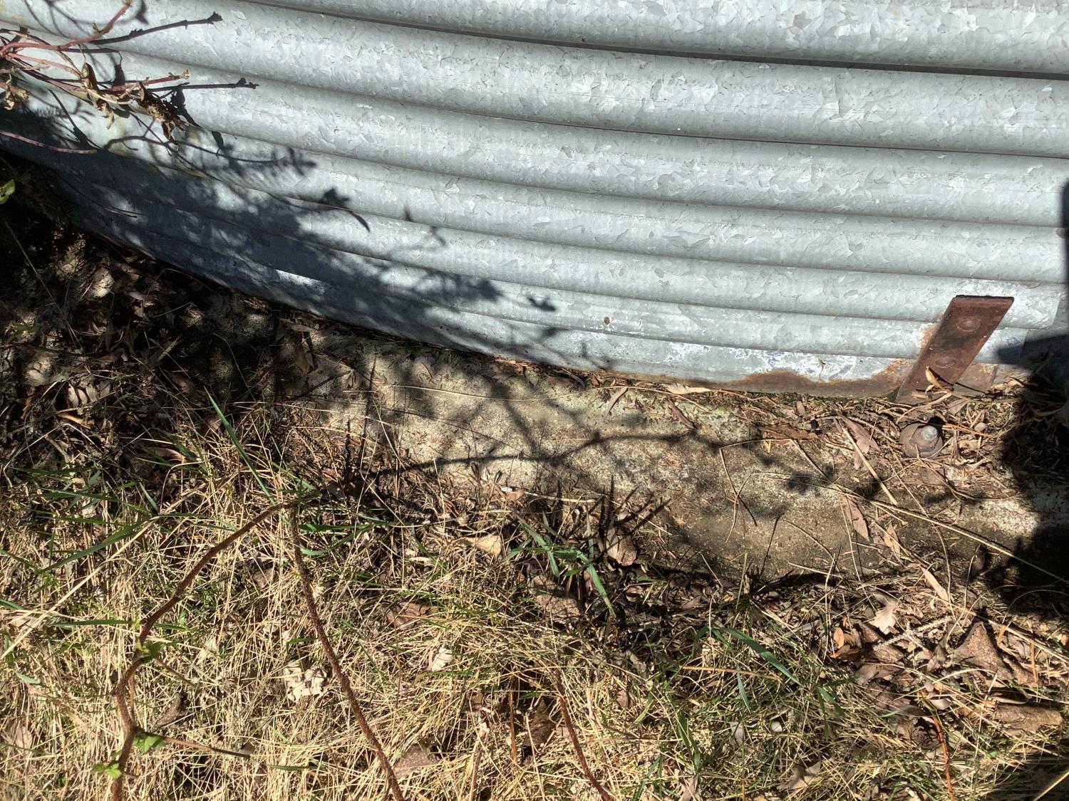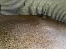 on concrete floor, Bin # 10. Note: There is a bit of spoiled grain in bin so take caution. Buyer may have to cut trees away to remove bin.
