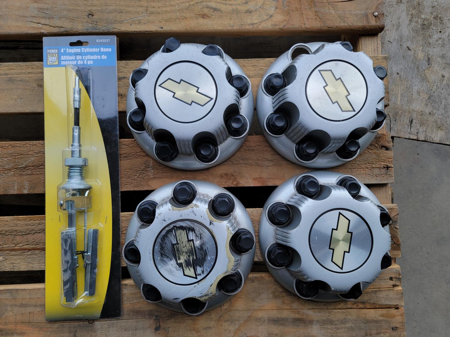 1642 (1) Firestone Steeltex 245/75R16 Tire, (4) 8 Bolt Chevrolet Hub Caps and 4 Inch Engine Cylinder Hone