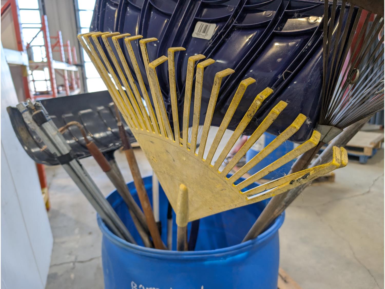 Rakes, shovels, sprinkler, electric hedge trimmer, pruning shears, hand-held broadcast seeder
