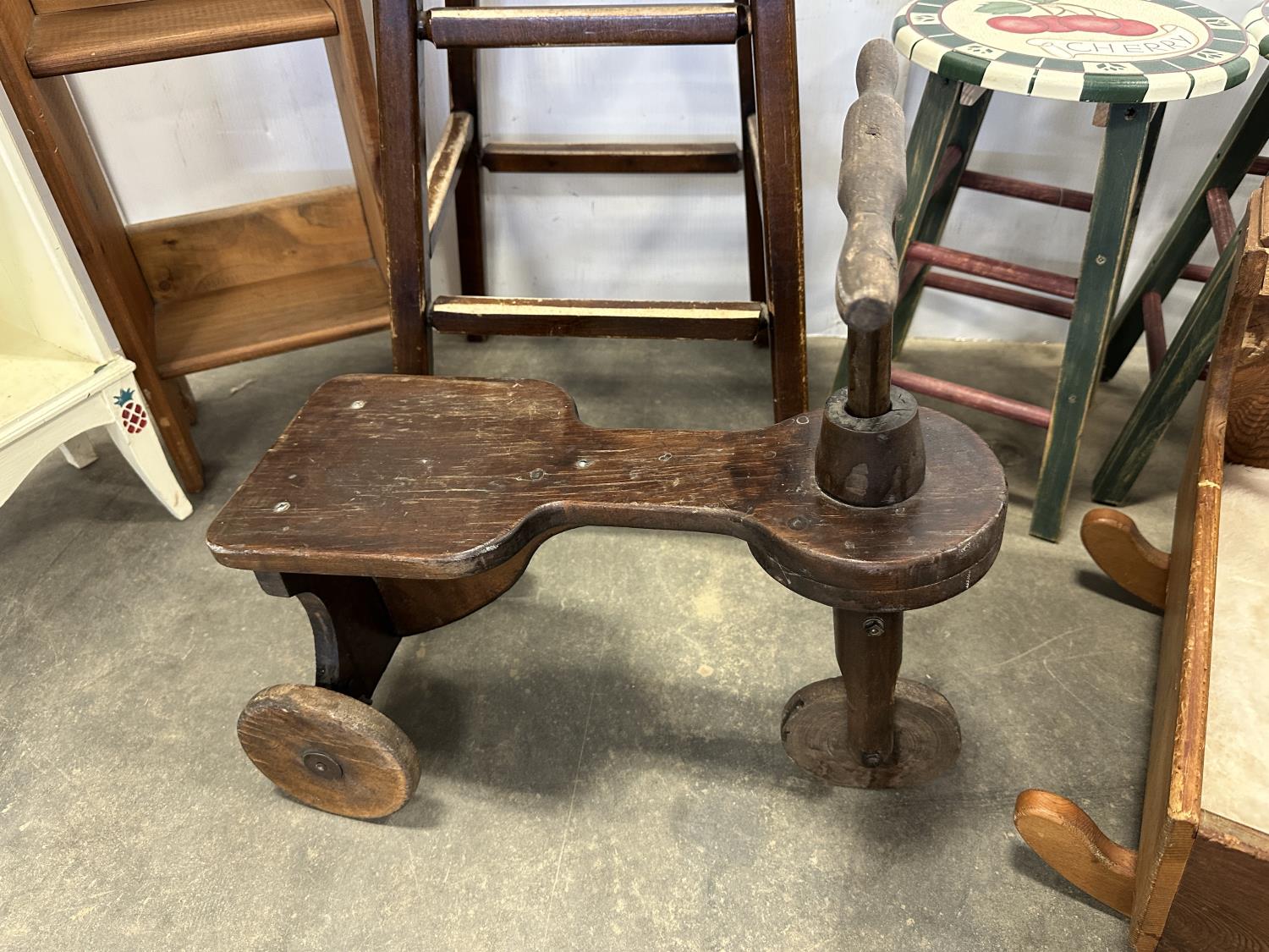 (2) 4 tier shelves, (4) stools, (3) doll cradles, antique wooden trike, painted pail, (5) metal sock forms