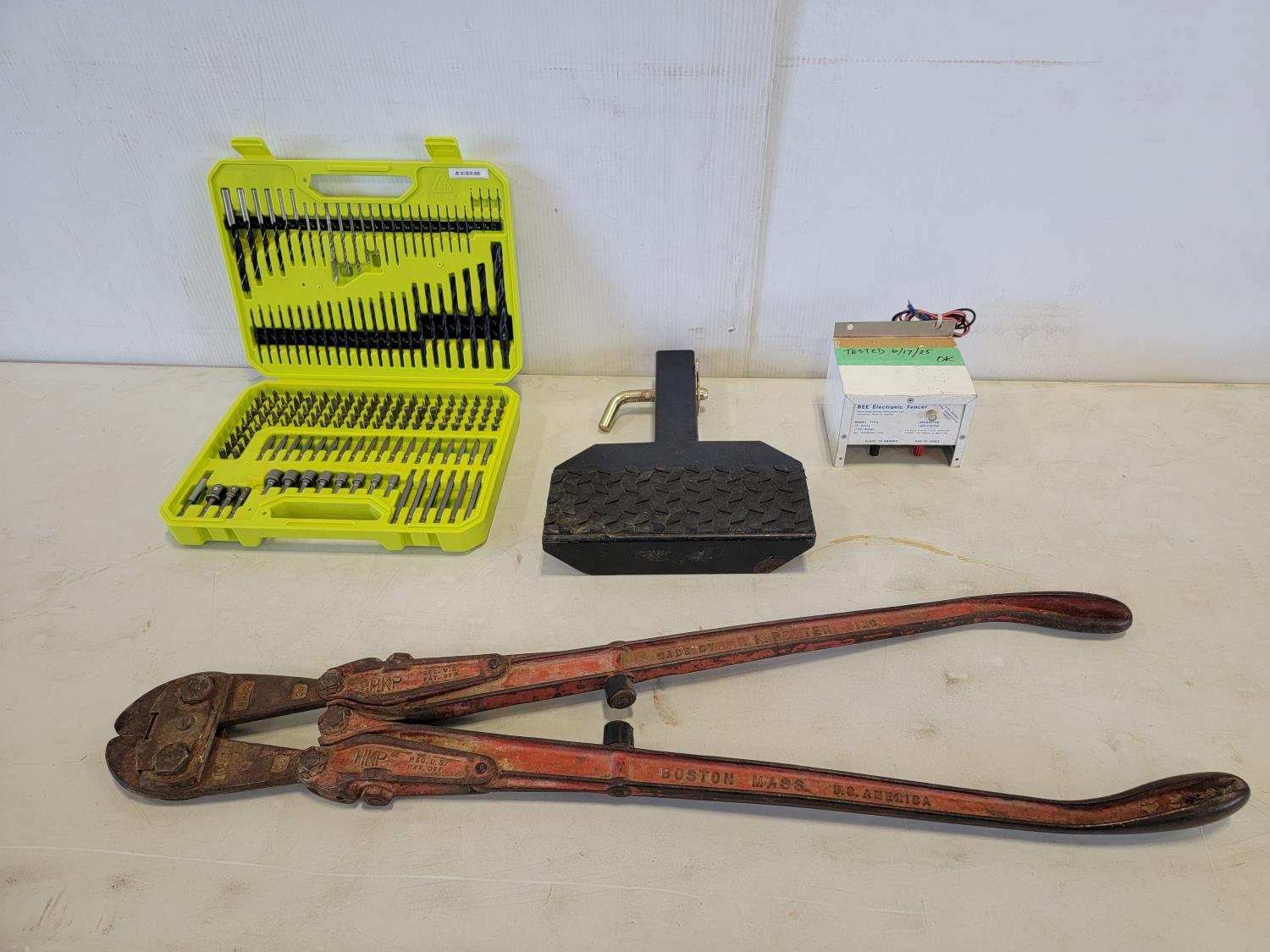 BEE electric fencer, 36 inch bolt cutters, Ryobi bit set, hitch-mount truck step