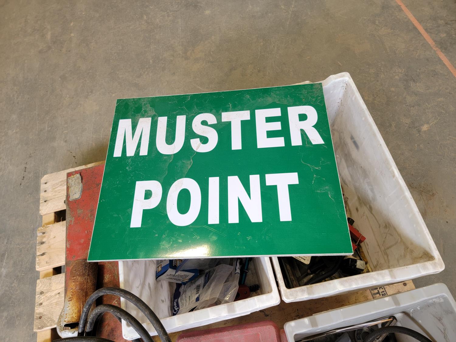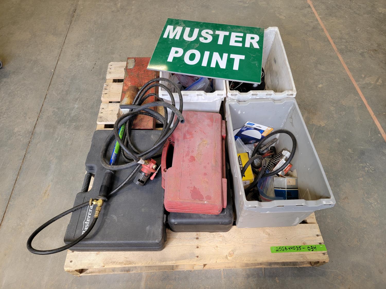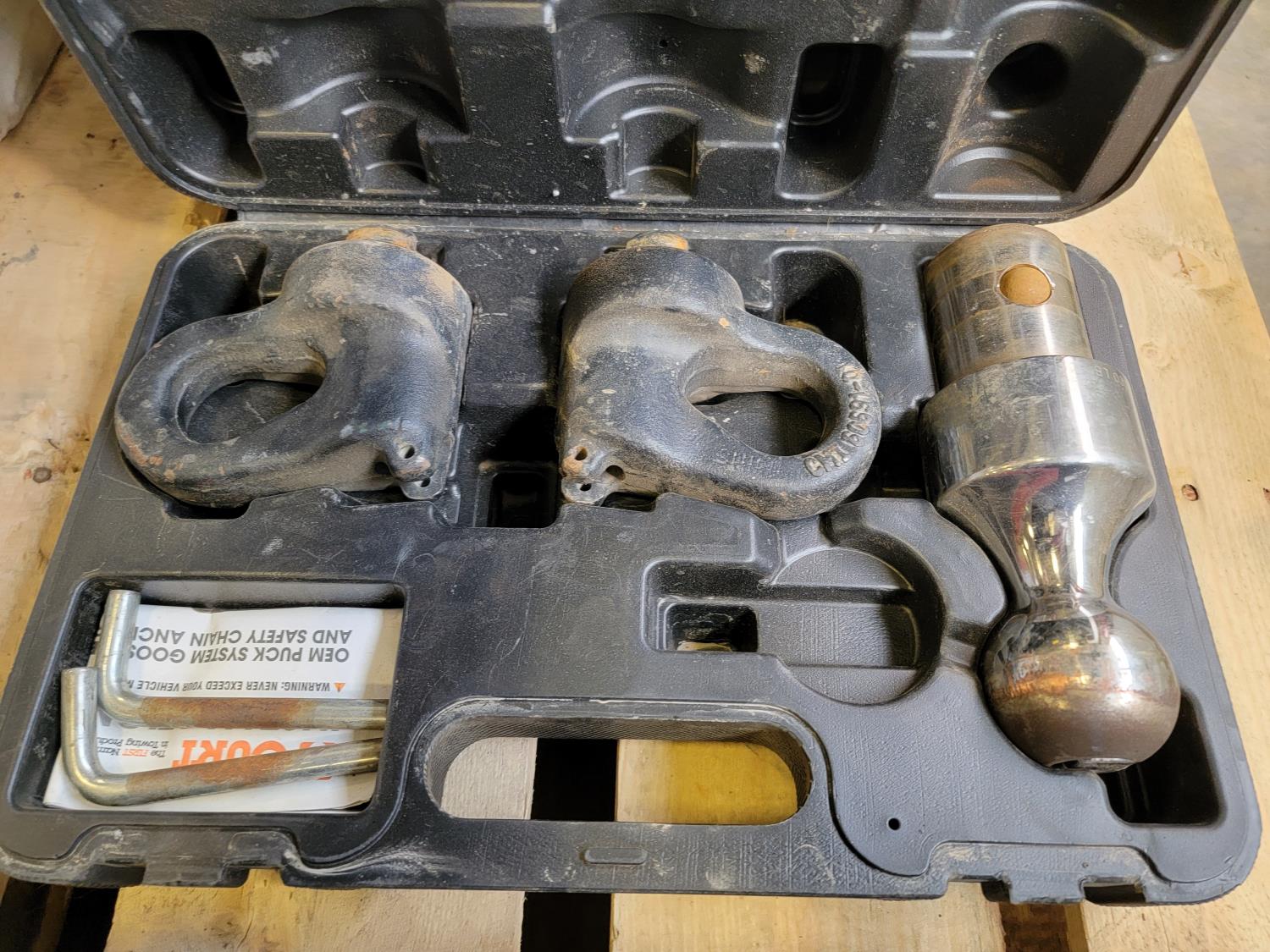 (2) muster point placards, propane torch, Curt puck system gooseneck ball and safety chain anchor kit, socket set