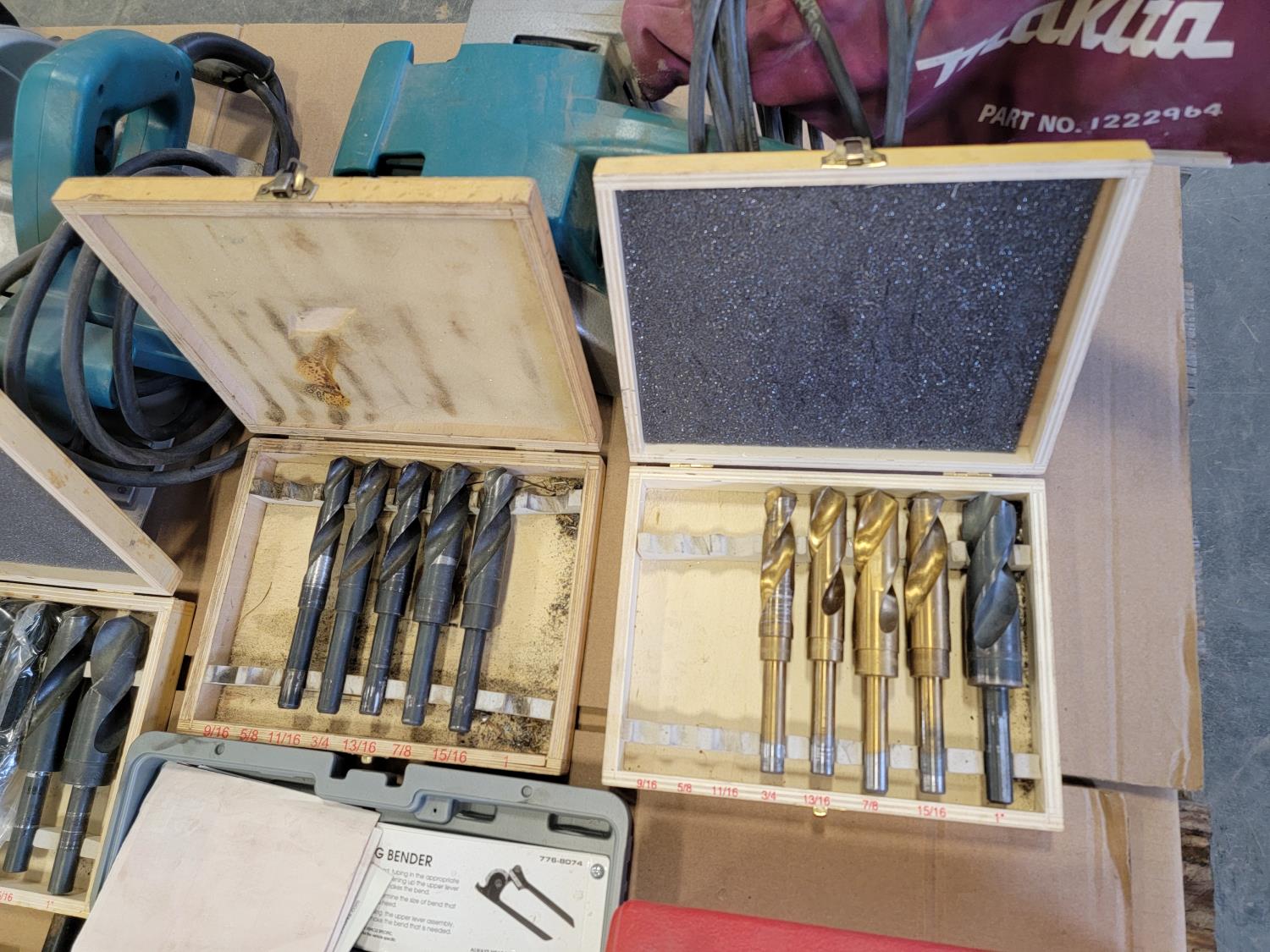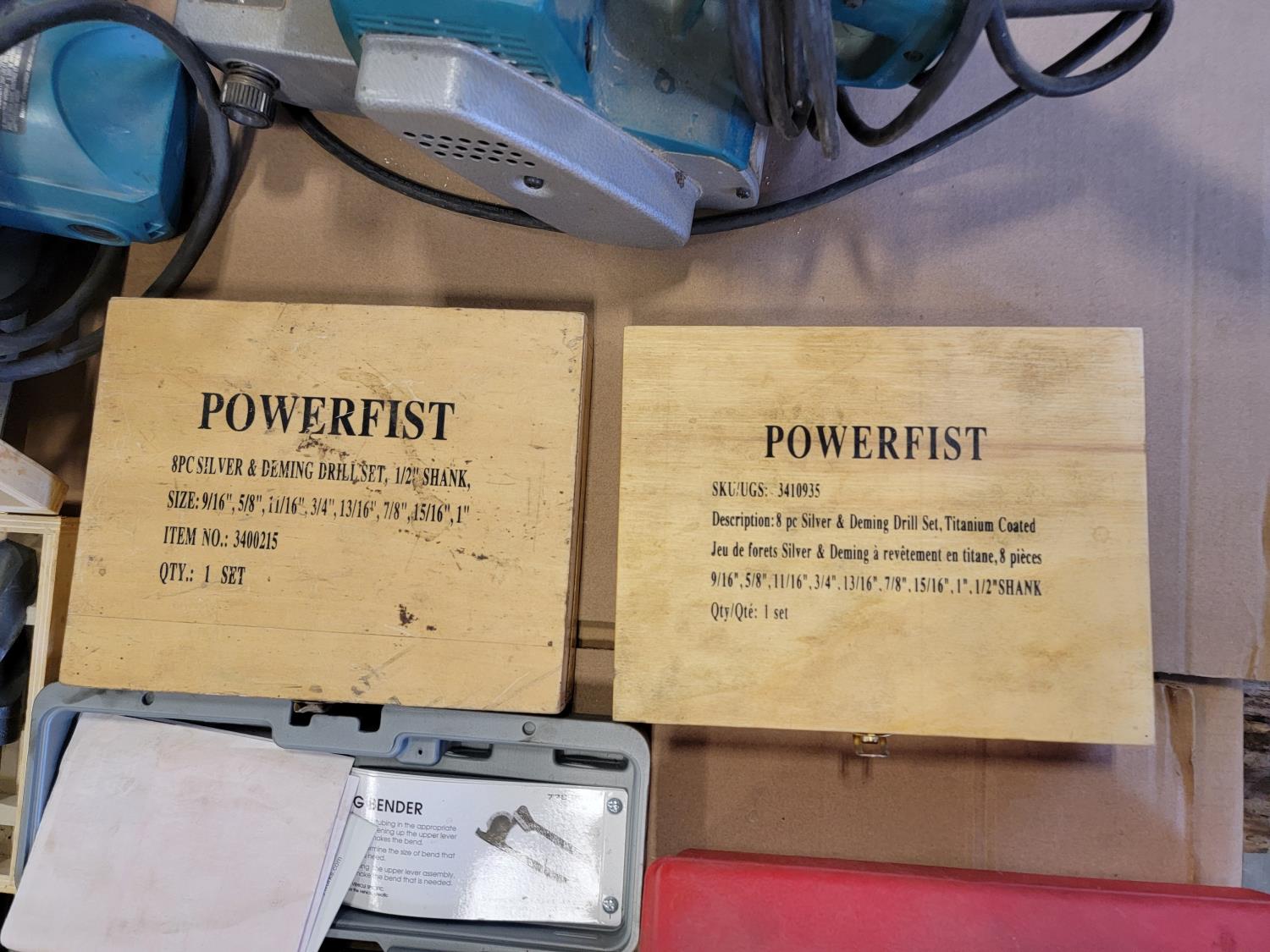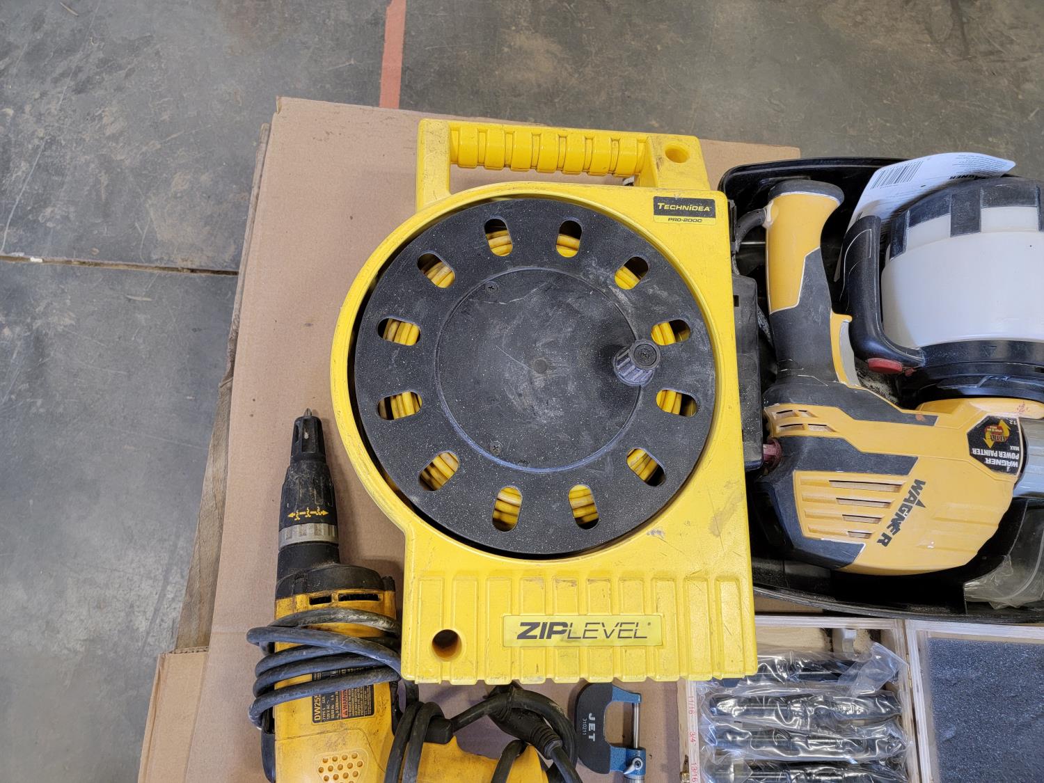 Technidea Pro-2000 Ziplevel altimeter, pipe bender, Proto dial torque wrench, Makita belt sander, Powerfist drill bits