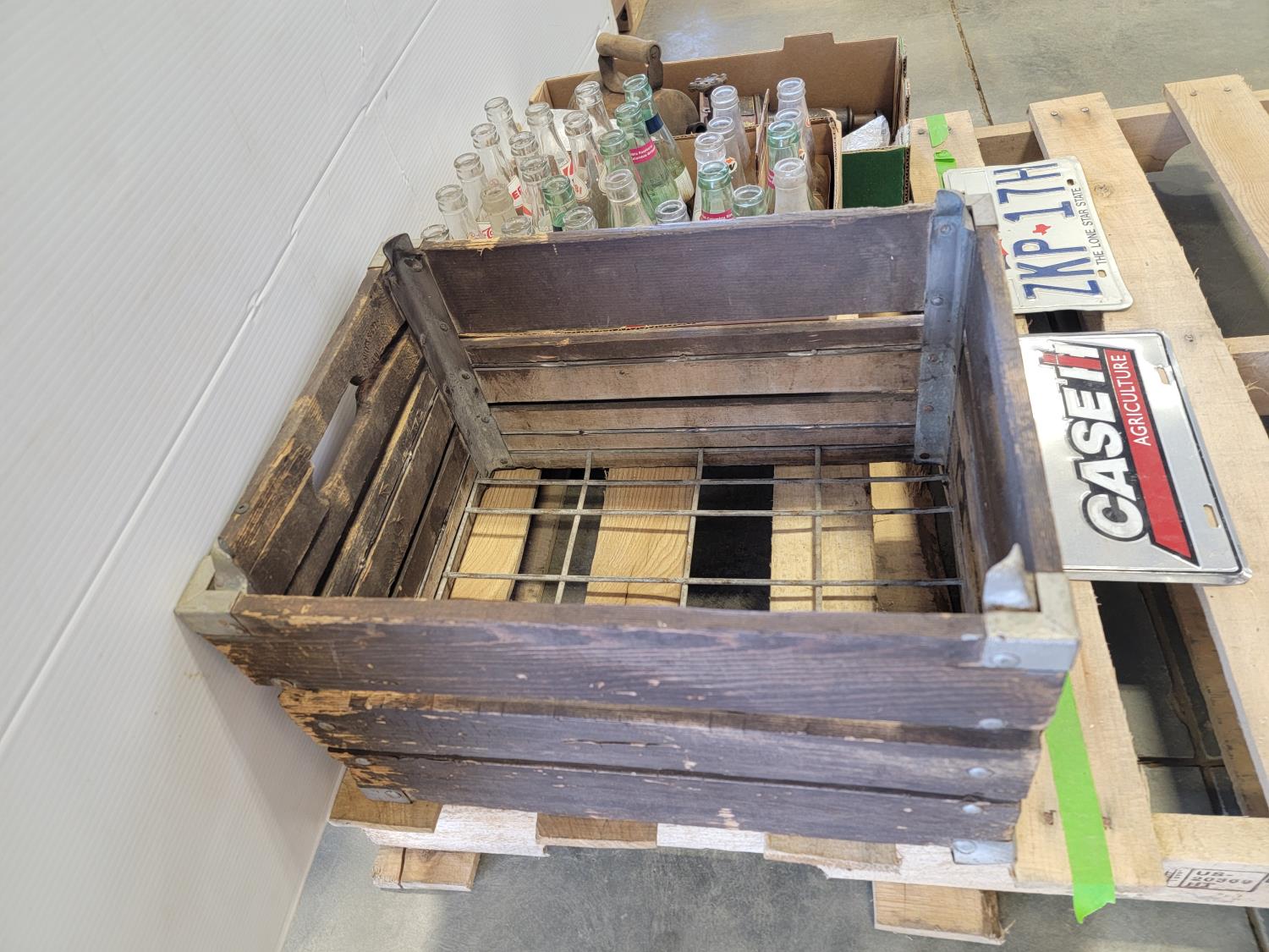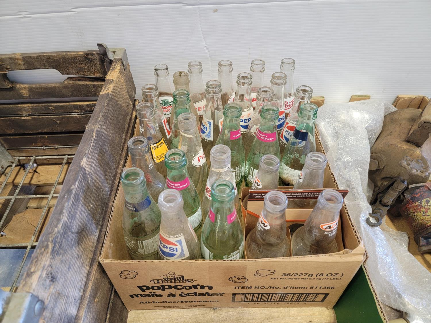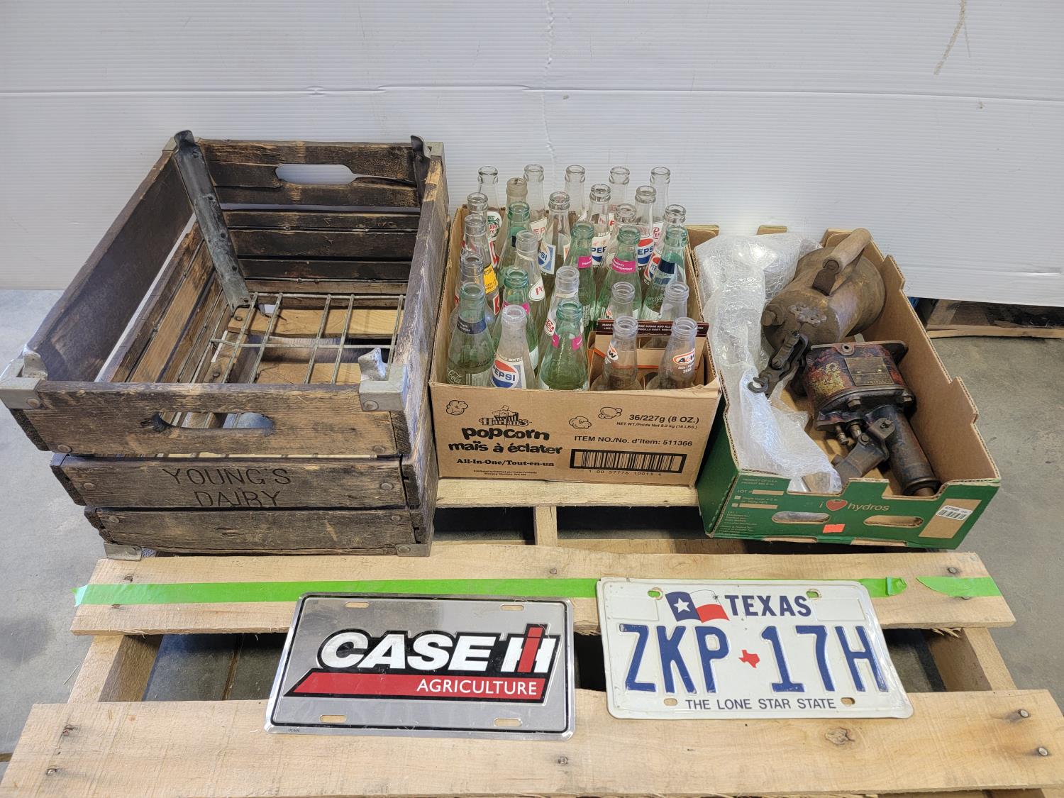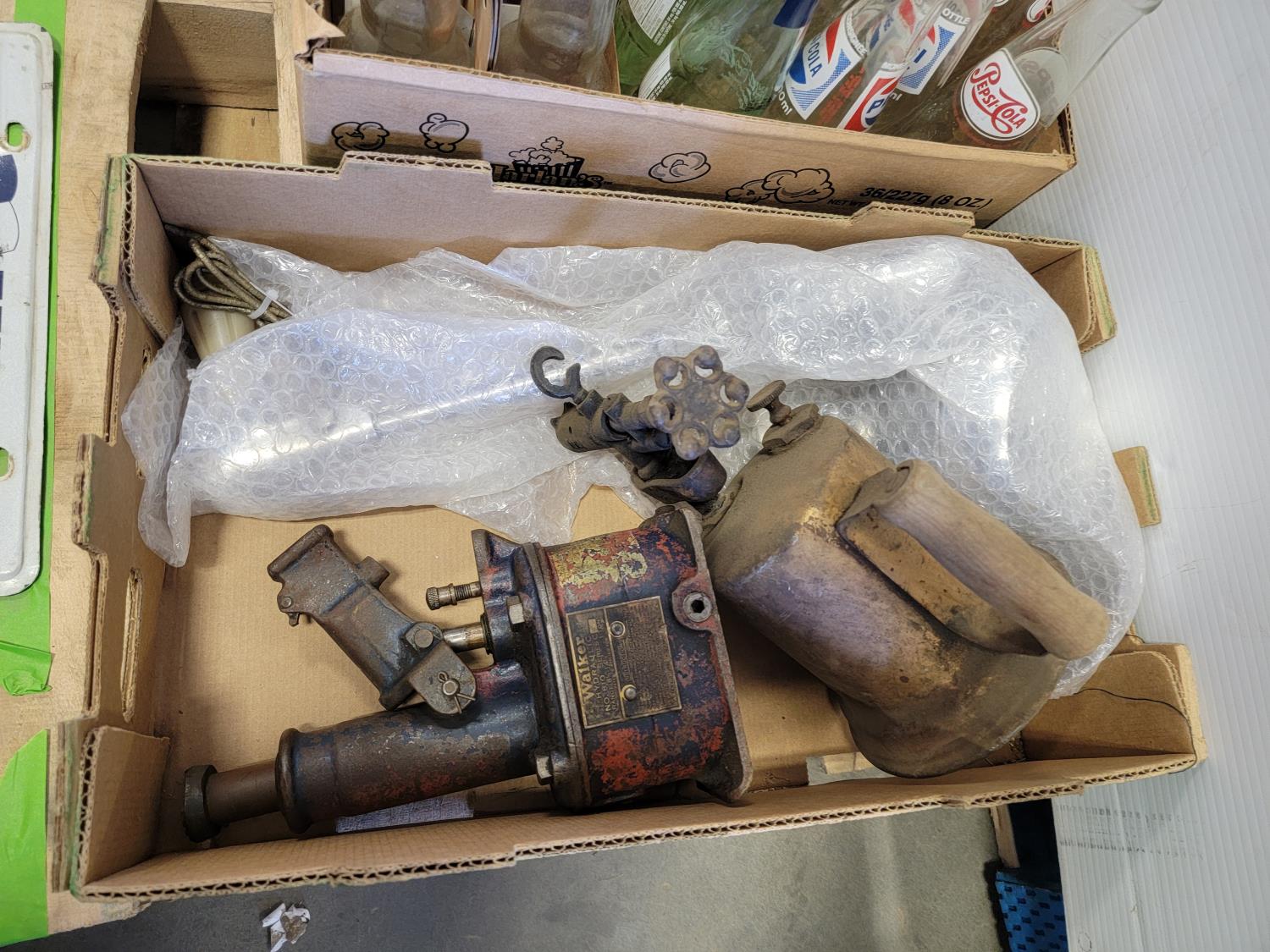 Glass bottles, Young's Dairy box 18 inch x 14 inch x 10 inch, Walker hydraulic jack, blow torch