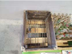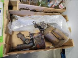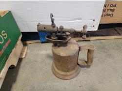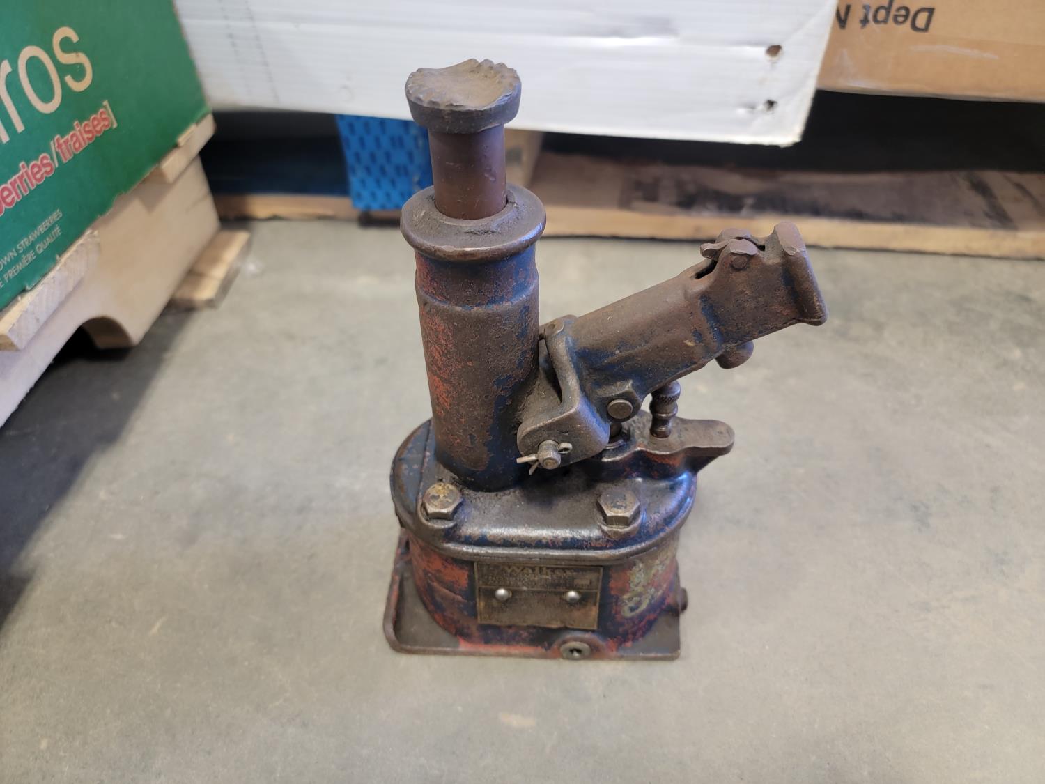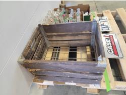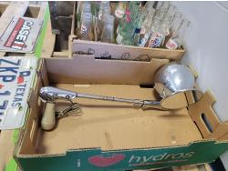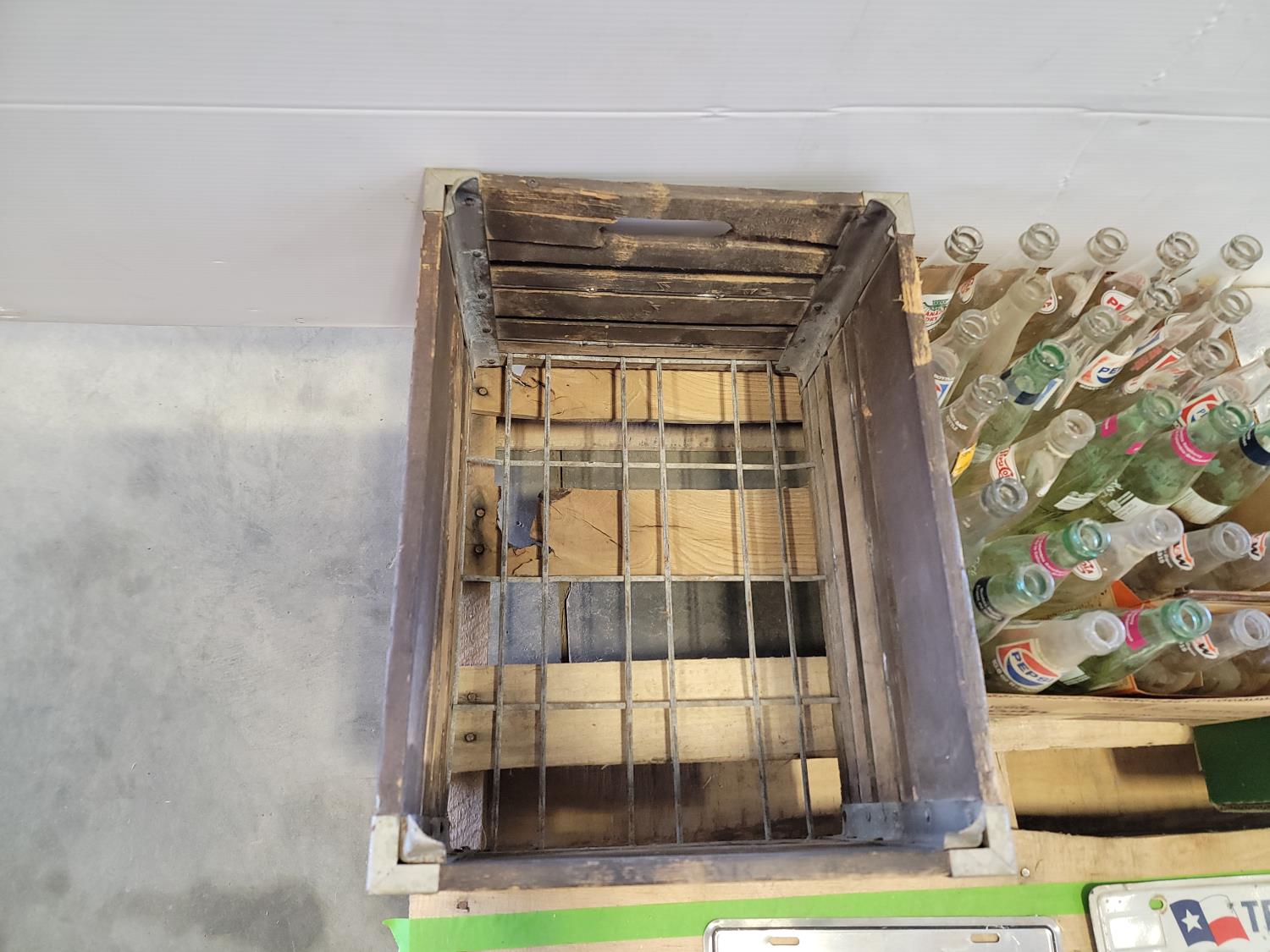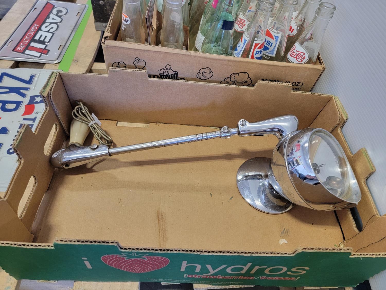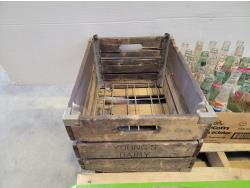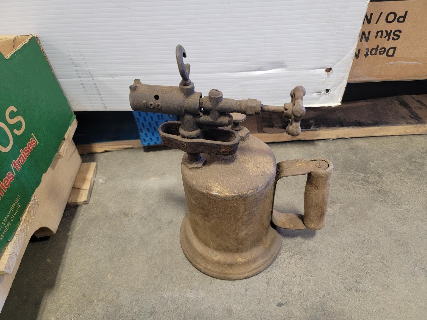 Glass bottles, Young's Dairy box 18 inch x 14 inch x 10 inch, Walker hydraulic jack, blow torch