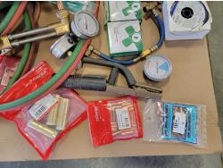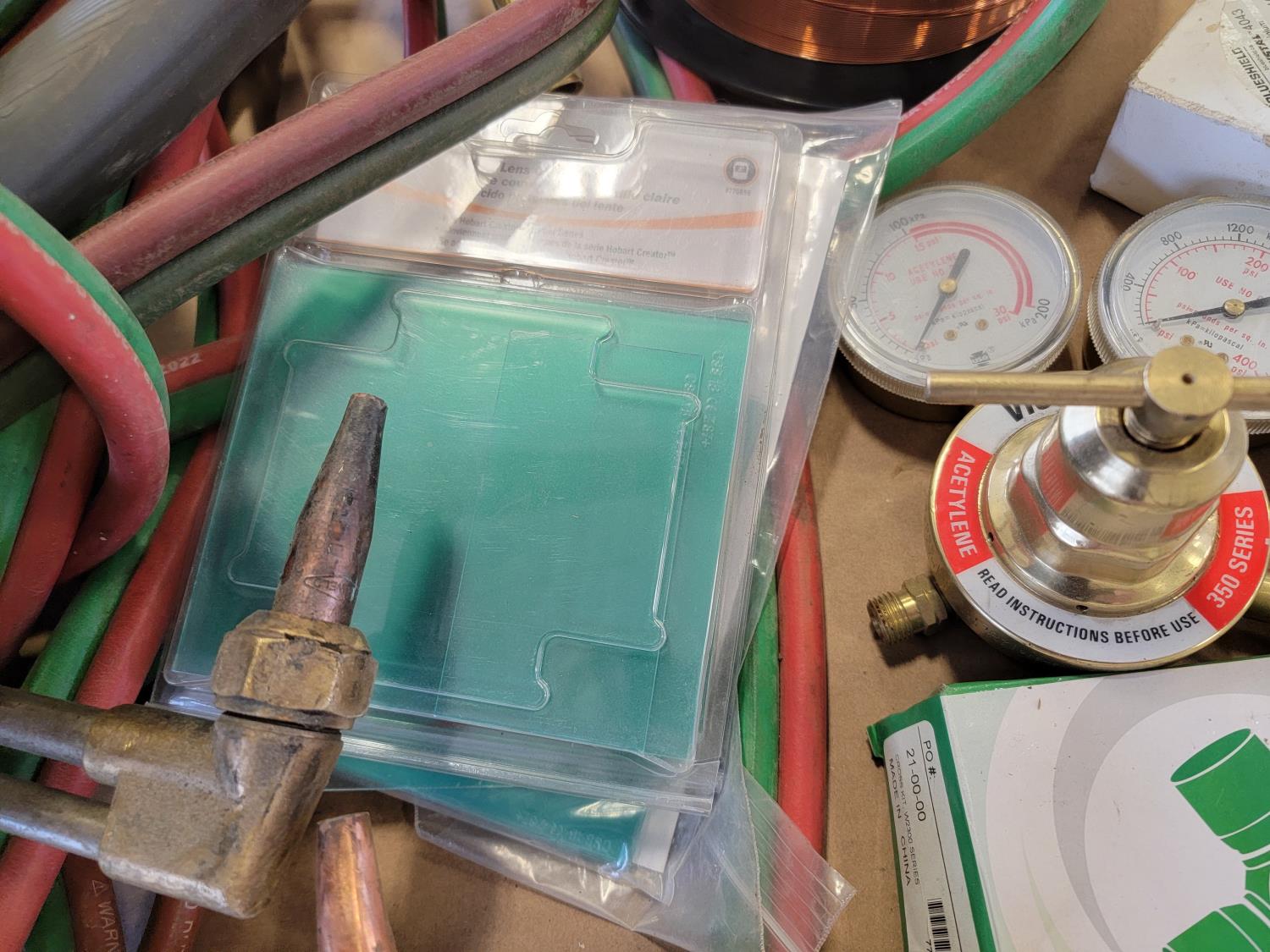 Welding helmet, wire, nozzles, lenses, oxygen/acetylene hoses and gauges