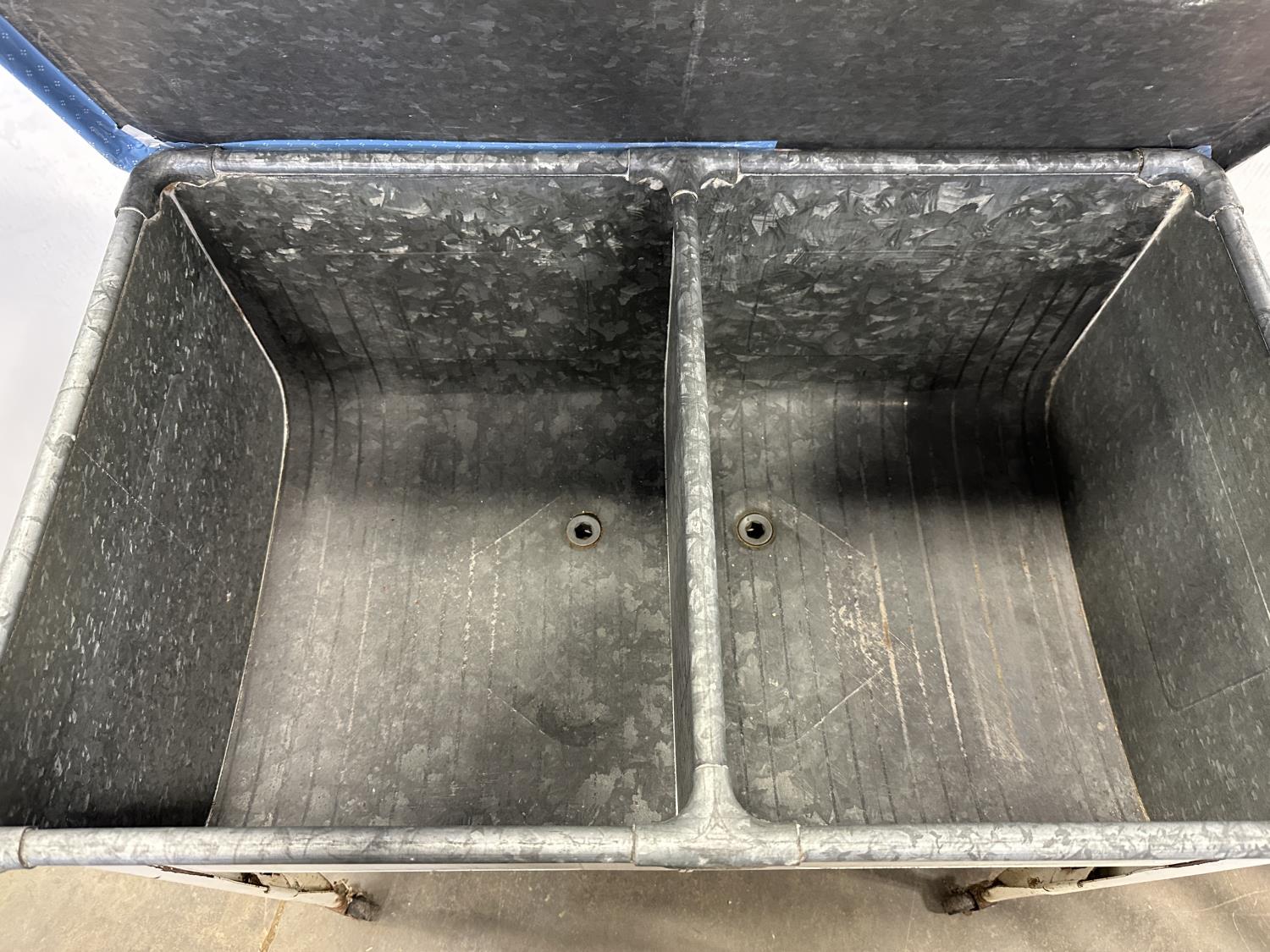 5347 Vintage Galvanized Double Wash Basin, Folding Rolling Bench and Trash Can