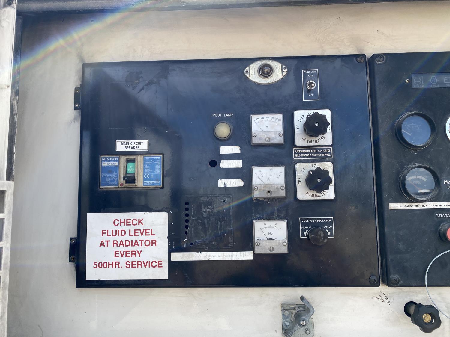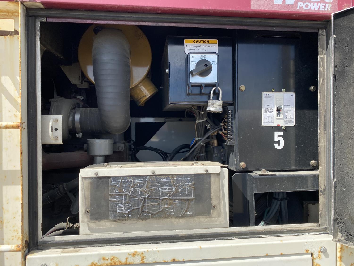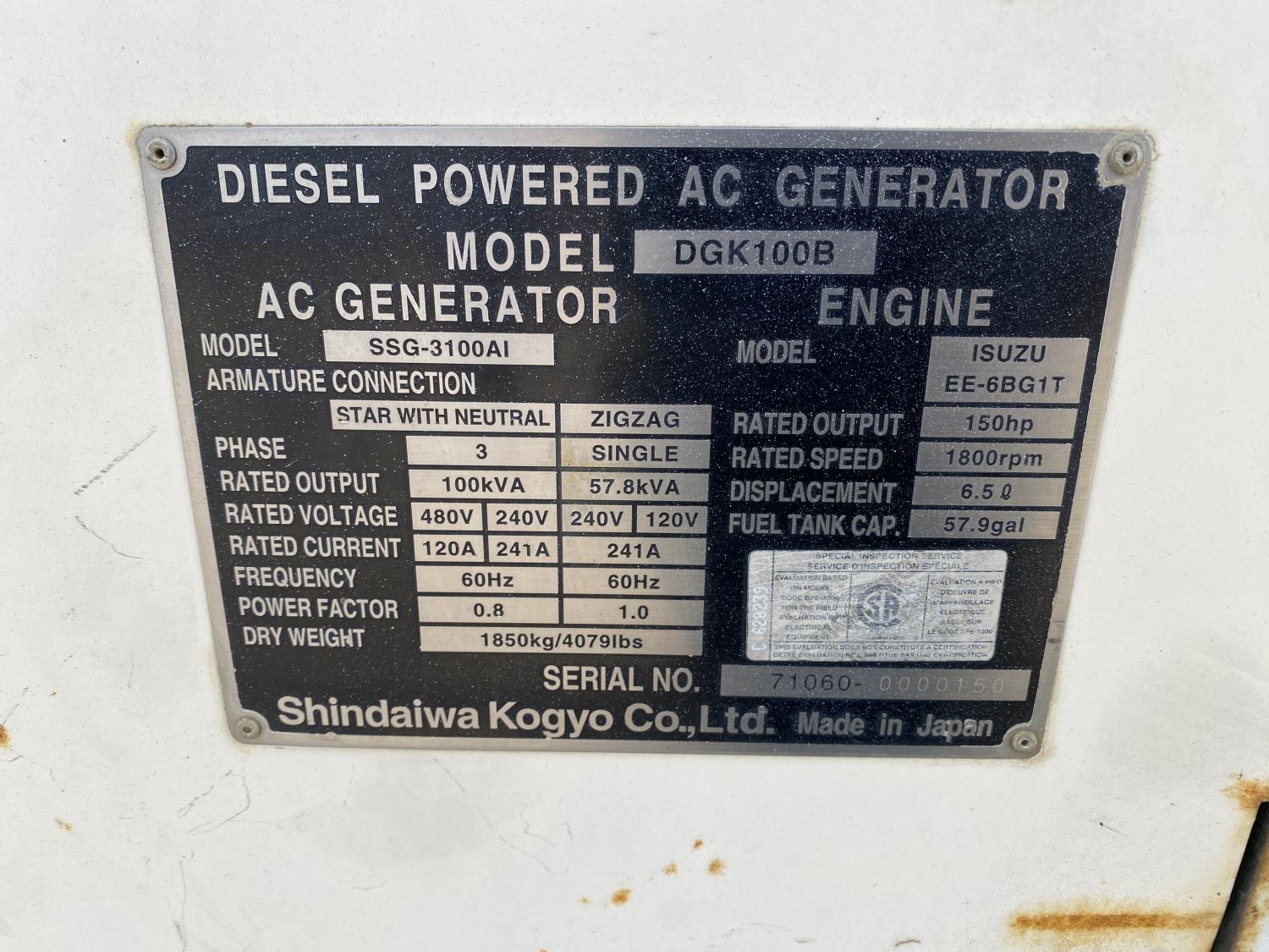 Isuzu EE-6BG1T 150 HP diesel engine, 480/240 3 phase, 240/120 single phase, pintle hitch, spring suspension, 205/75R15 tires