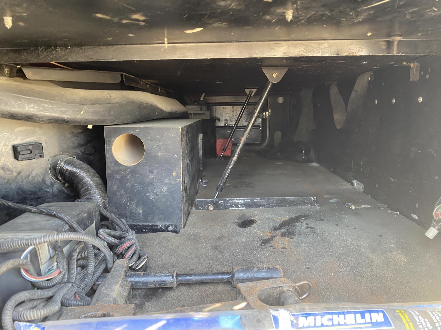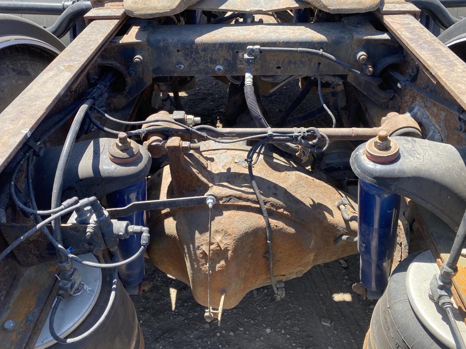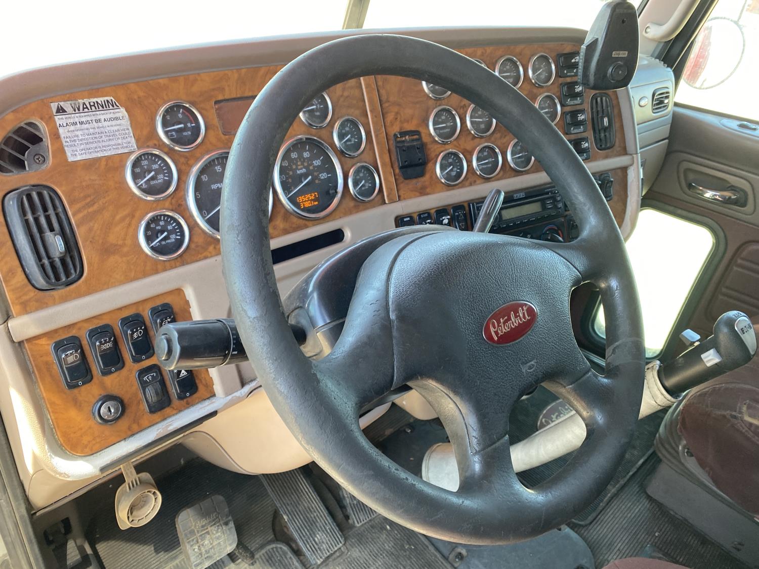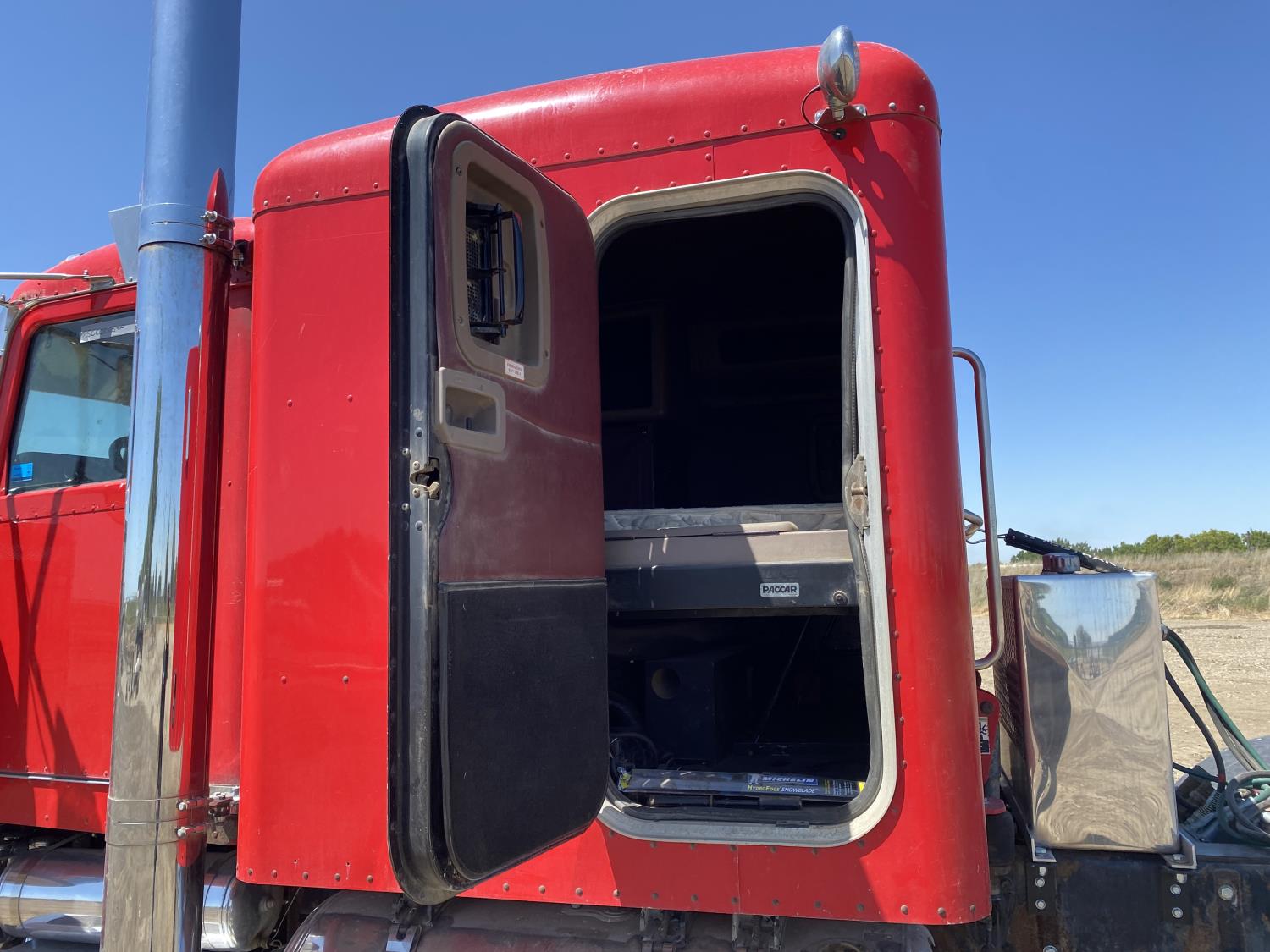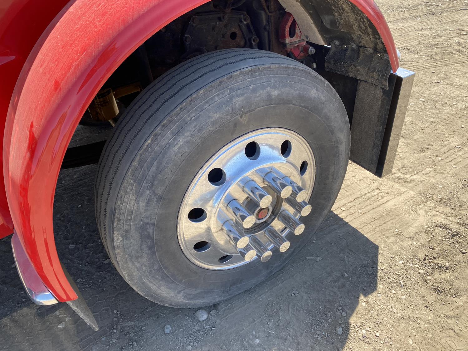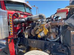 Caterpillar C15 6 cylinder engine, engine block heater, Eaton Fuller 18 speed manual transmission, flat top 60 inch sleeper, A/C, cruise control, air ride seats, hydraulic wet kit, air ride cab, PTO pump, Peterbilt air ride suspension, 14,320 lb front axle, 46,000 lb rear axles, full lockers, 242 inch WB, all aluminum wheels, 11R24.5 tires