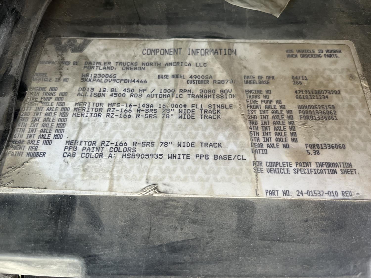 Detroit DD13 12.8 L 6 cylinder 525 HP engine, DEF deleted, Allison automatic transmission, A/C, cruise control, air ride driver seat, air ride cab, PTO pump, Airliner air ride suspension, 16,000 lb front axle, 69,000 lb rear axles, full lockers, 5.38 ratio, 266 inch WB, 312 inch from back of cab to end of frame, 385/65R22.5 front tires, 11R22.5 rear tires