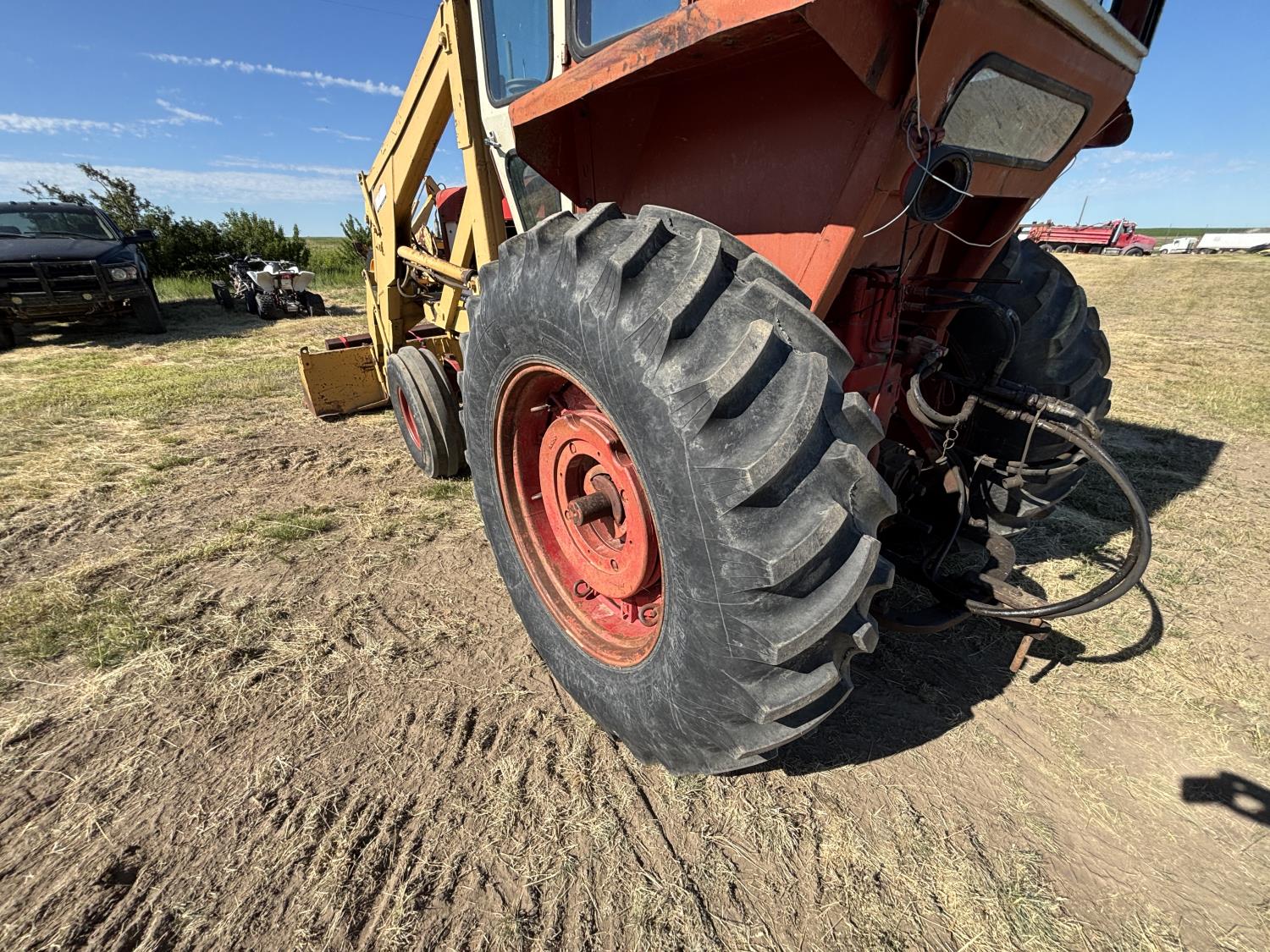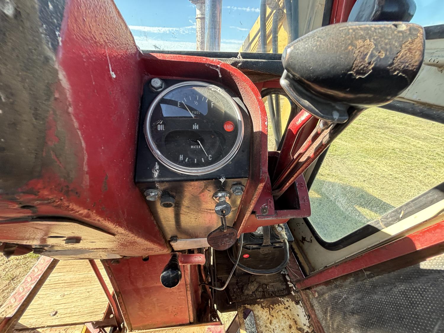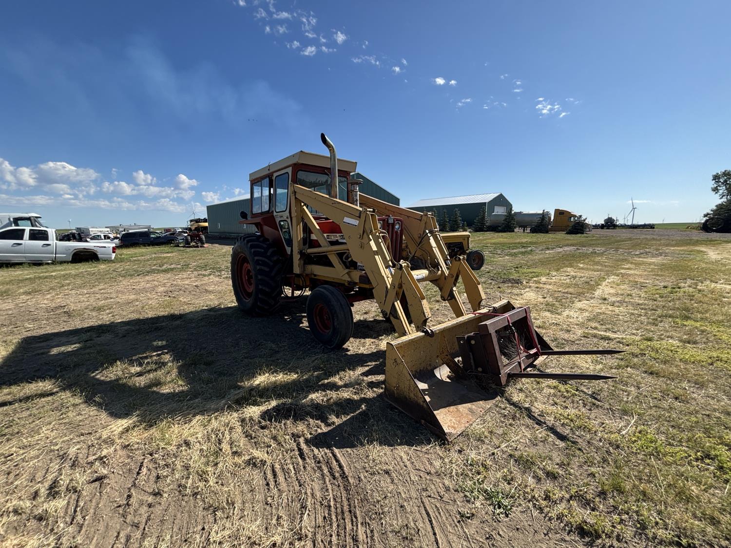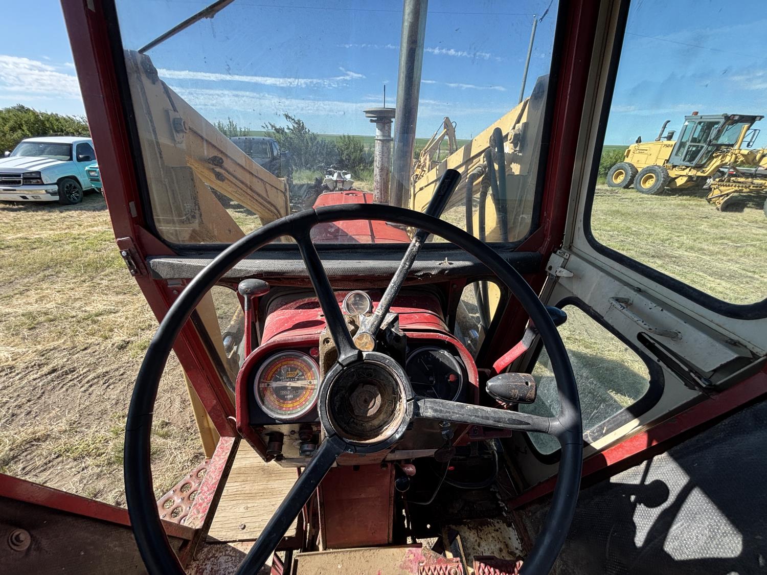 Ezee-On loader, 96 inch bucket, 34 inch bale forks,International 5.9 L 6 cylinder 105 HP, diesel engine, 94 PTO HP, 8 speed manual transmission, cab, 540/1000 PTO, 2 rear hydraulic outlets, rear wheel weights, 10.00-16 front tires, 18.4-34 rear tires