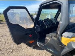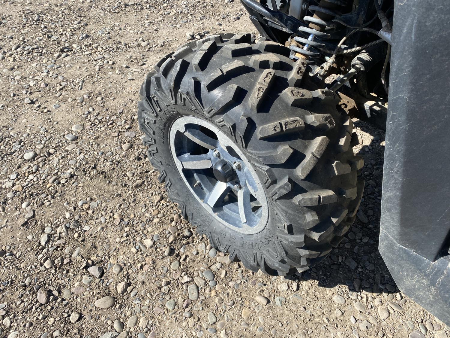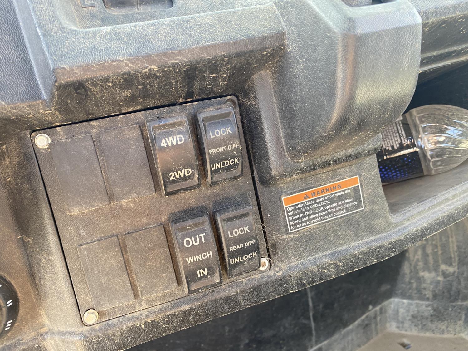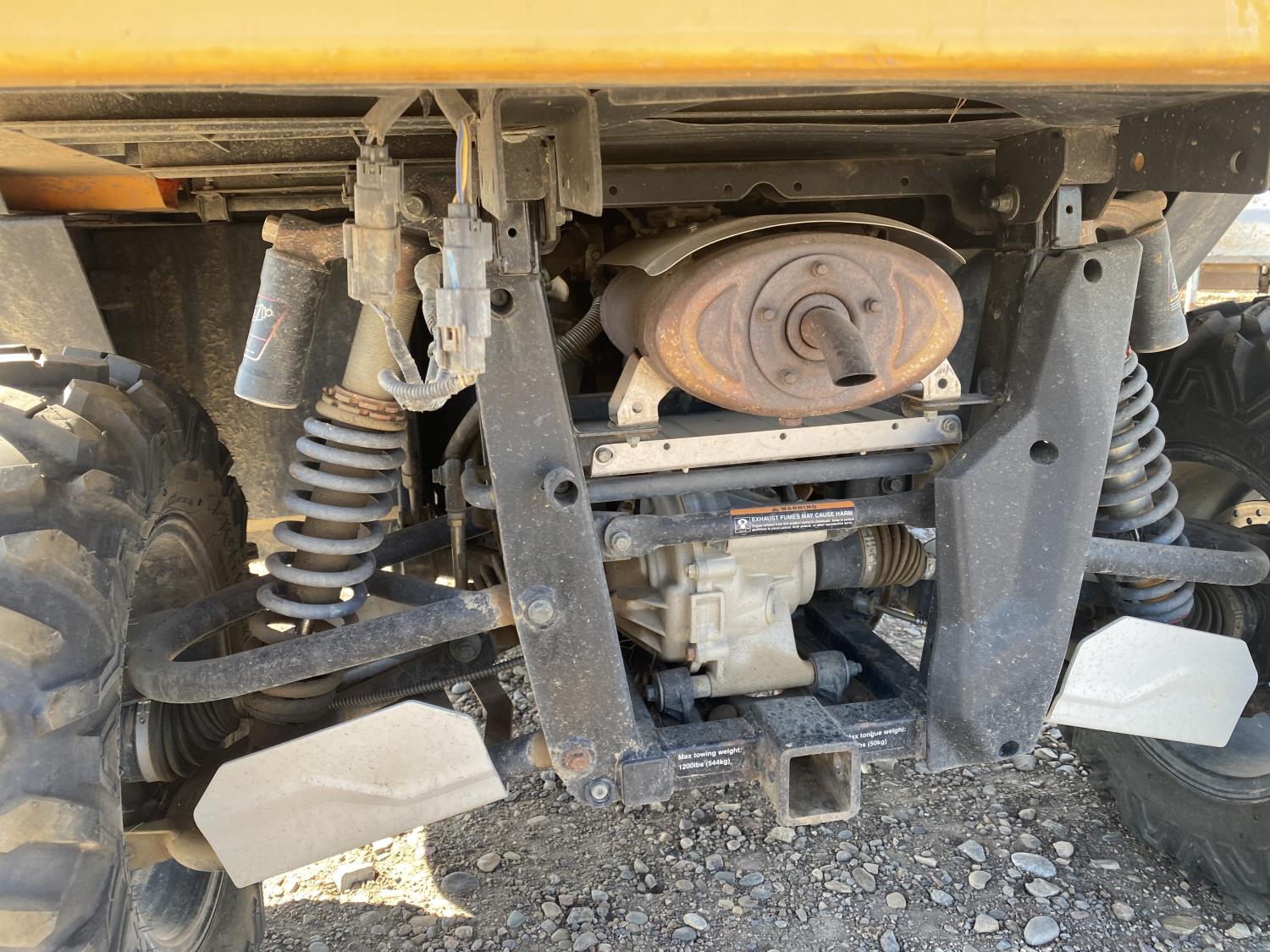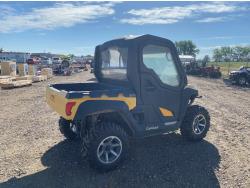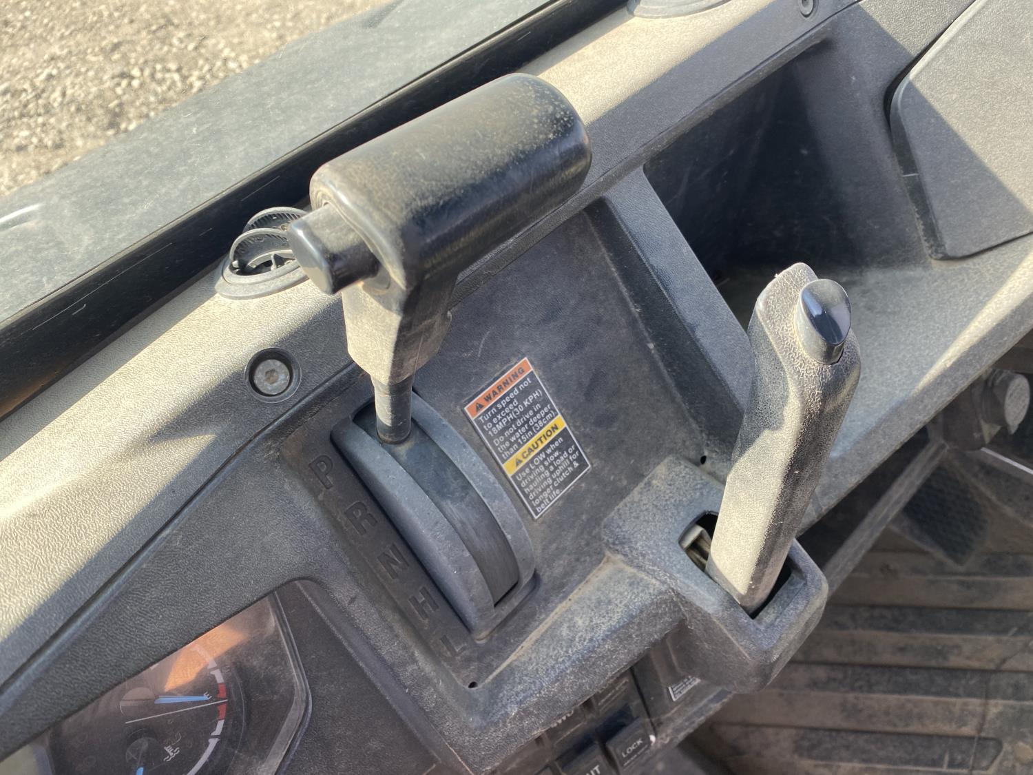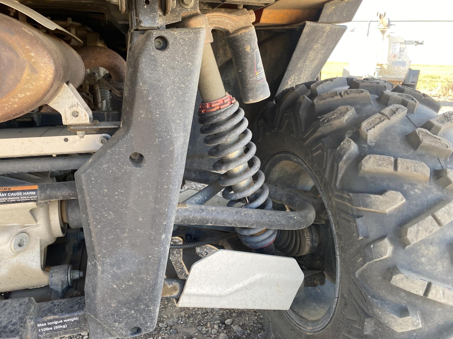 735 cc fuel injected water cooled engine, CVT transmission, Hi/Lo range, reverse, 2 door enclosed cab, 2 passengers, heater, windshield, front winch, manual dump box, receiver hitch, independent suspension, aluminum wheels, 28X11.00R14 tires