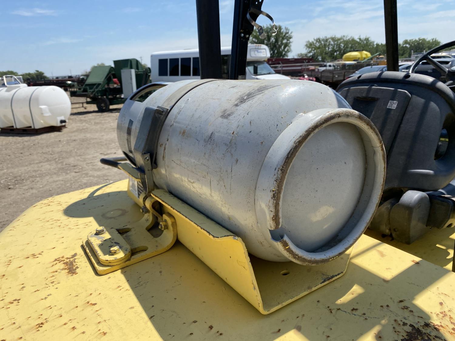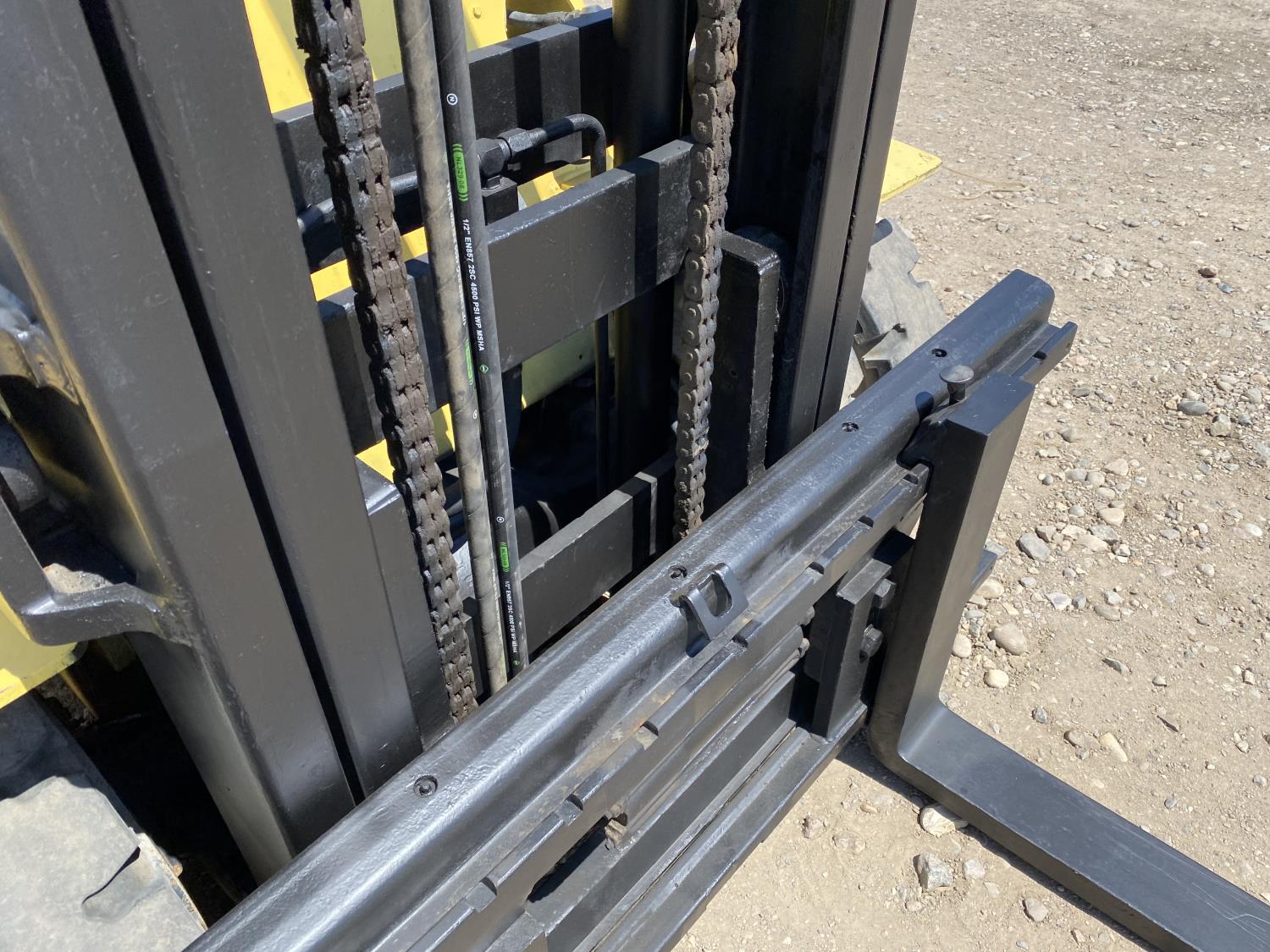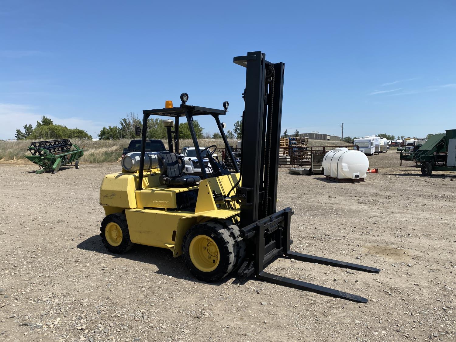 Open station with ROPS, propane, hydro transmission, 9 ft lowered mast height, 14 ft 1 inch max lift height, 2 mast stages, 48 inch pallet forks, side shift, 7-15 front tires, 7-12 rear tires