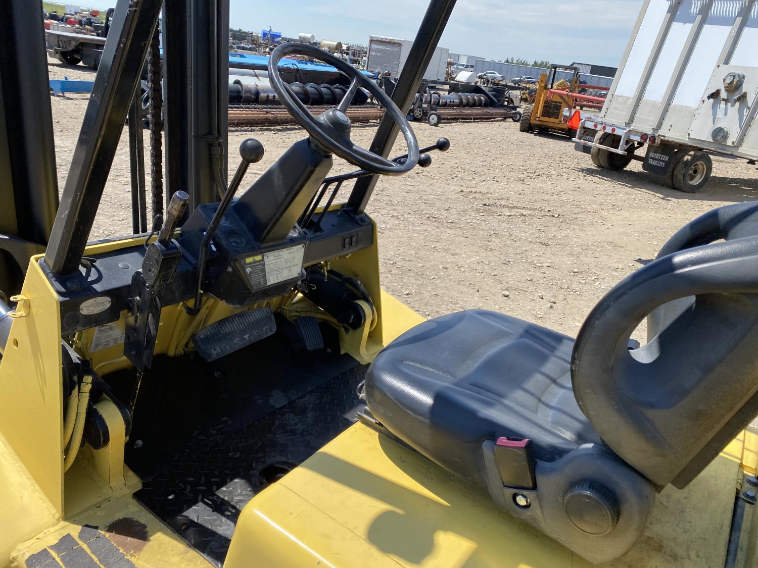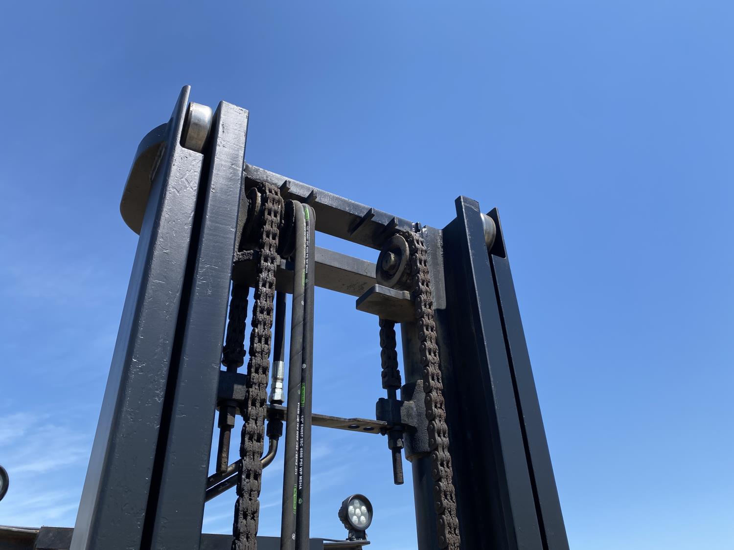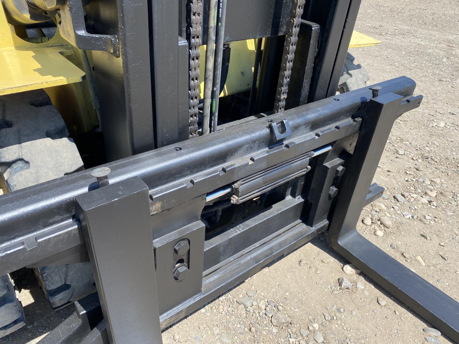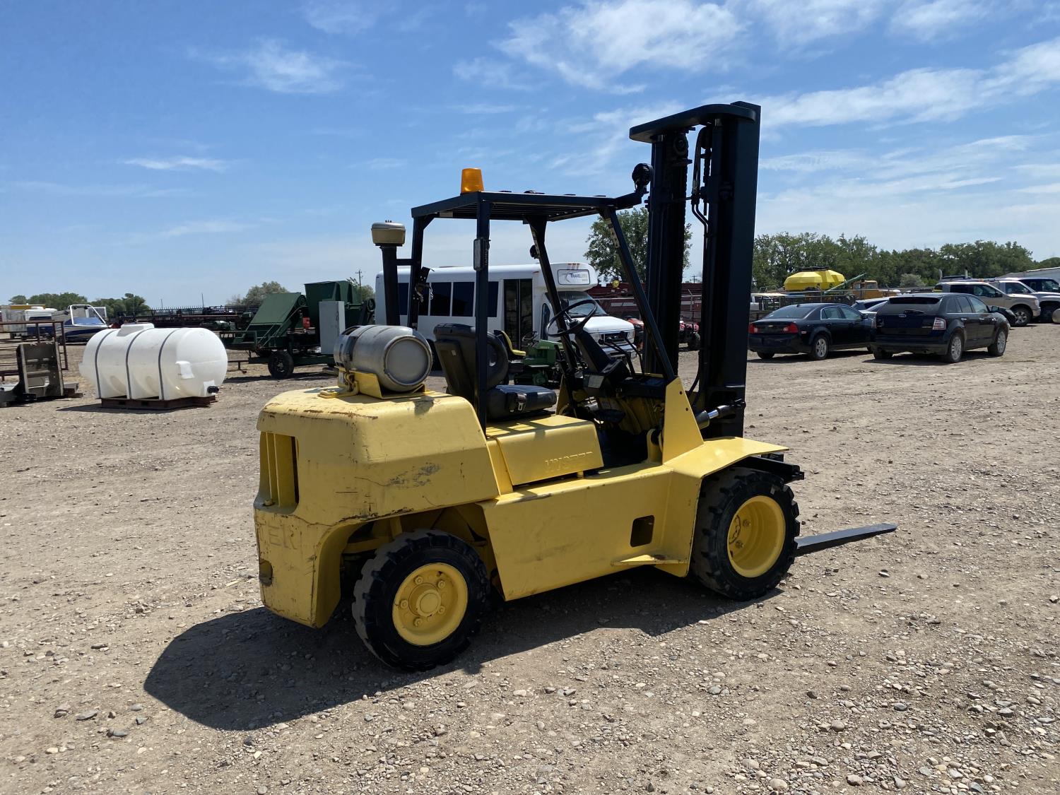 Open station with ROPS, propane, hydro transmission, 9 ft lowered mast height, 14 ft 1 inch max lift height, 2 mast stages, 48 inch pallet forks, side shift, 7-15 front tires, 7-12 rear tires