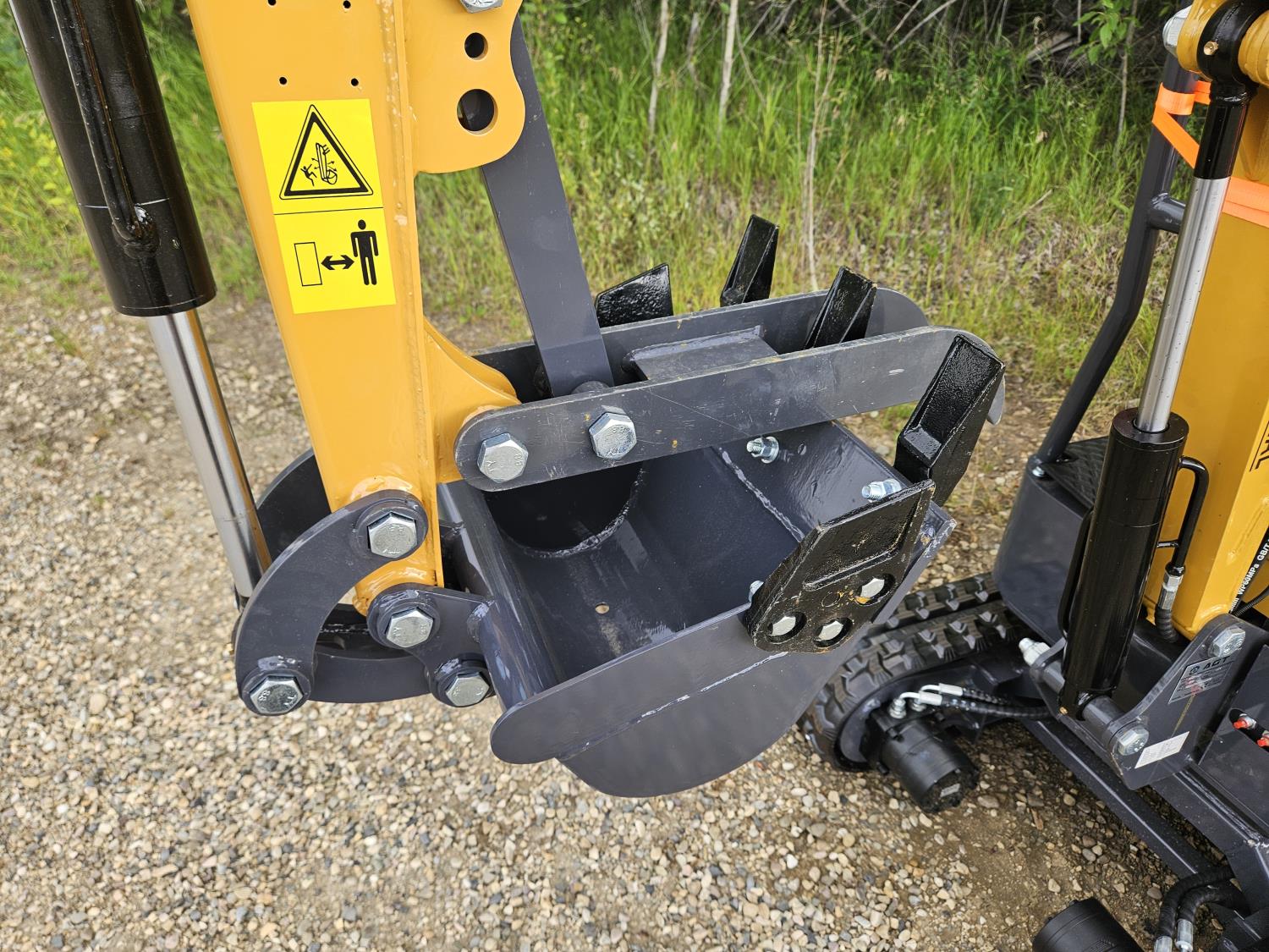 Open station, gas engine, 15 inch dig bucket, manual thumb, 2 Ft 8 inch stick, backfill blade, 7 inch rubber tracks