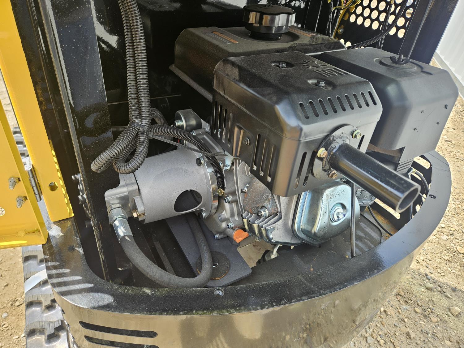 Enclosed cab, gas engine, 15 inch dig bucket, manual thumb, backfill blade, 7 inch rubber tracks