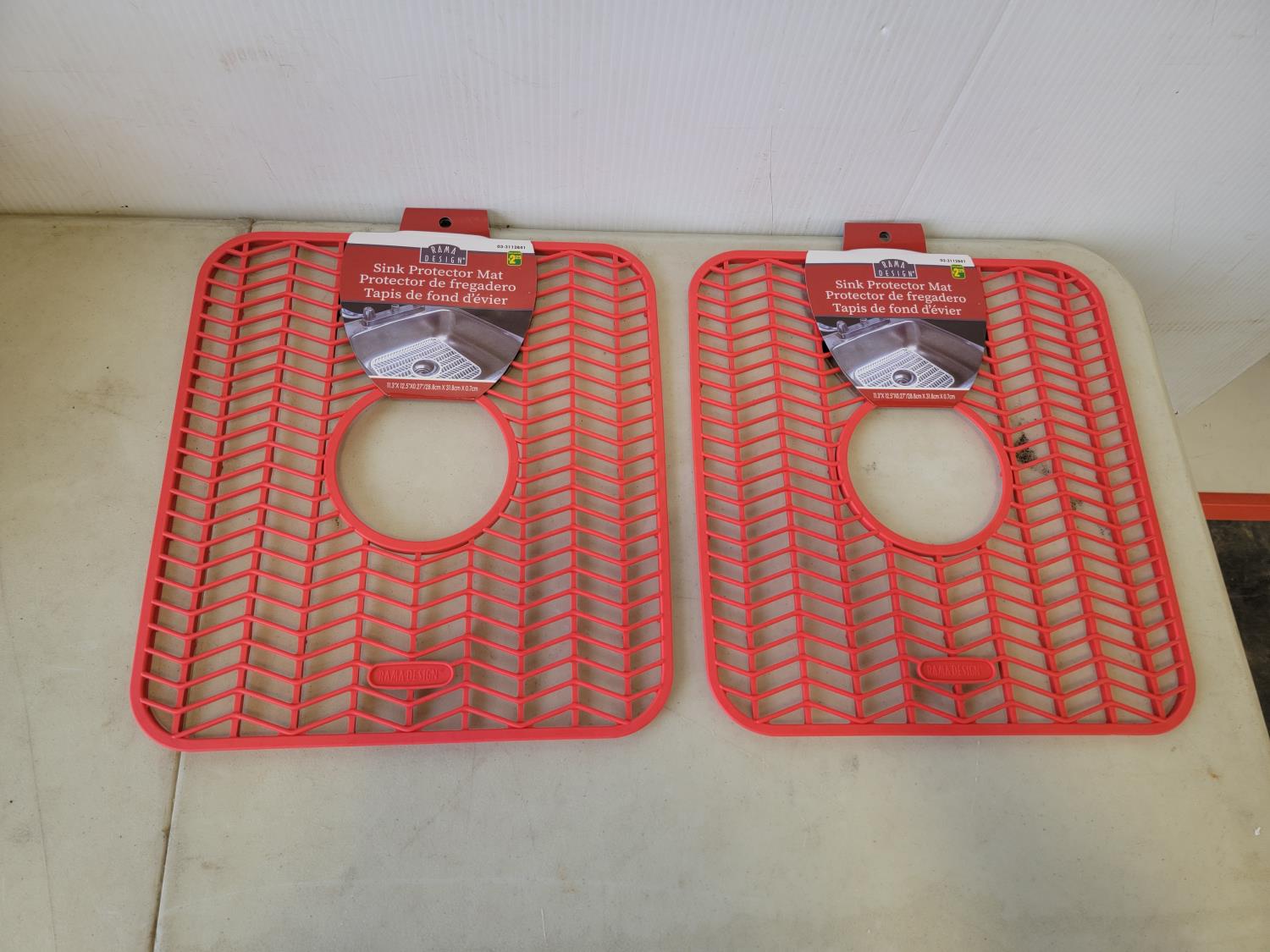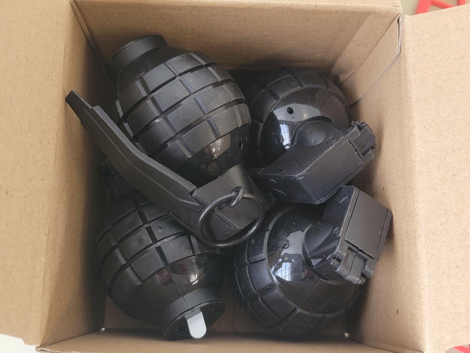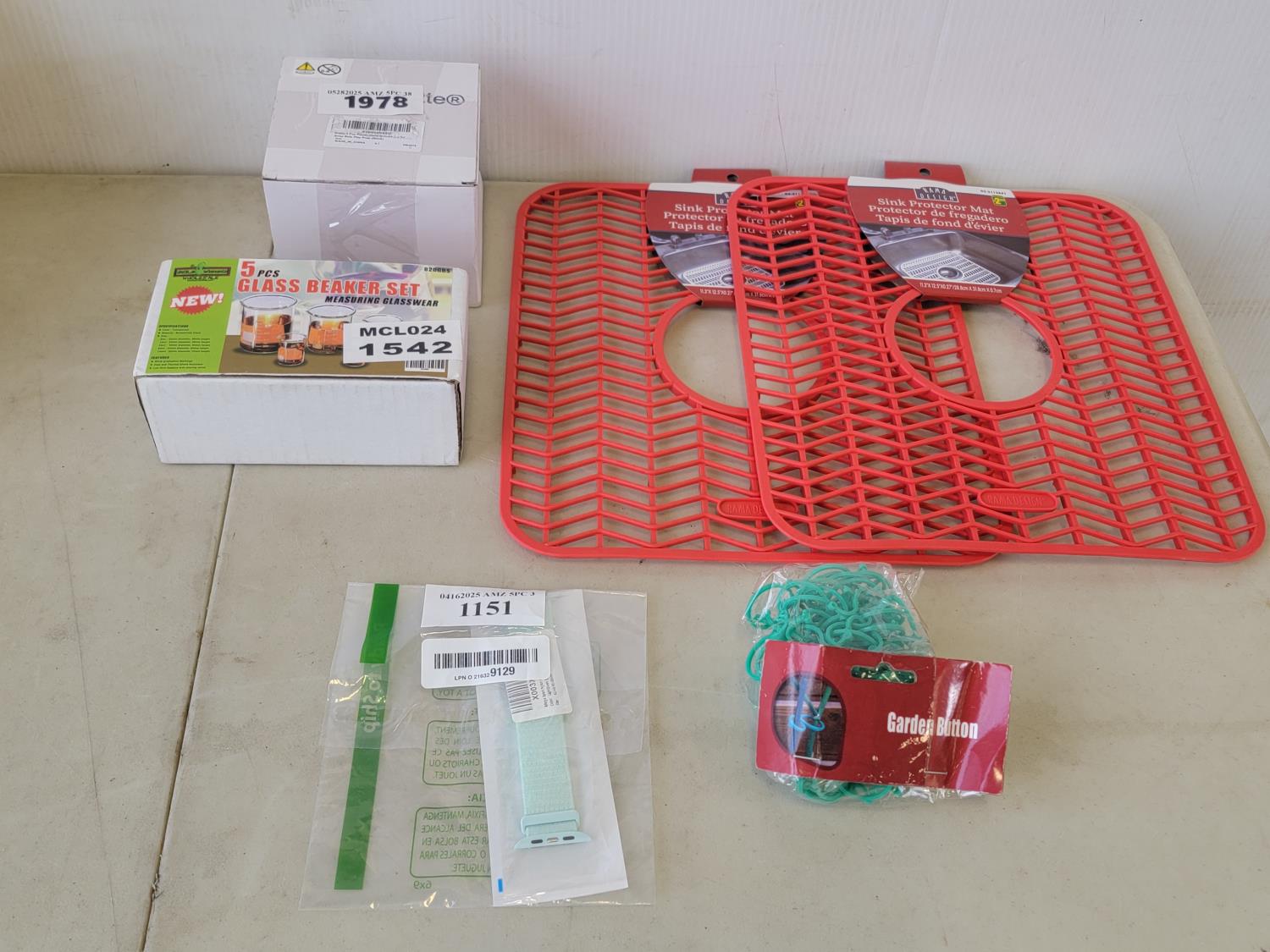 5037 (2) Sink Mats, Garden Buttons, 5 Piece Glass Beaker Set and 4 Piece Toy Grenades
