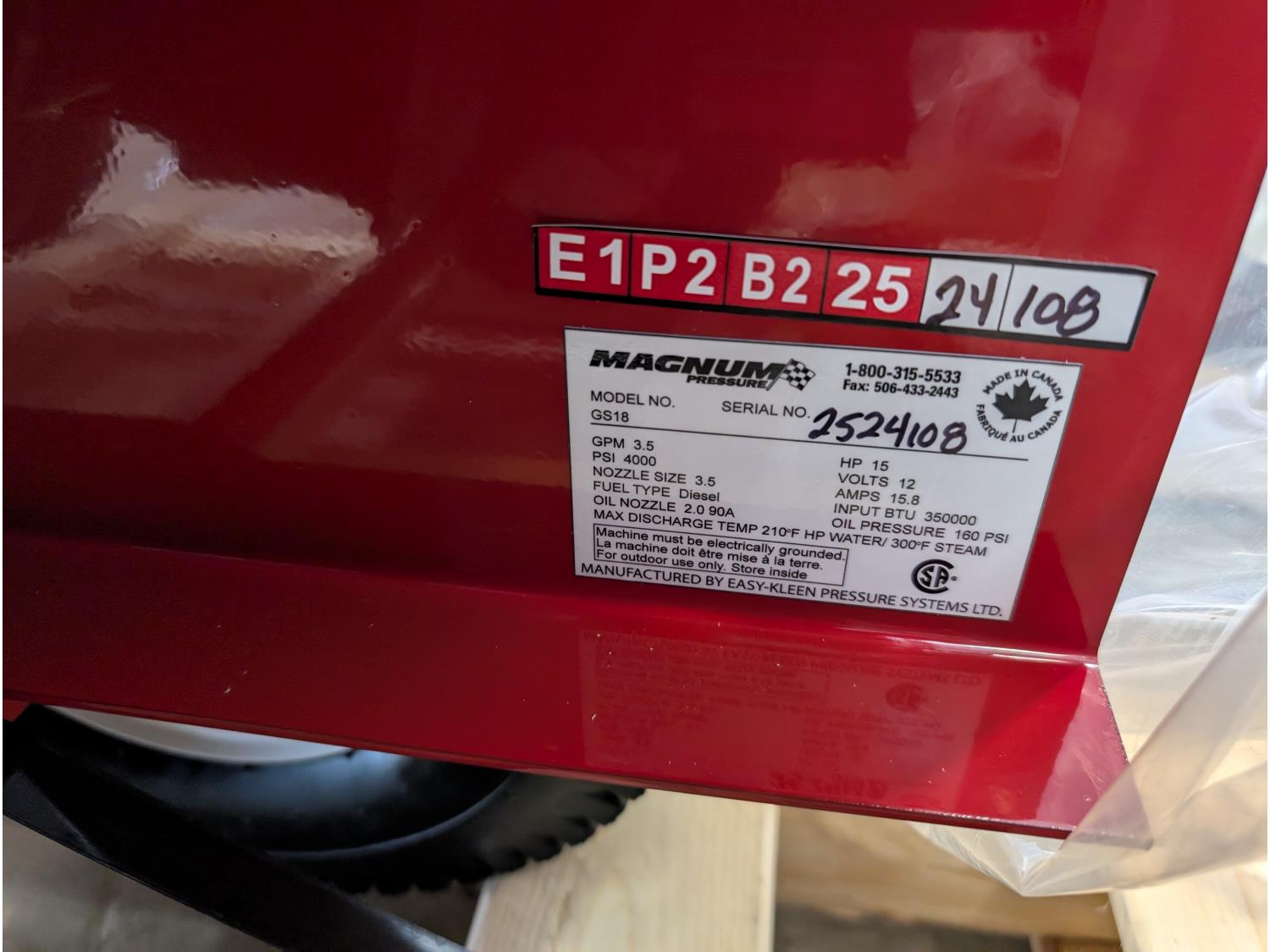 3.5 GPM at 4000 PSI, 15 HP, gasoline engine, electric start, 12 volt burner, oil/diesel fired burned/thermostat, schedule 80 coil with stainless steel housing, fully welded, powder coated frame, 10 gallon poly fuel tank, 30' hose and wand