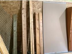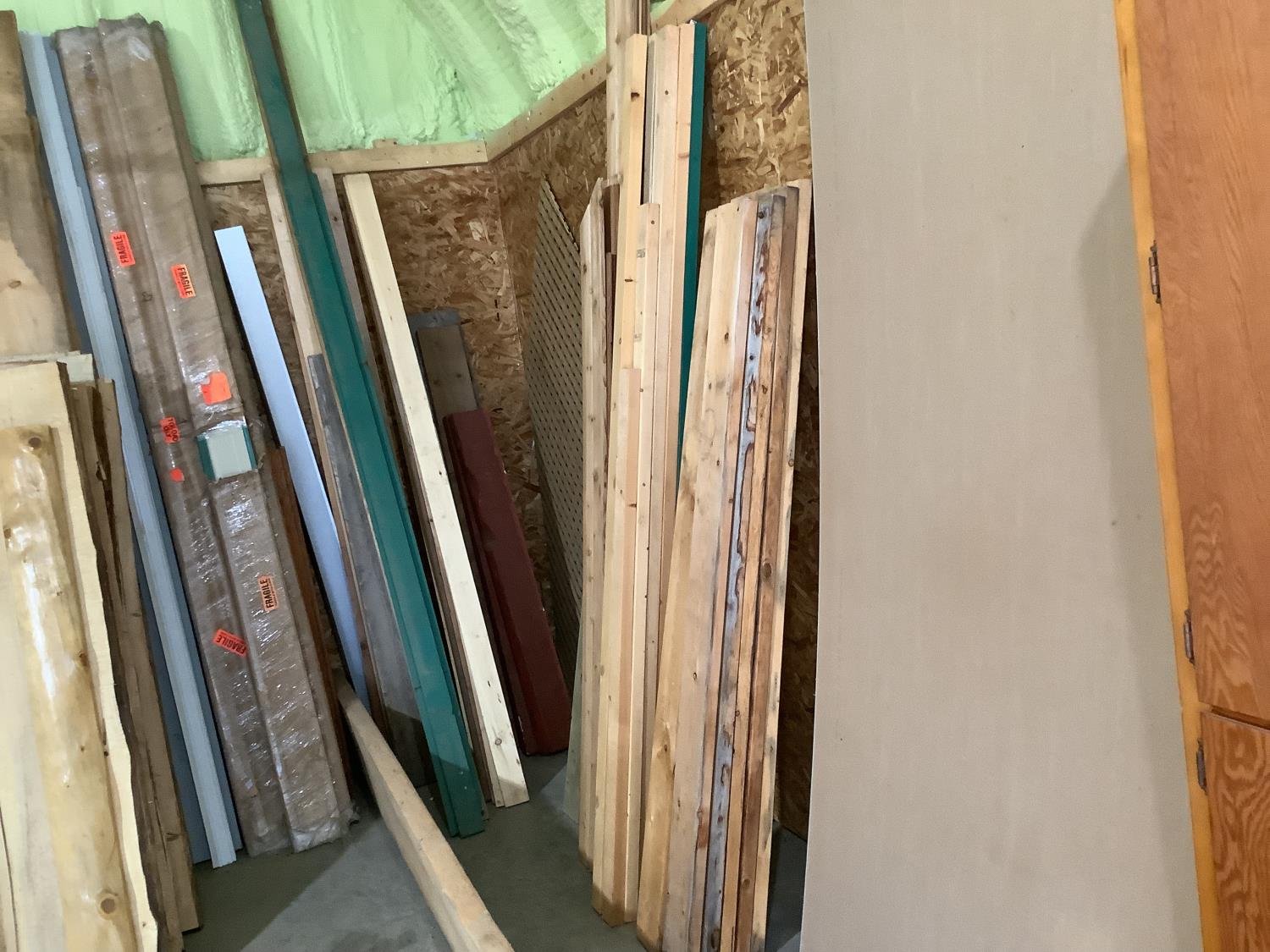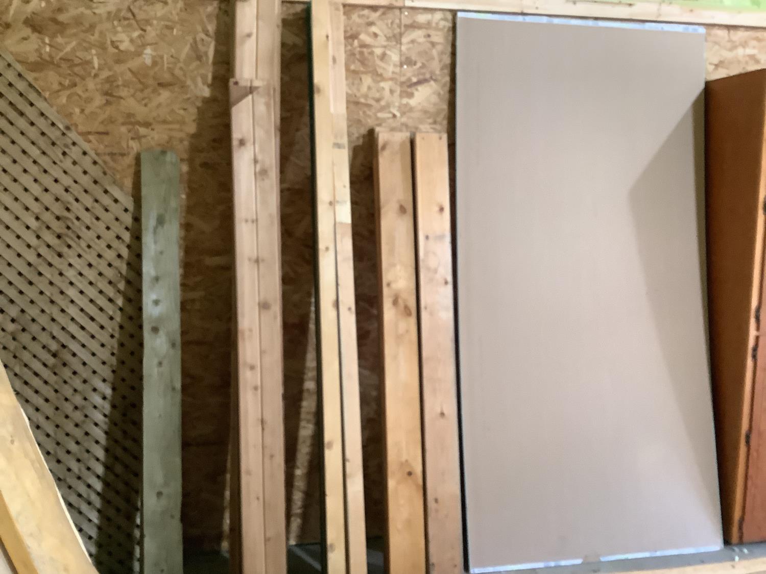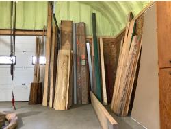 2x3, 1X2, 2X6 rough cut saw mill boards, 1- 2-1/2 X 14 inch x13FT, (2) 4X8 gyp rock sheets, (40) pieces of new forest green 10-FT. X 6- inch metal siding.