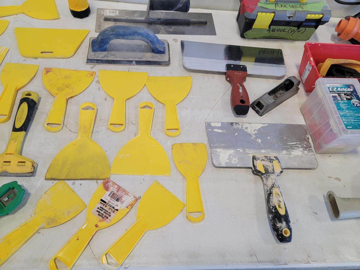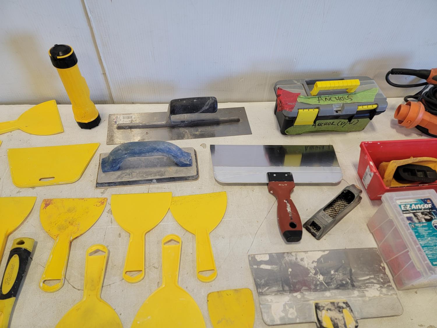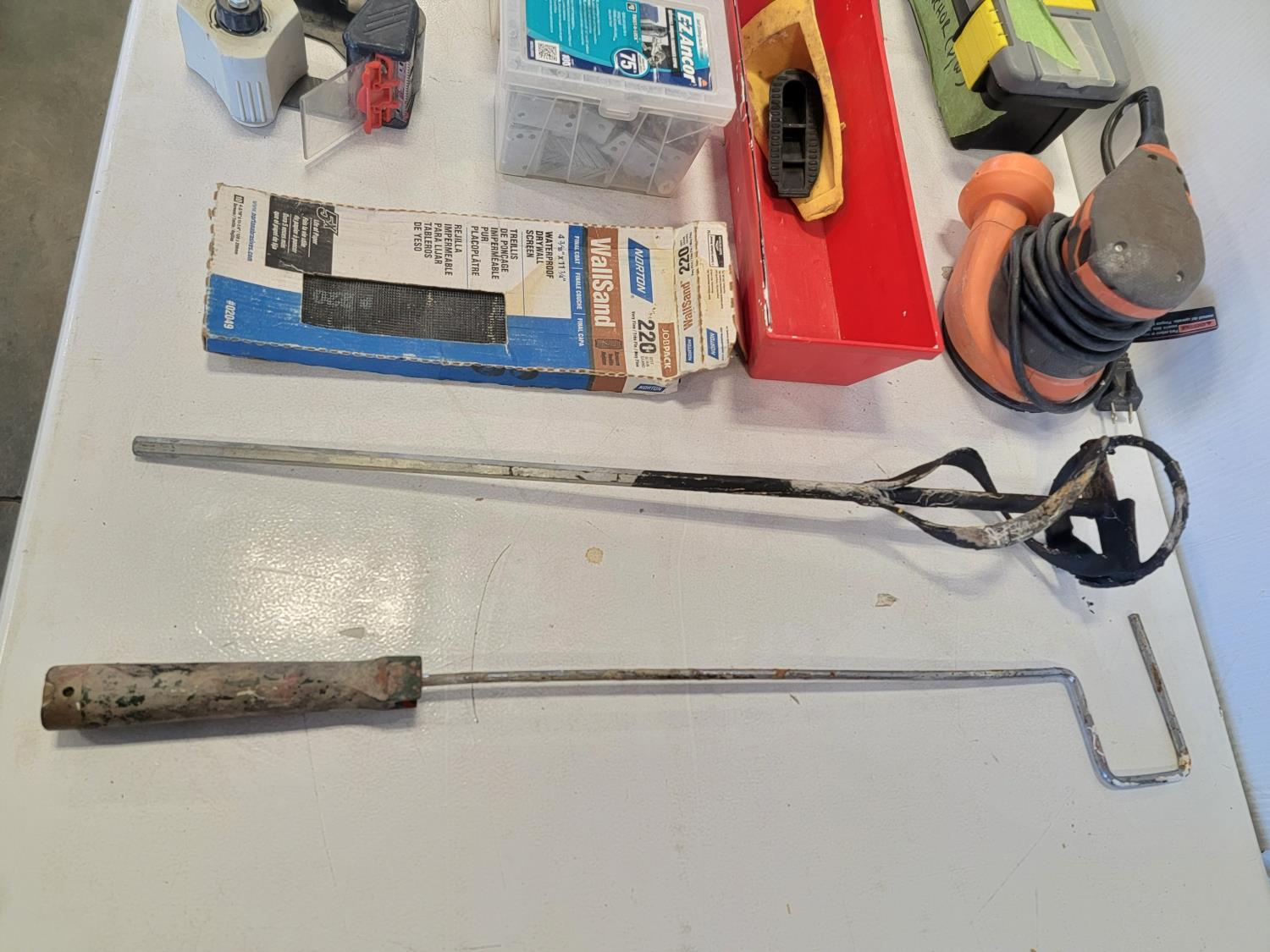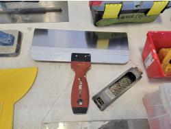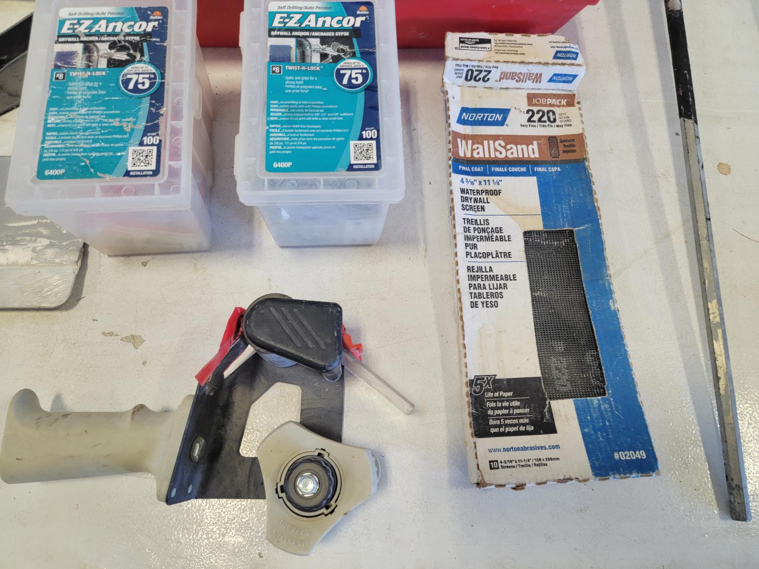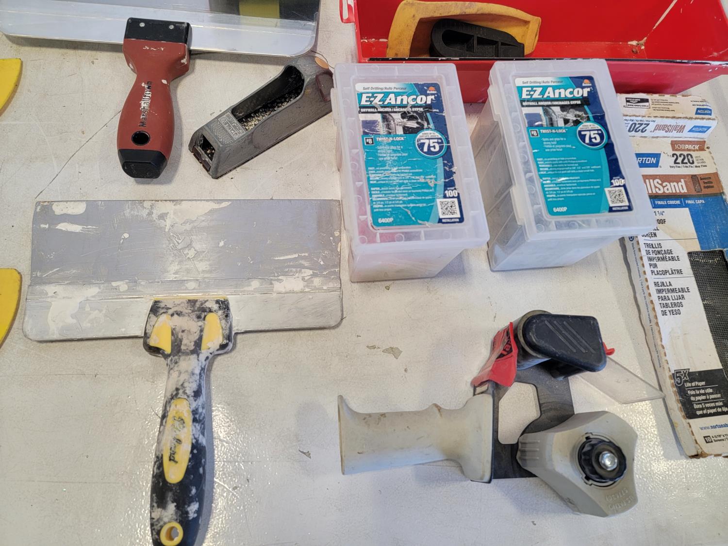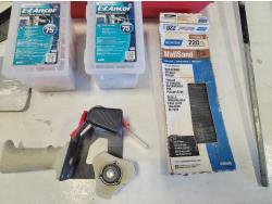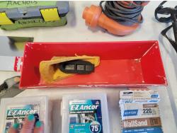 Ridgid palm sander, mixing paddle, anchors, putty knives, trowels