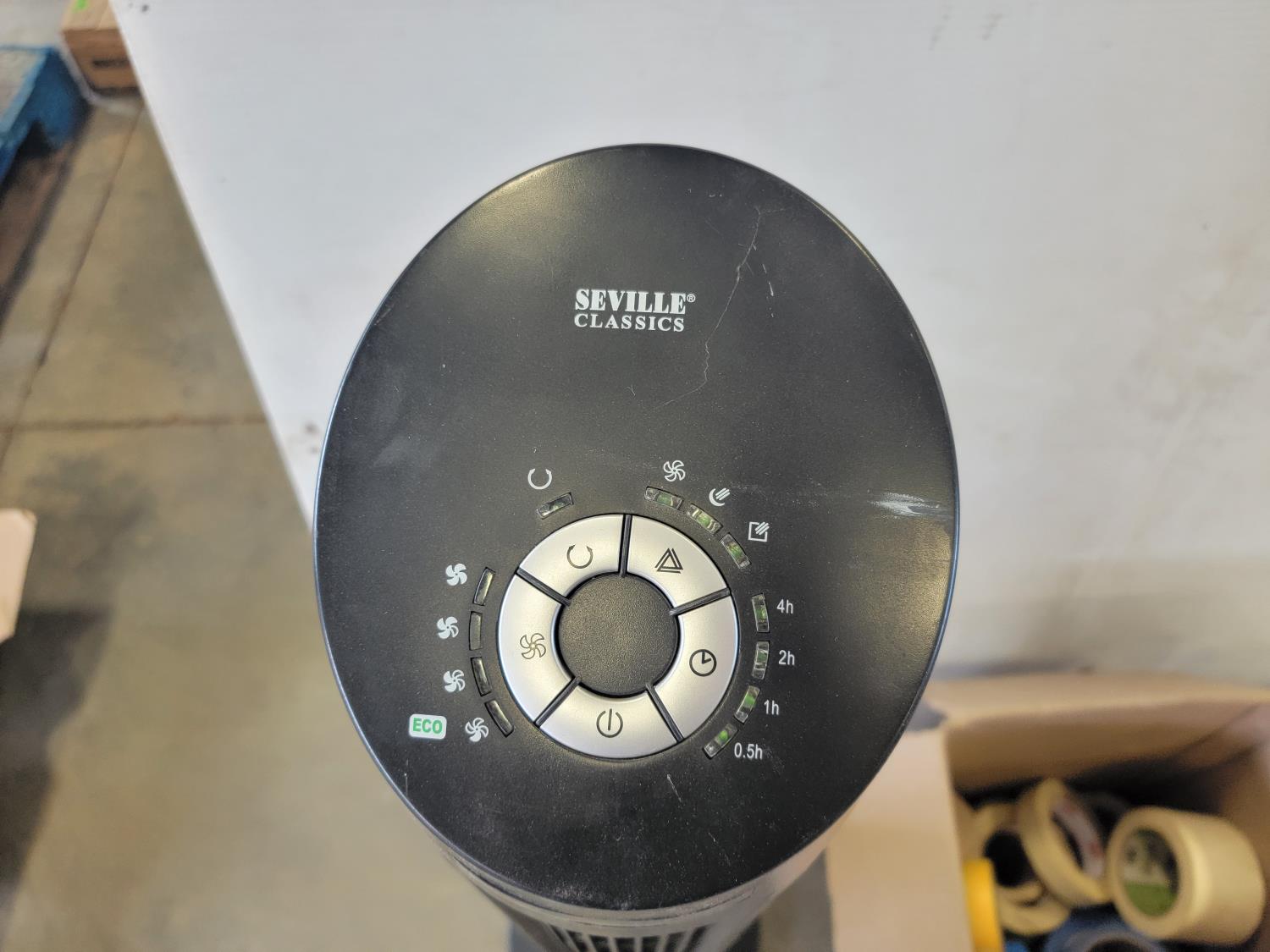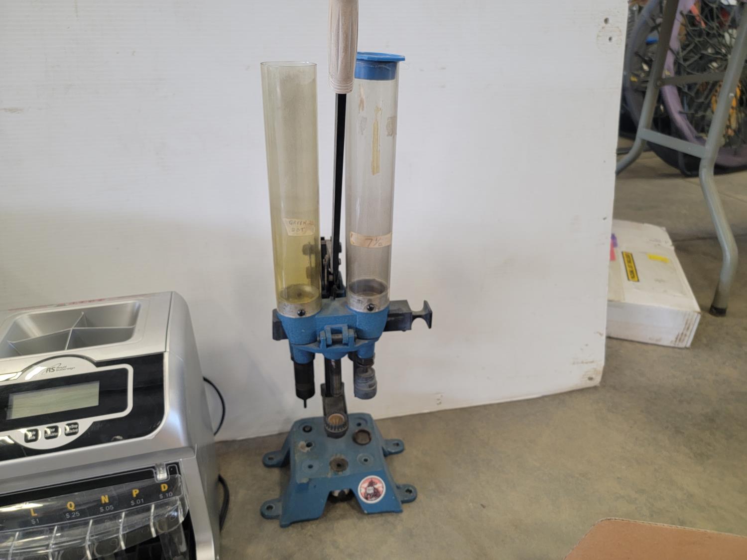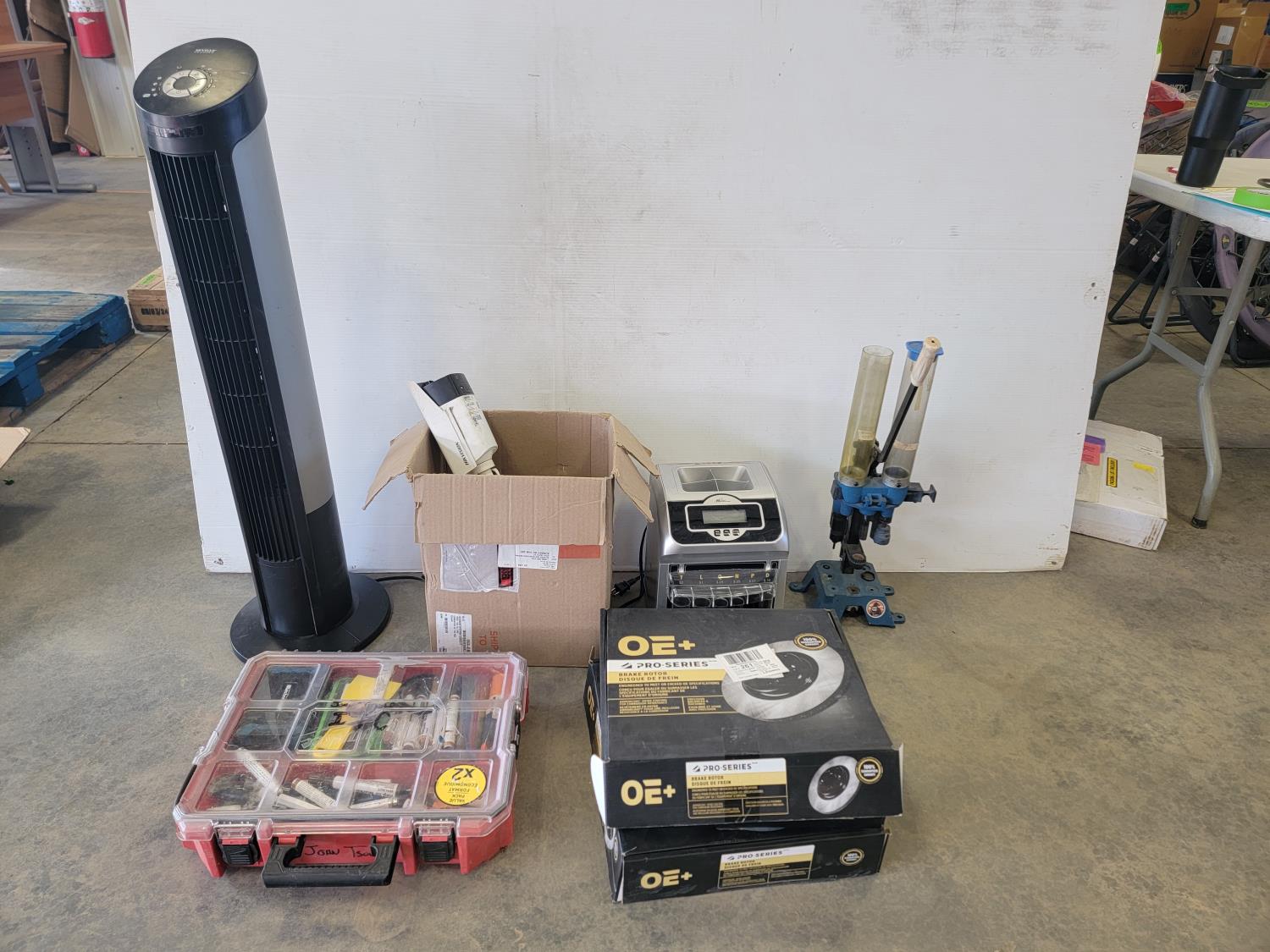Security camera, oscillating tower fan, tapes, wood repair markers, coin sorter, reloading press