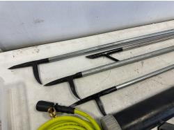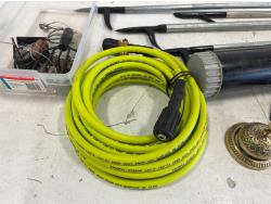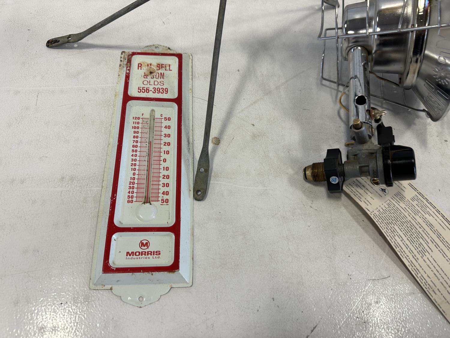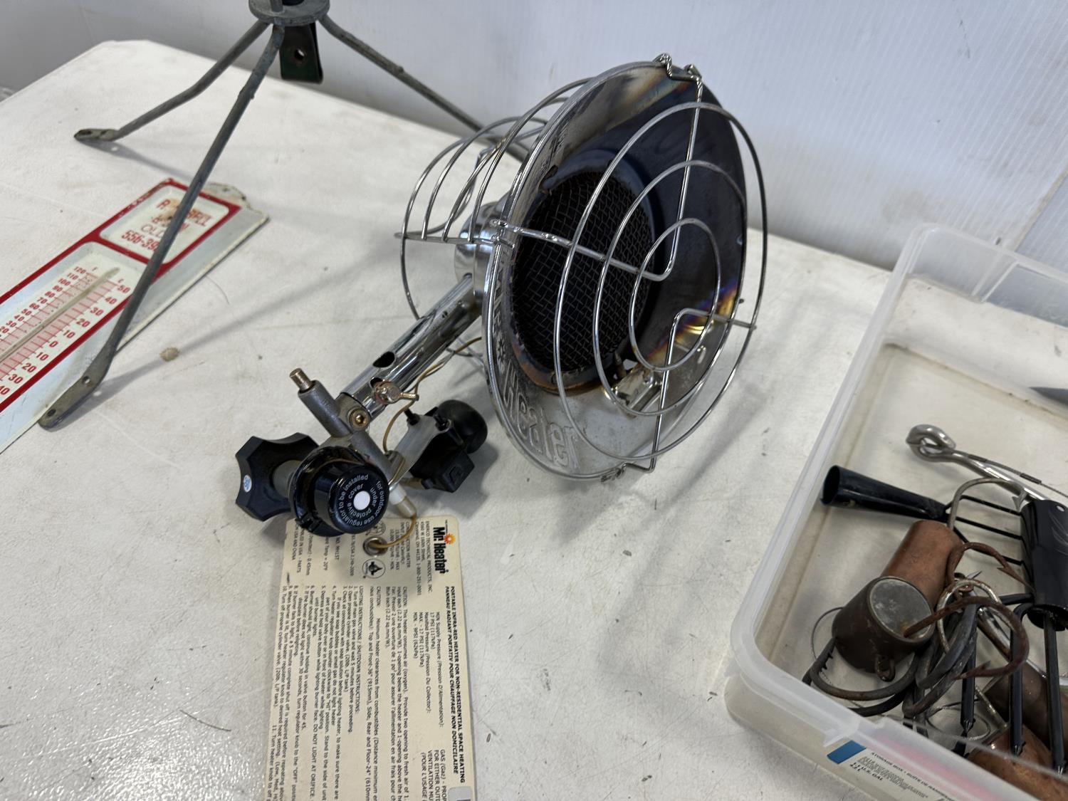 Mr. Heater tank top propane heater, thermometer, fire pokers, fishing rods