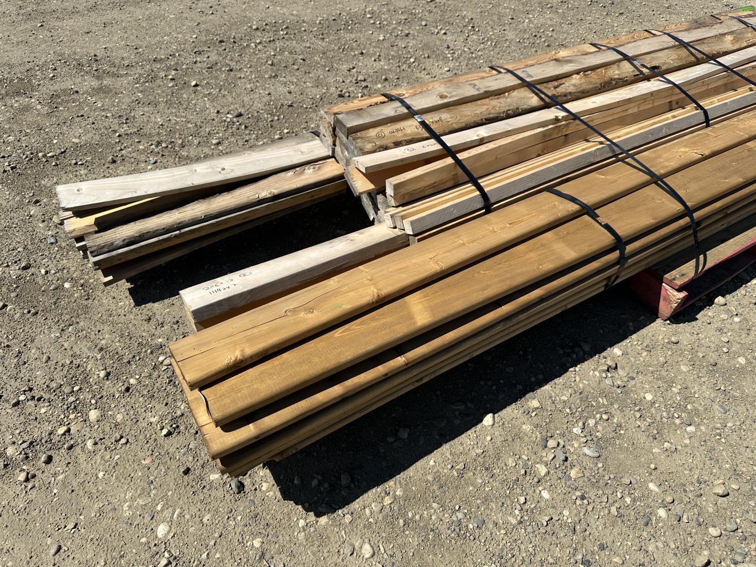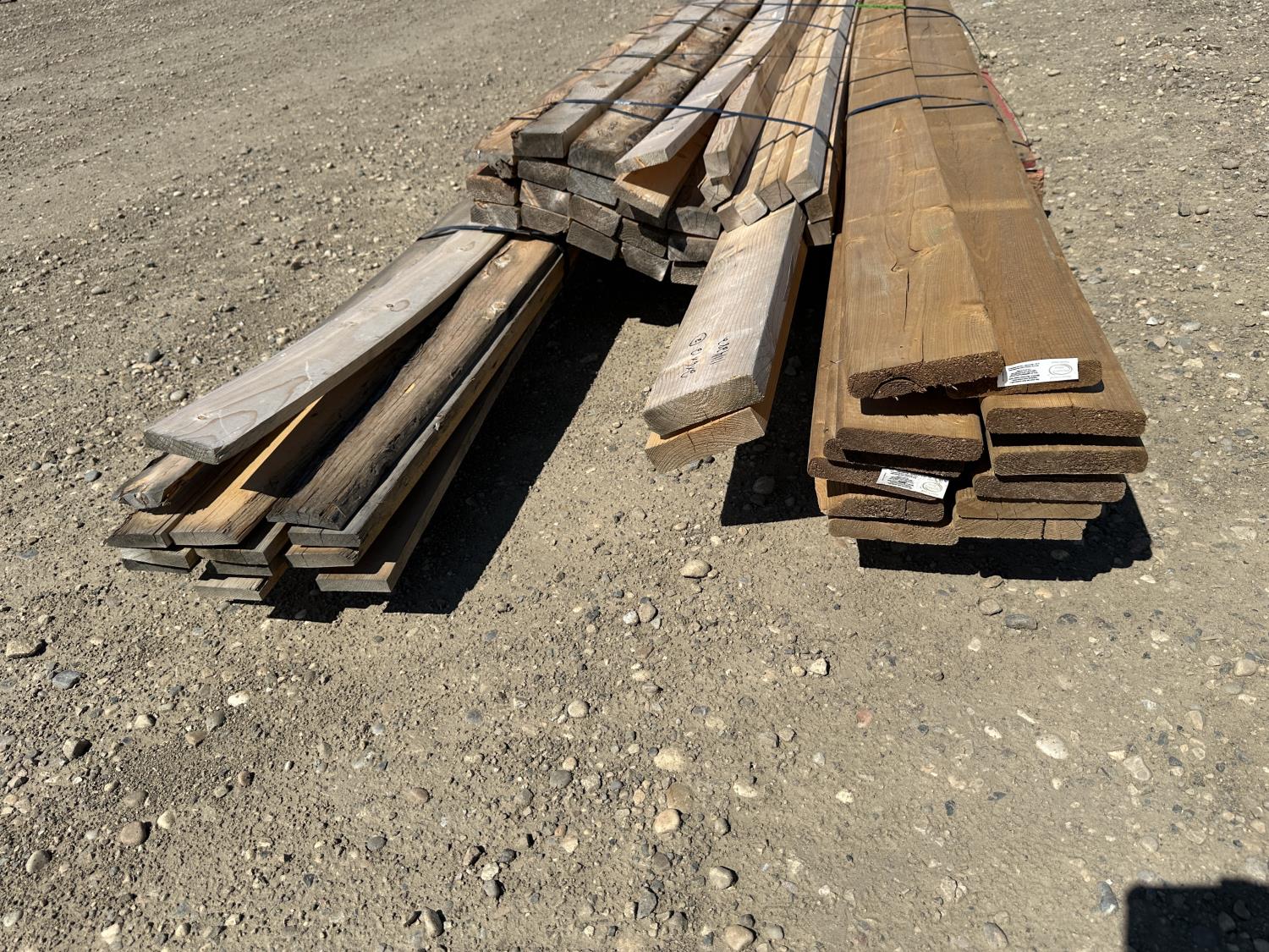 (12) 5/4 inch x 6 inch x 12 ft, (2) 2 inch x 6 inch x 12 ft spruce, (8) 1.5 inch x 1.5 inch x 8 ft spruce, (17) 3.5 inch x 1.5 inch x 8 ft spruce, (13) 3.5 inch x 0.5 inch x 12 ft