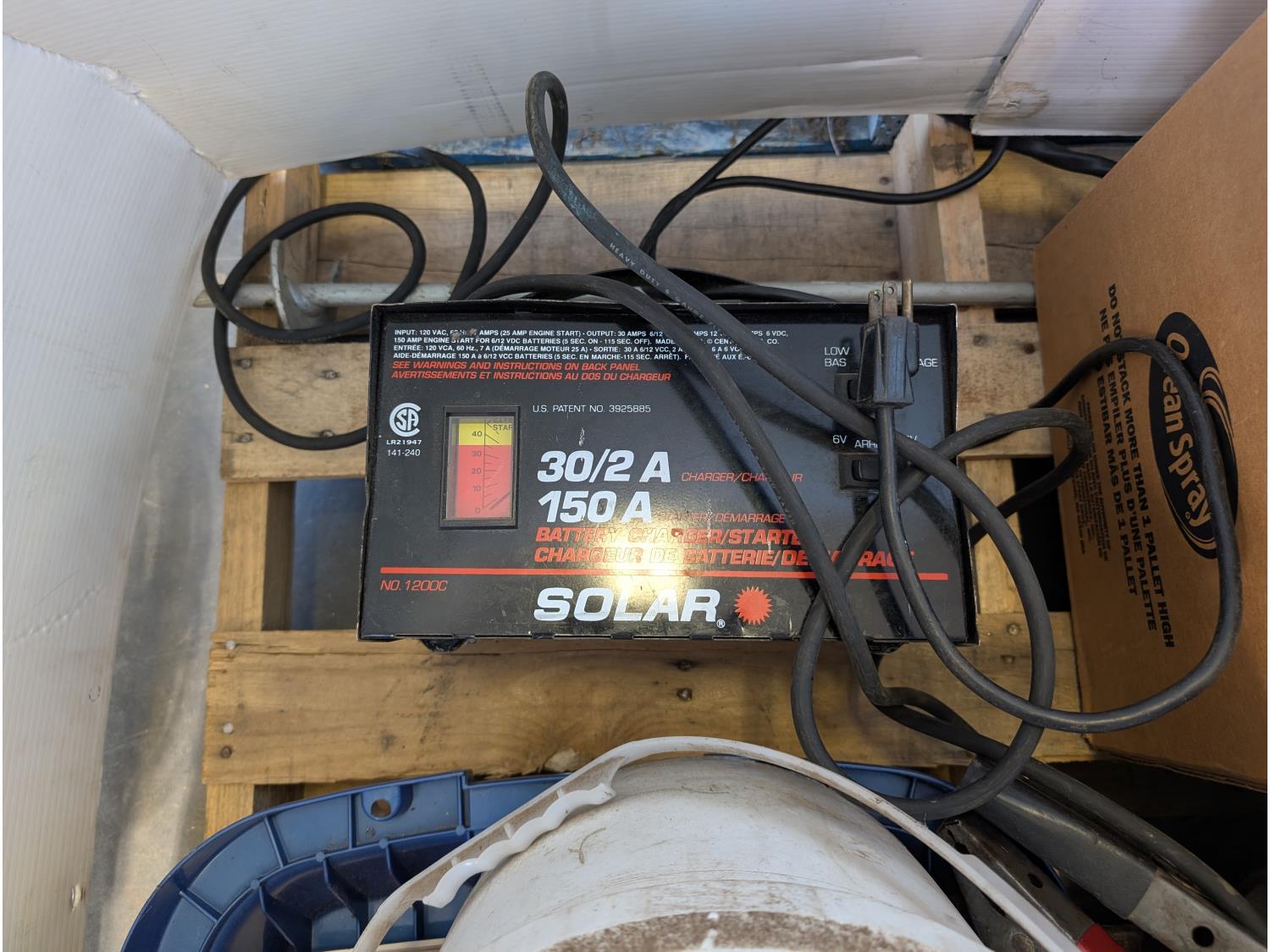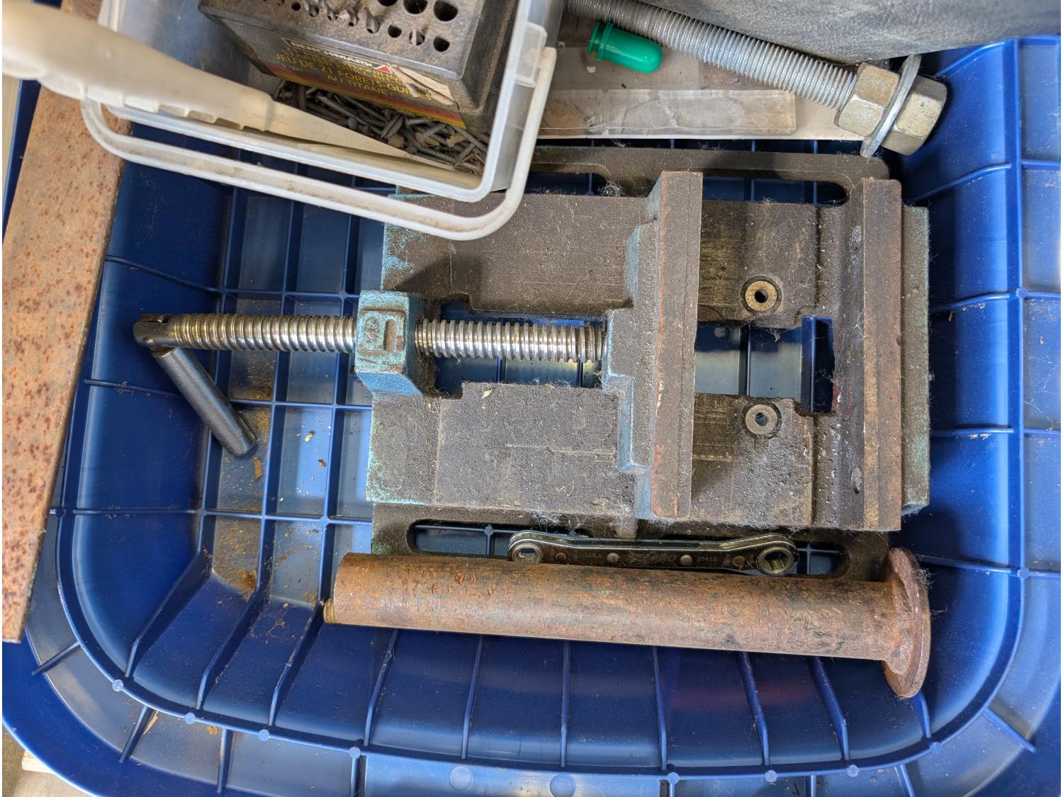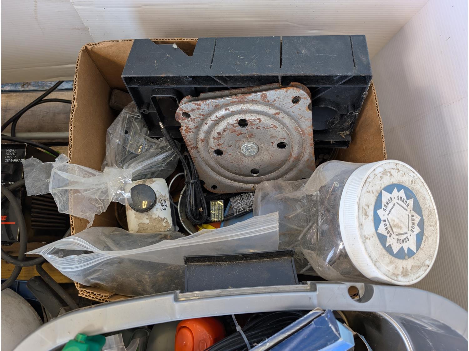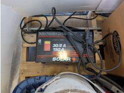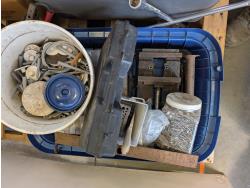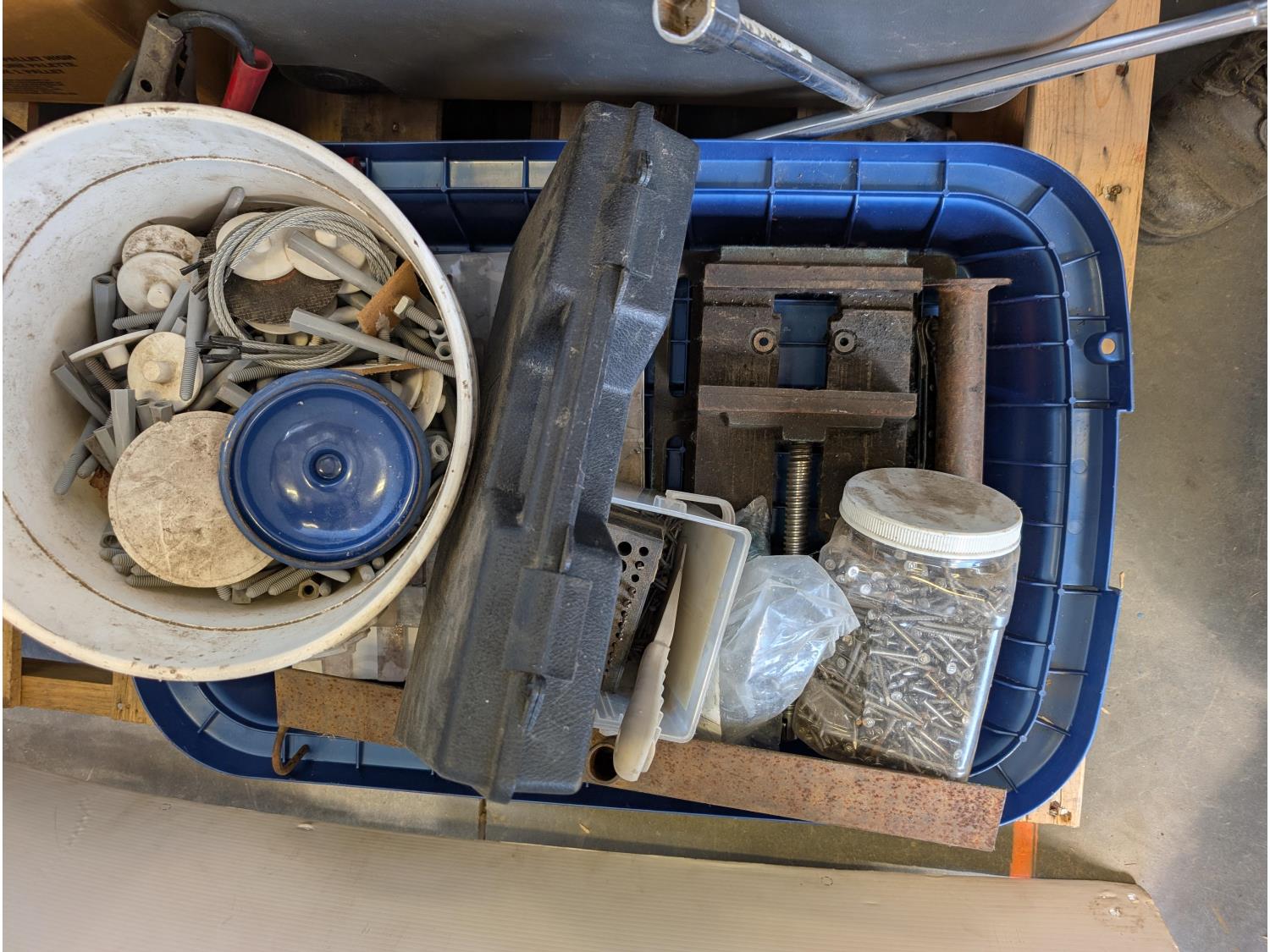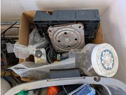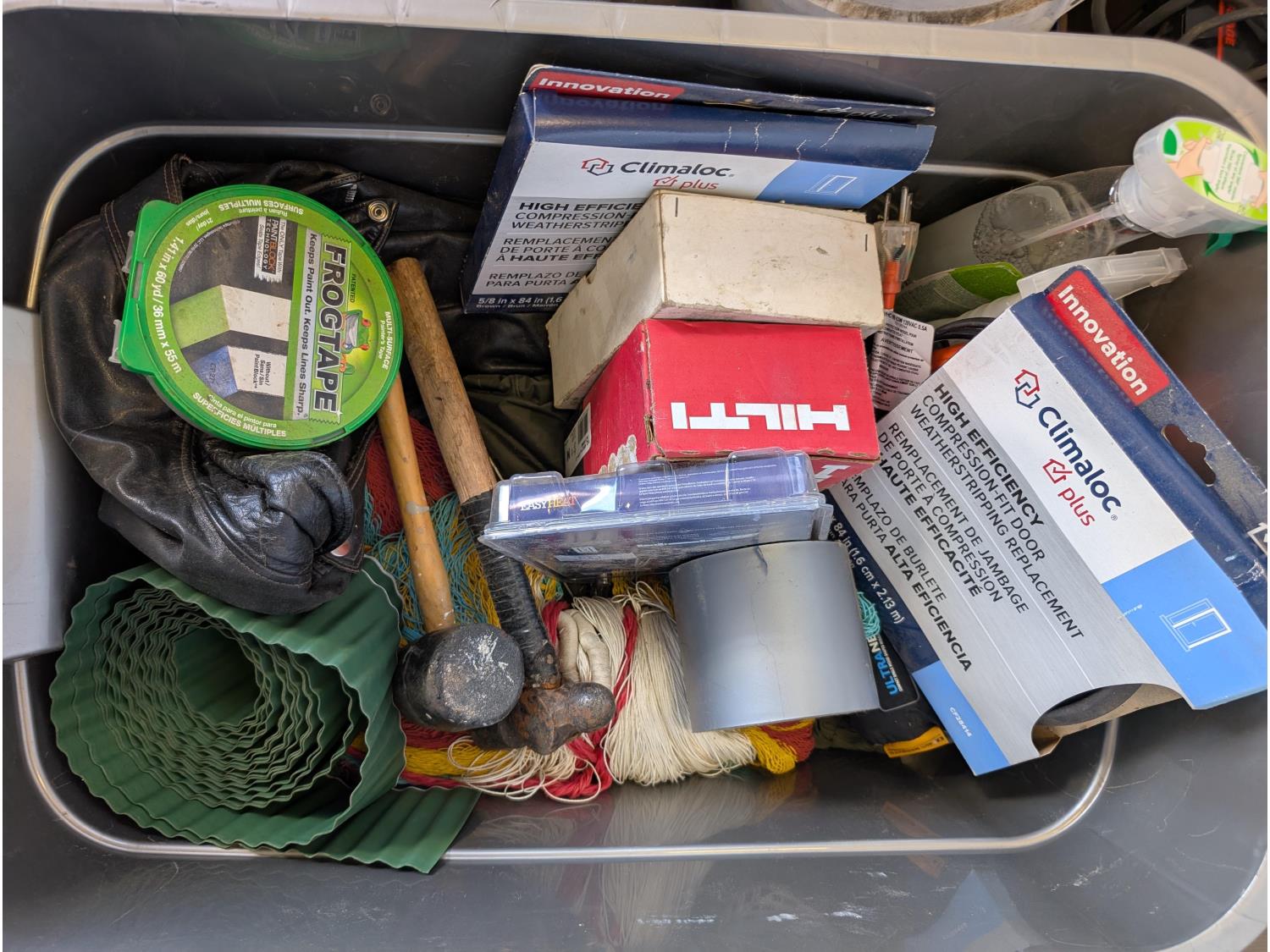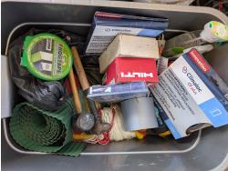 Solar battery charger, various fasteners, hand tools, heat tape, vise, door weather stripping