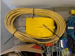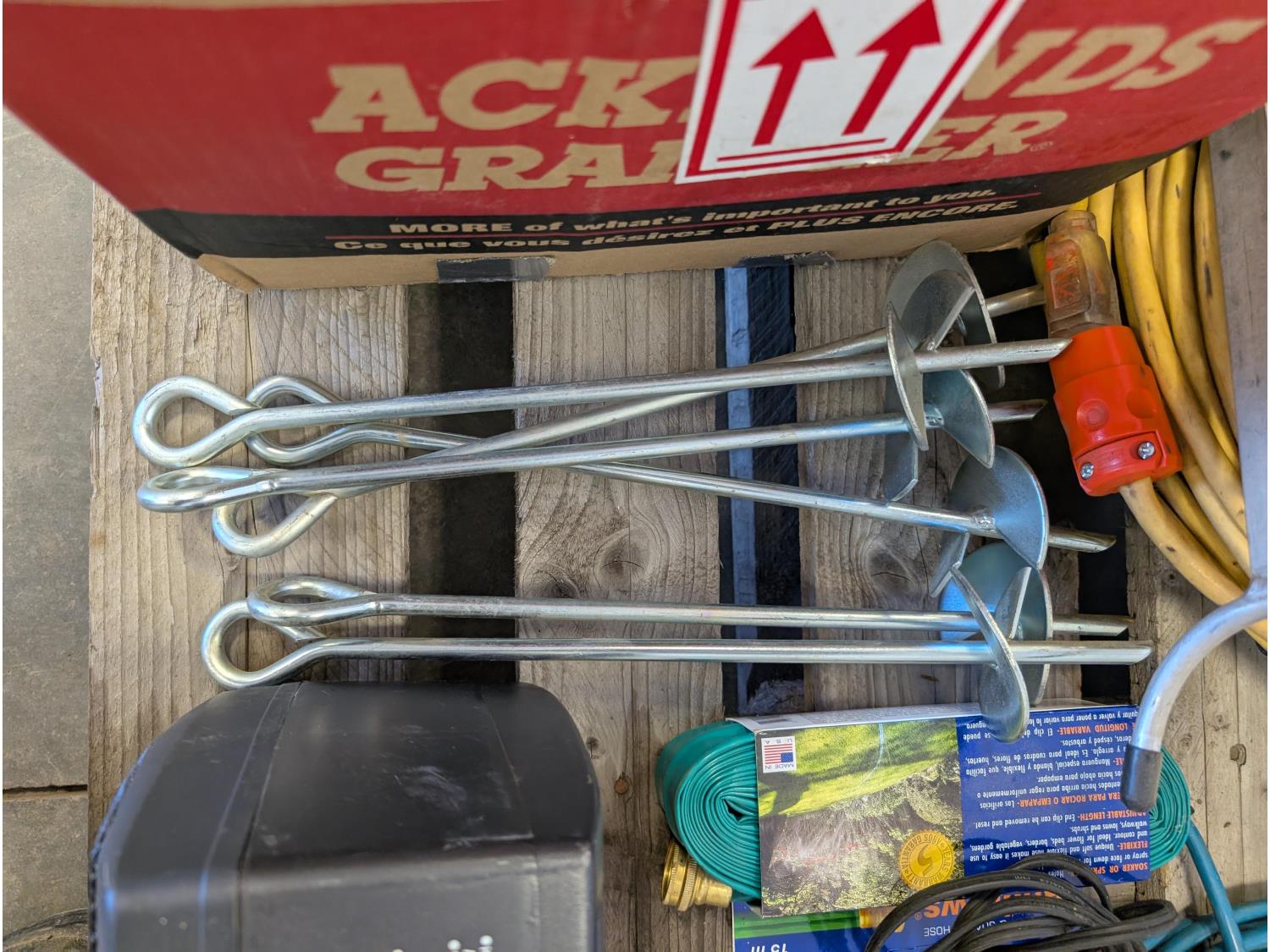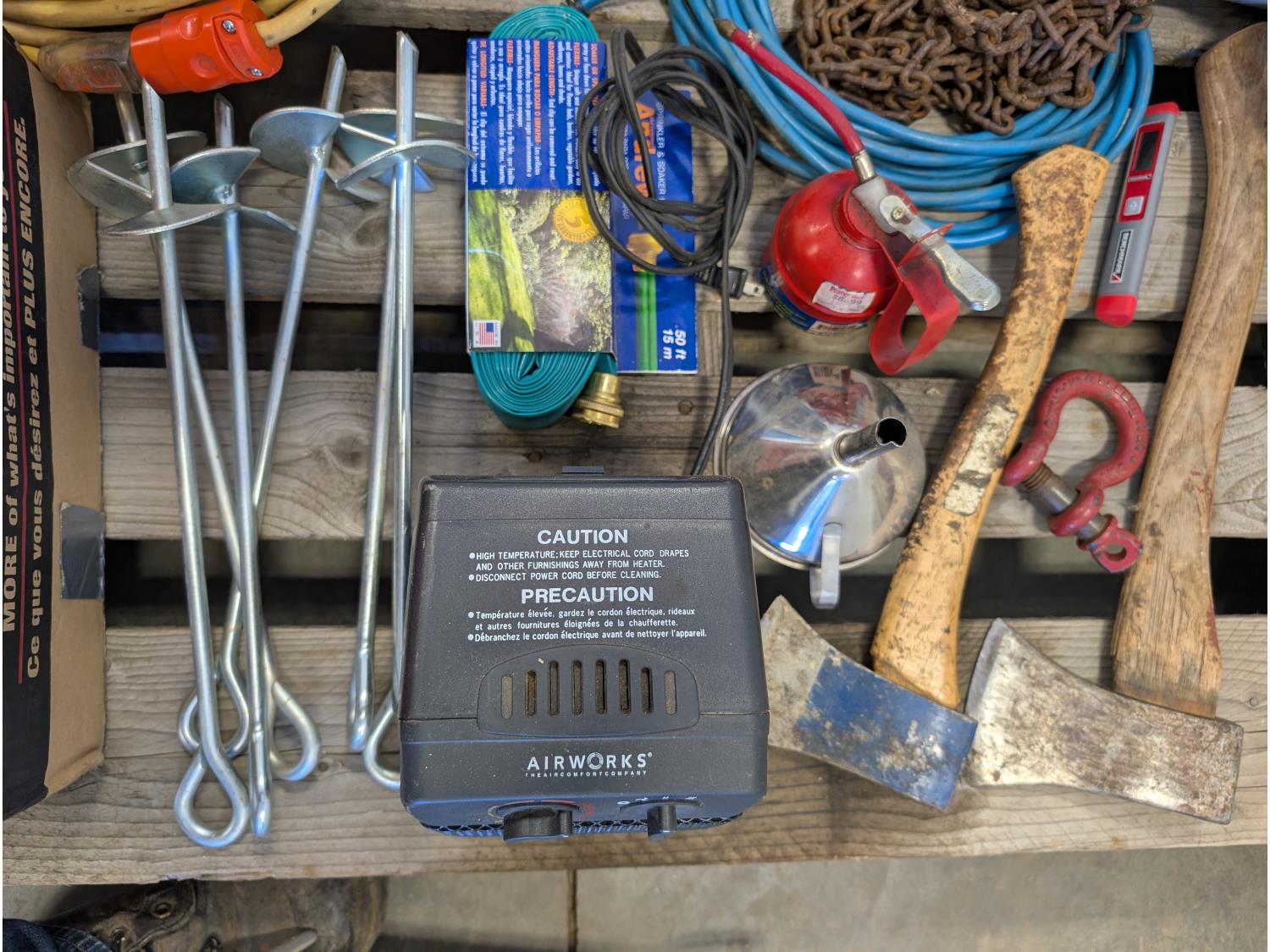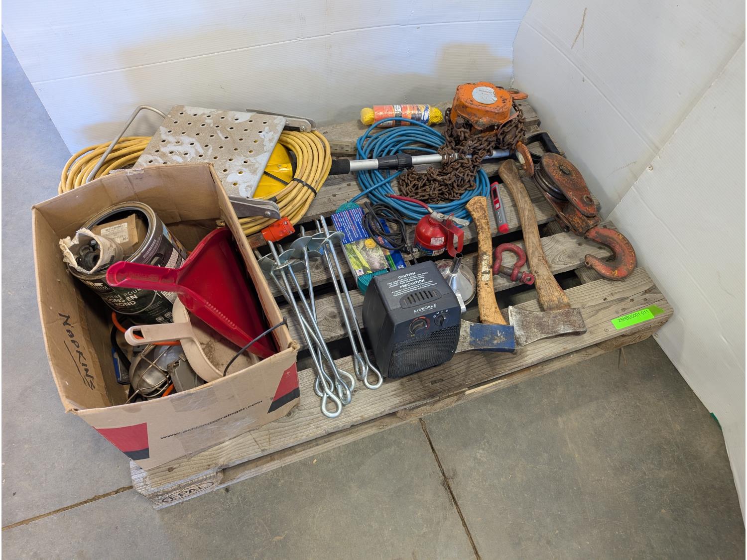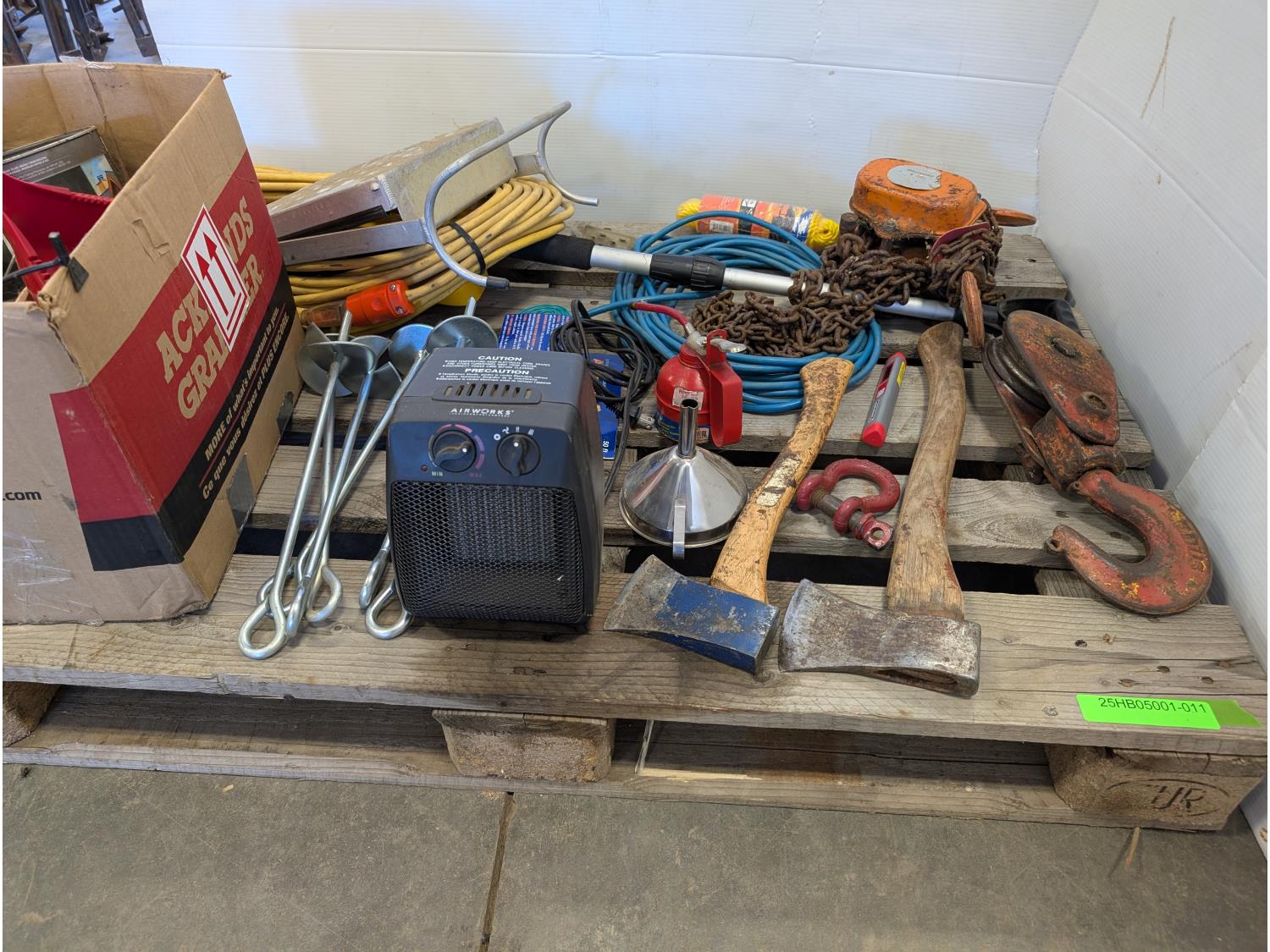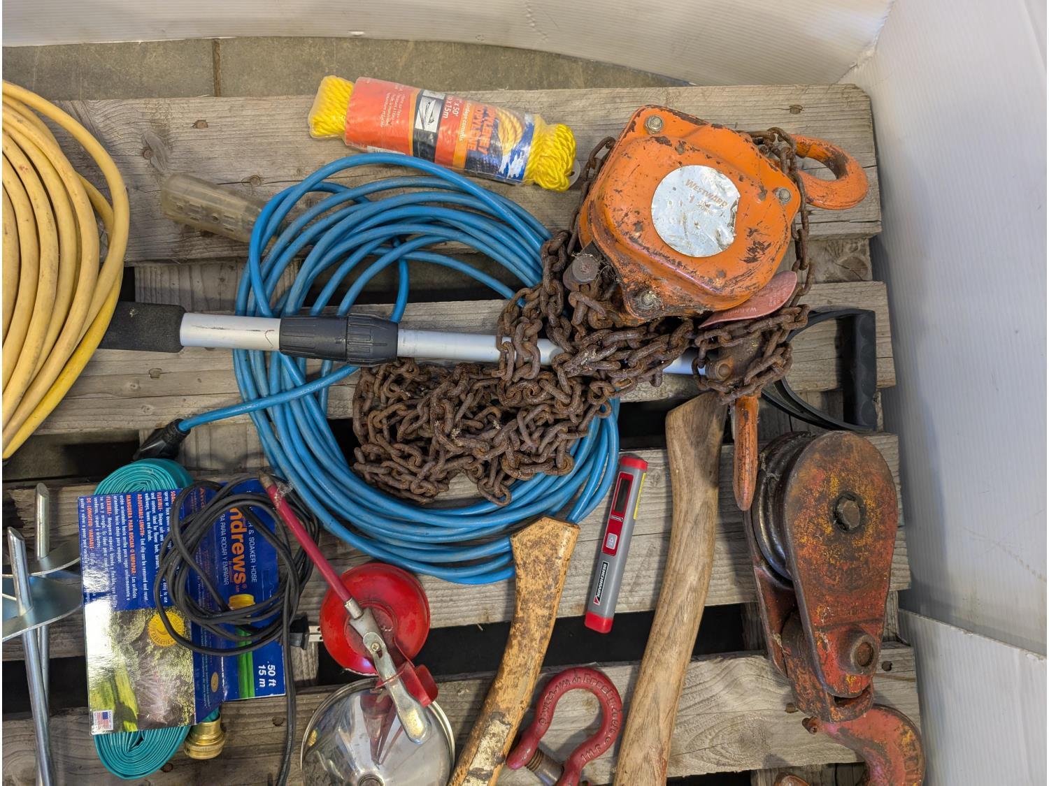 Space heater, hatchets, snatch block, Westward 1 ton chain hoist, 50 ft extension cord, funnel, oil can, miscellaneous tools