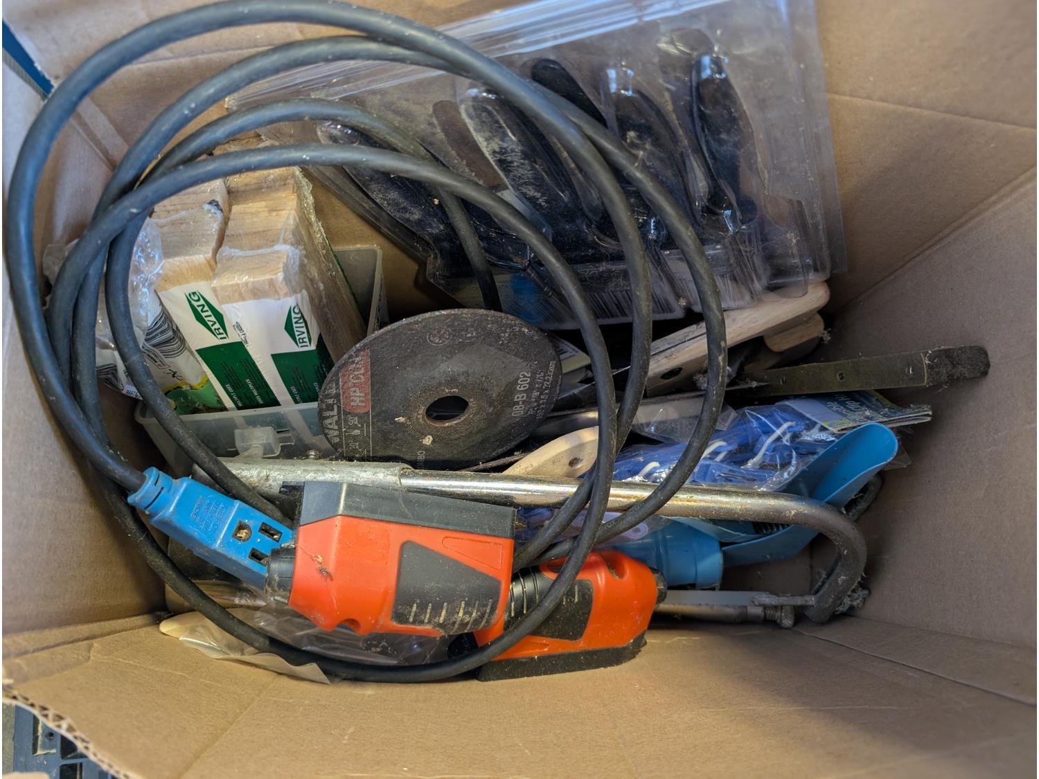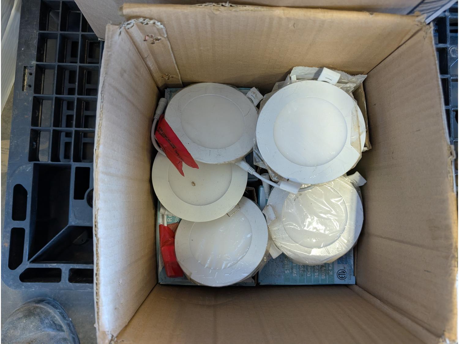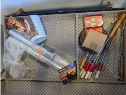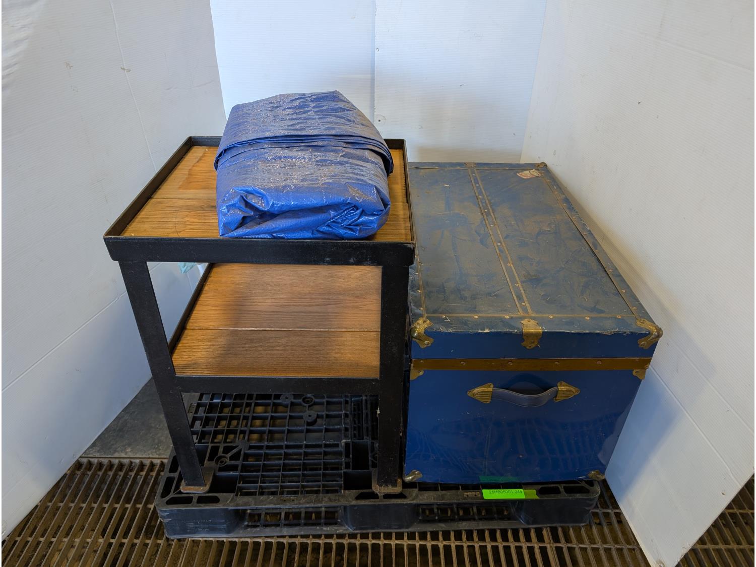 steel table 20 inch x 21 inch x 28 inch h, tarp, metal trunk 20 inch x 36 inch x 19 inch h, box of 6 LED lights, 3 inch flush mount lights, paint trays, paint brushes