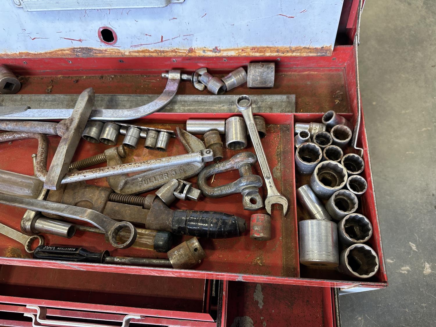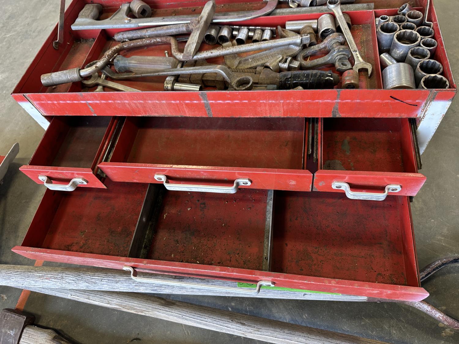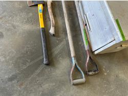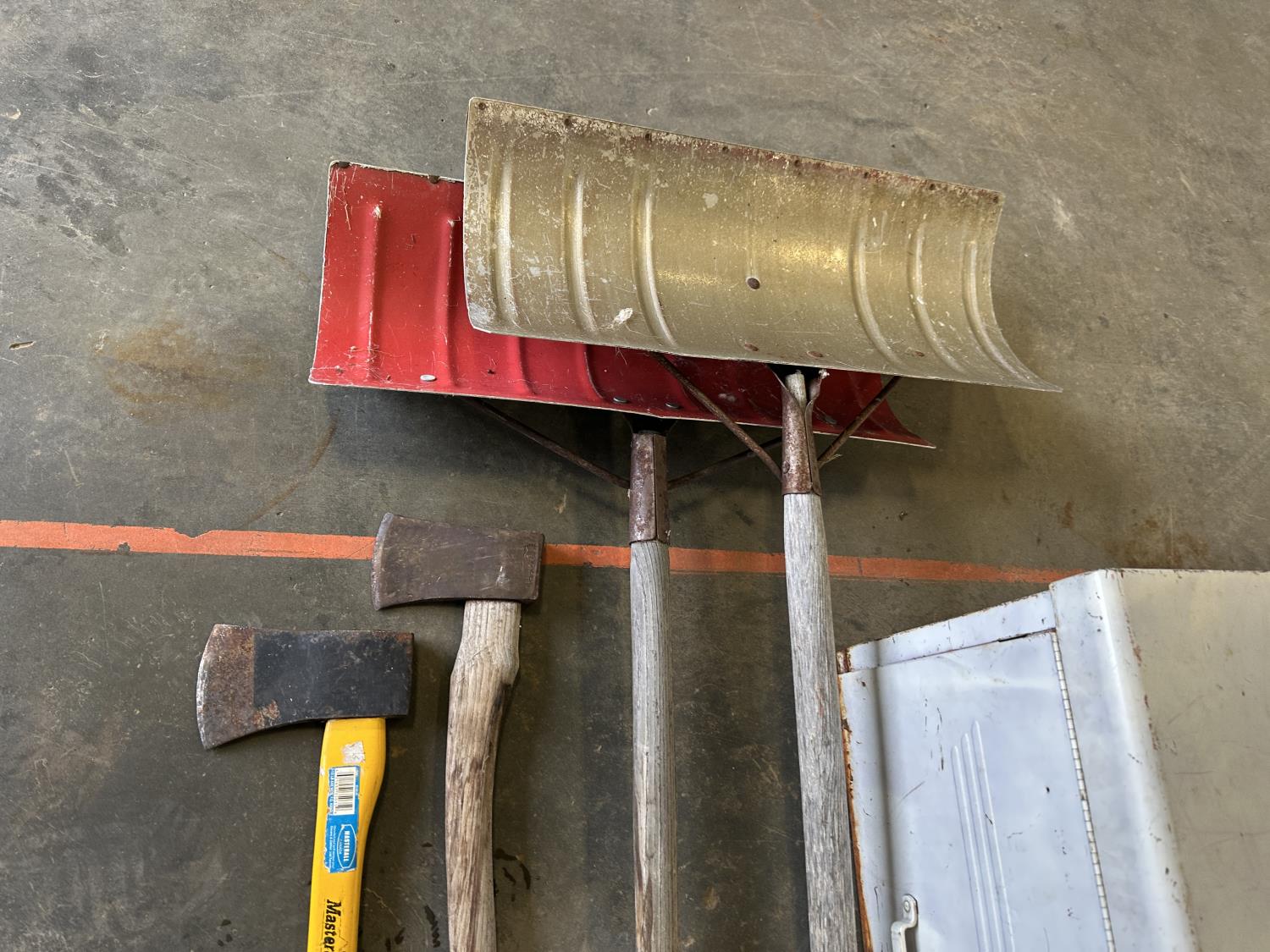 (2) metal shovels, tool box with some contents, hammer, (2) axes