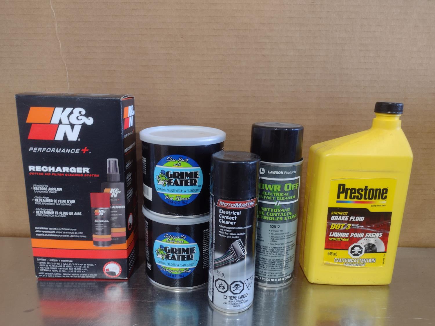 Hand cleaner, K&N recharge kit, electric contact cleaner, brake fluid