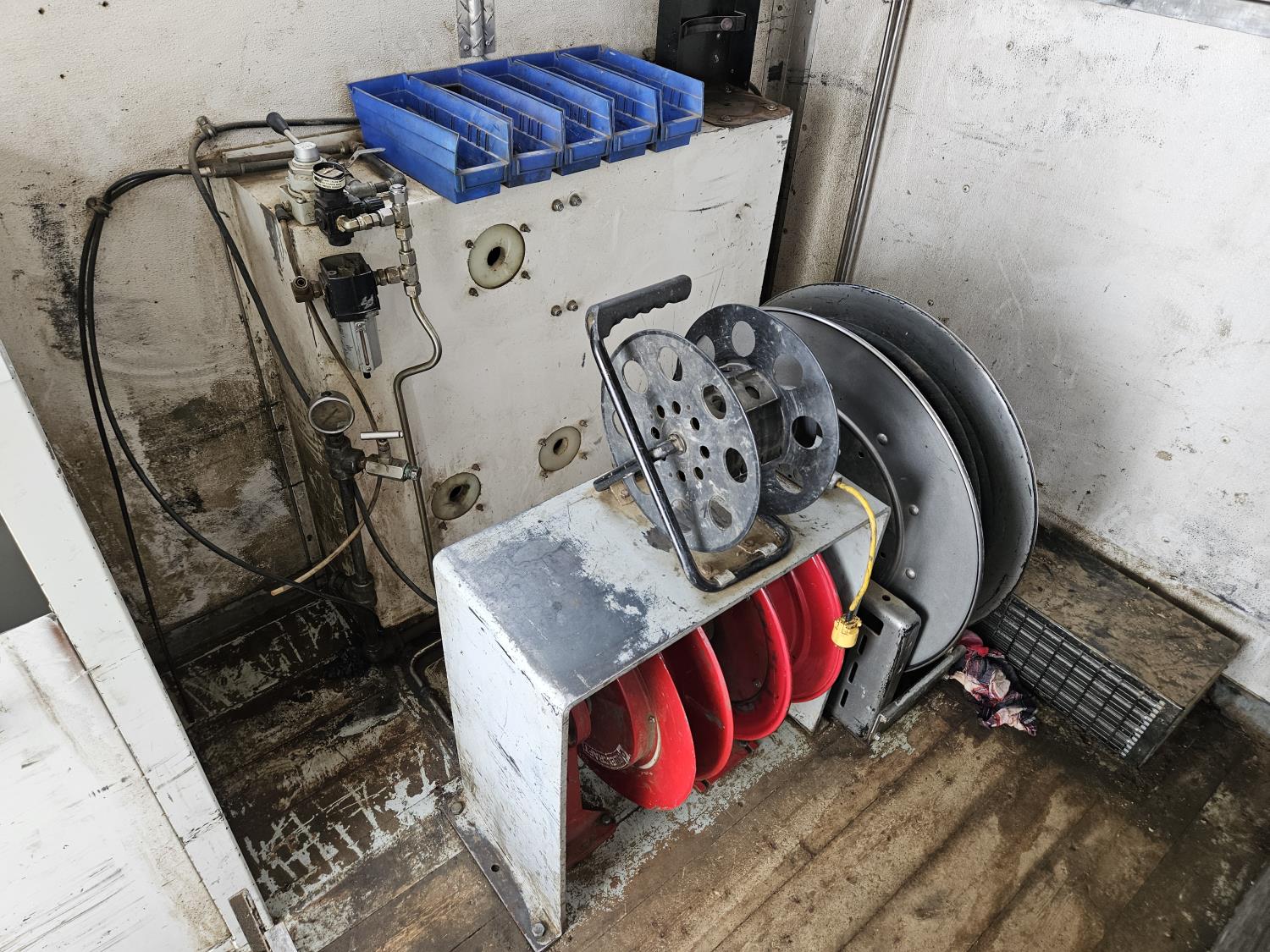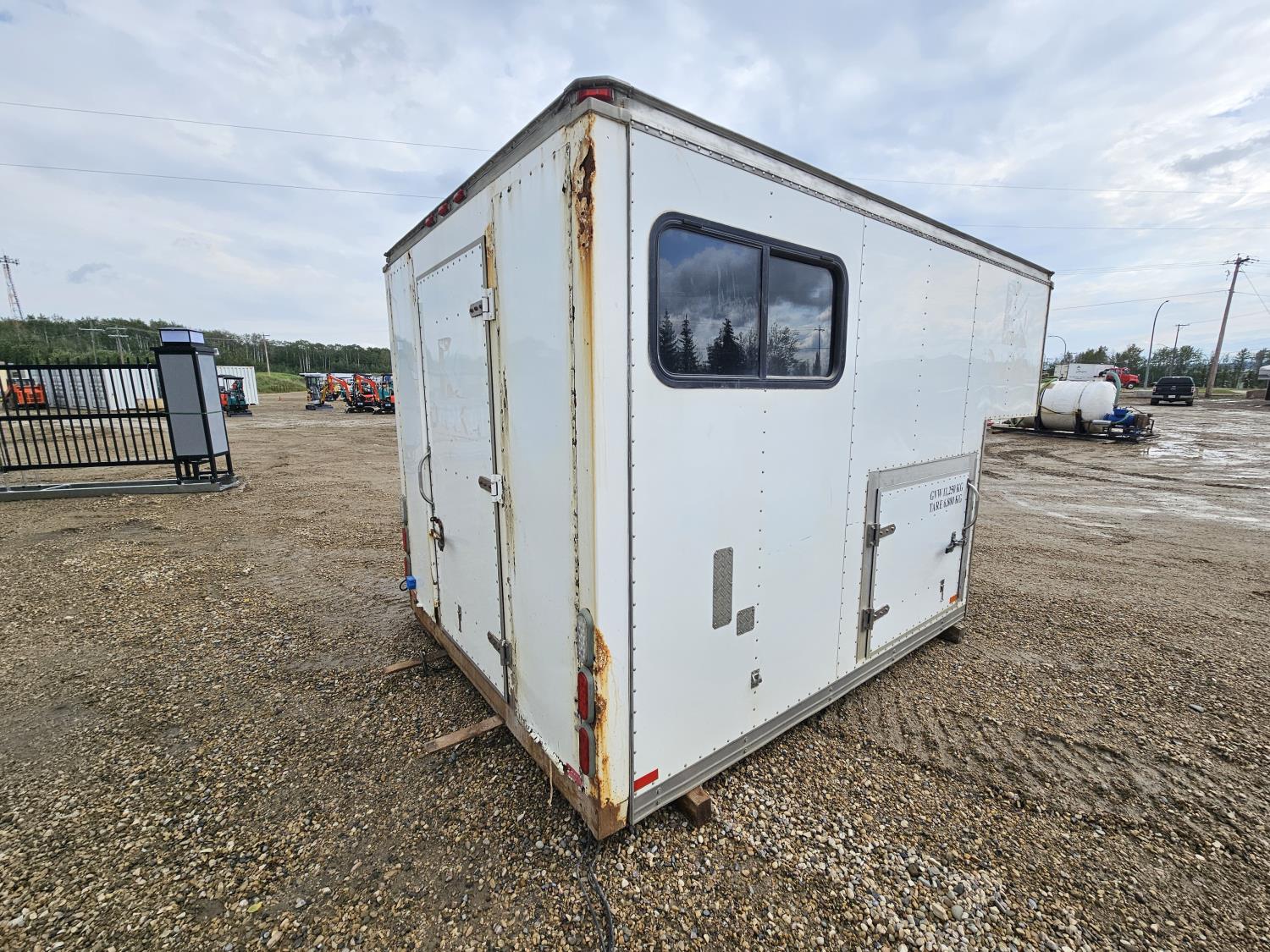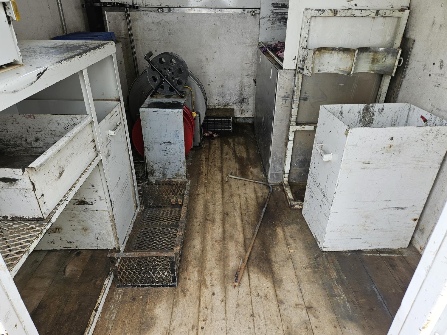 interior height 84 inch, 91 inch wide, rear man door, dual side doors, shelving, reels, window
