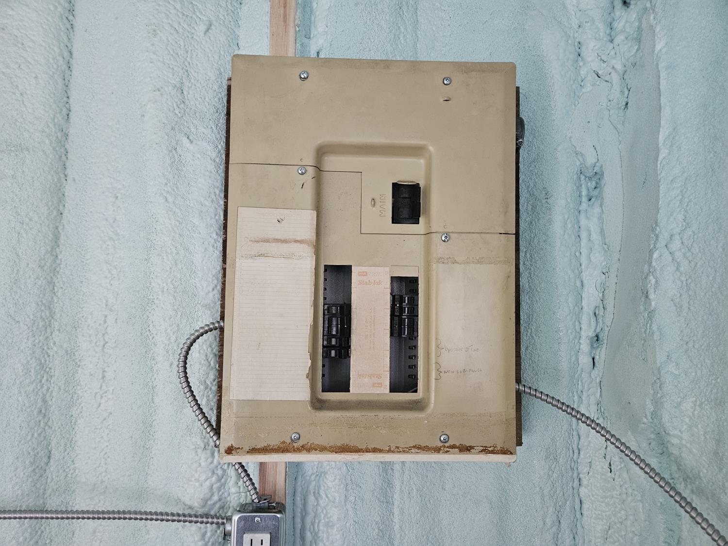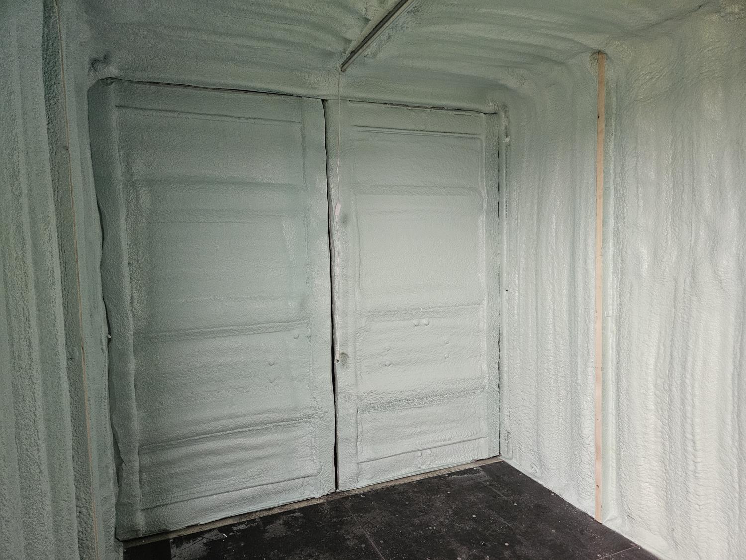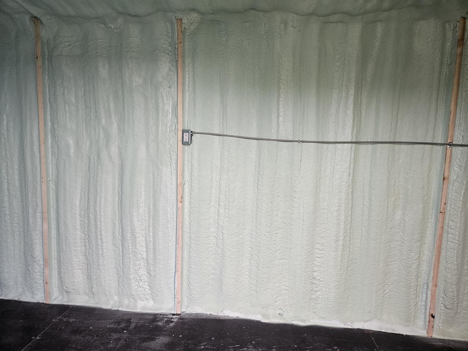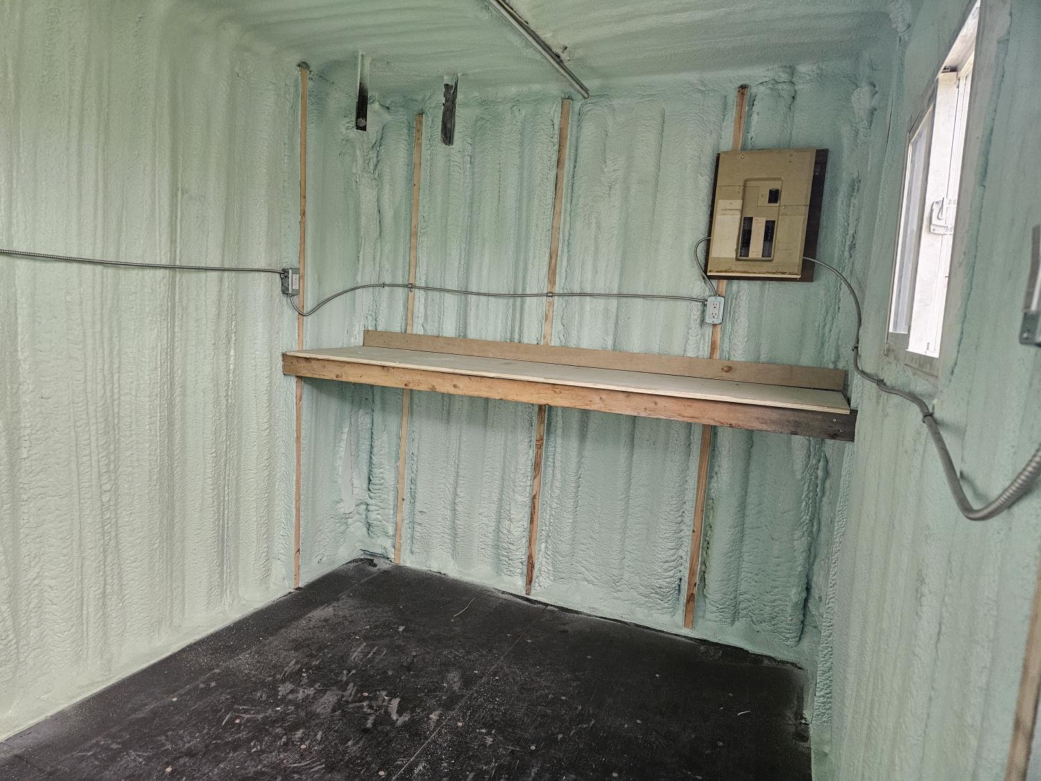 end doors, man door, window, spray foam insulated, wired w/receptacles, breaker panel, wooden work bench