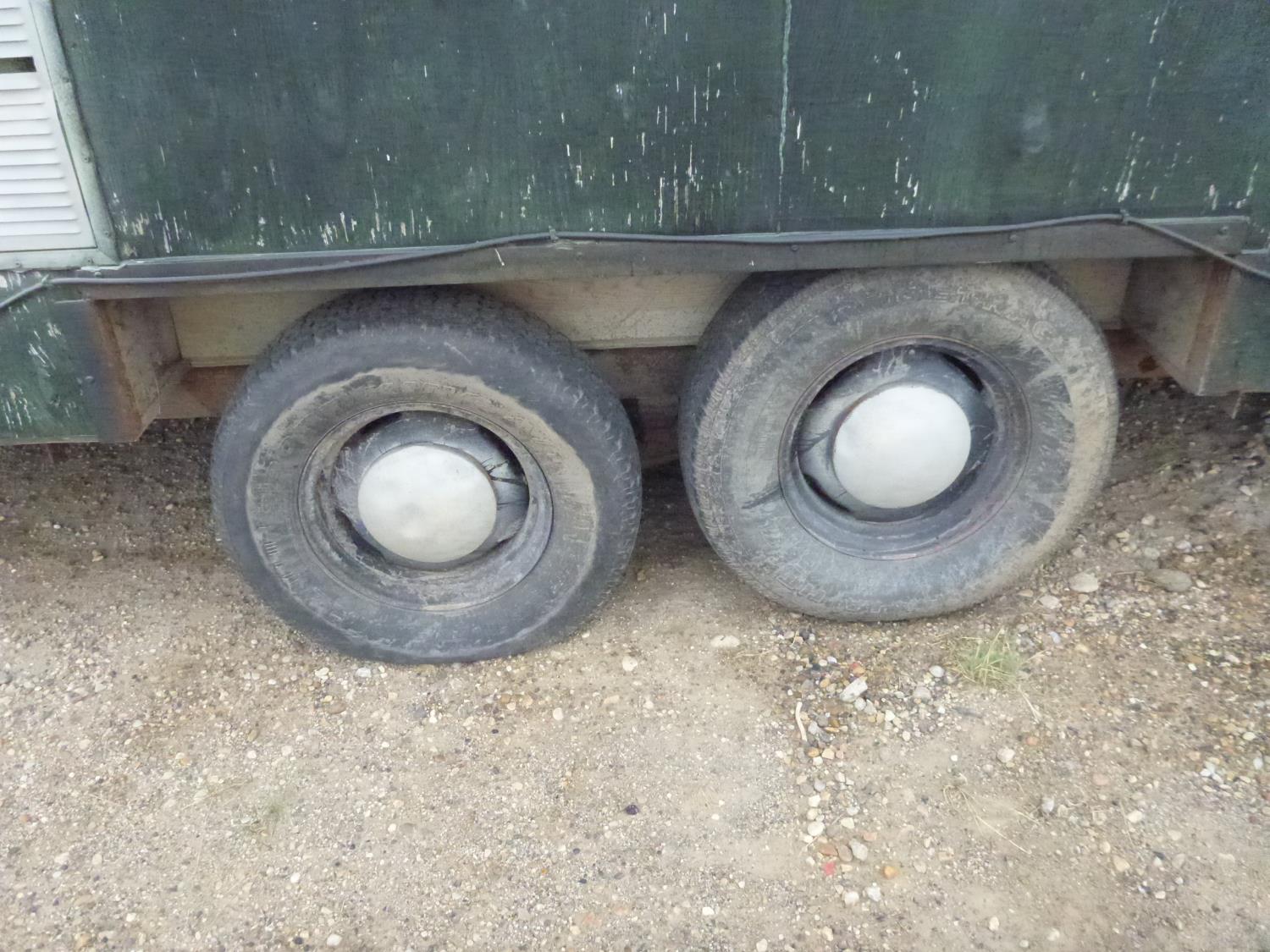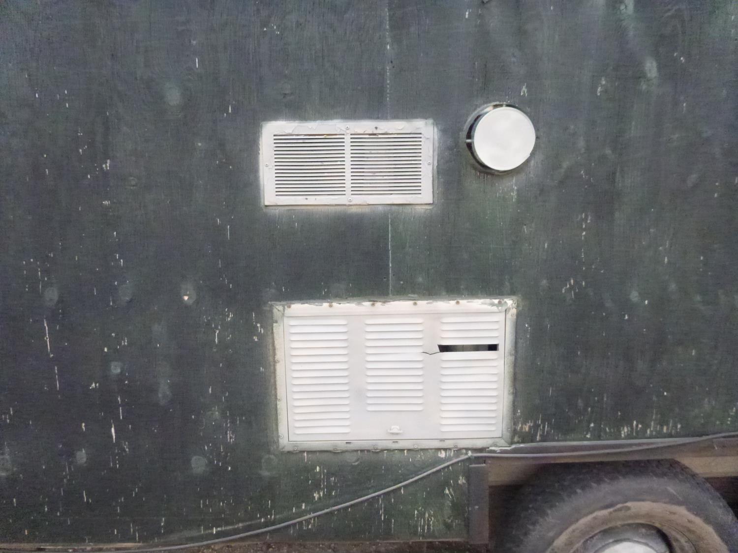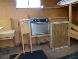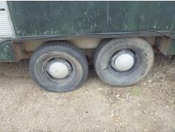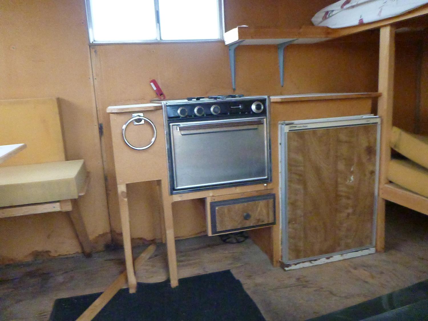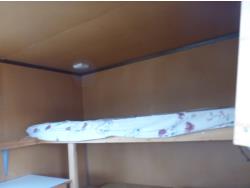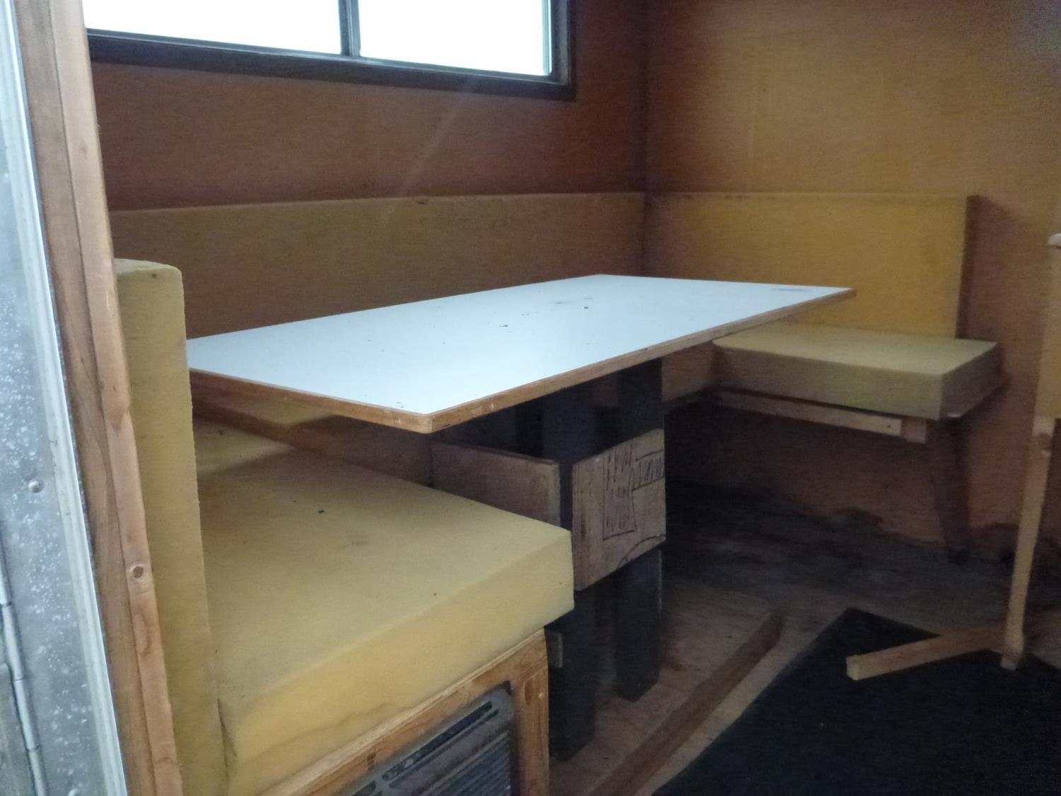 bunkbeds, stove, fridge, table, 4 ft deck on rear, mixed tires, front storage, spring suspension, water damage