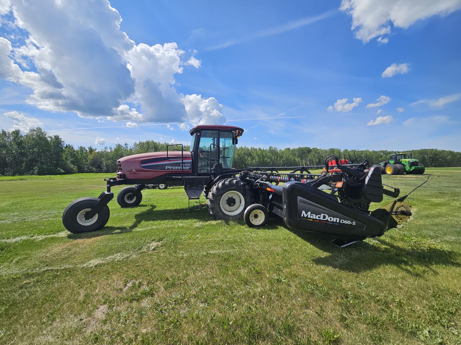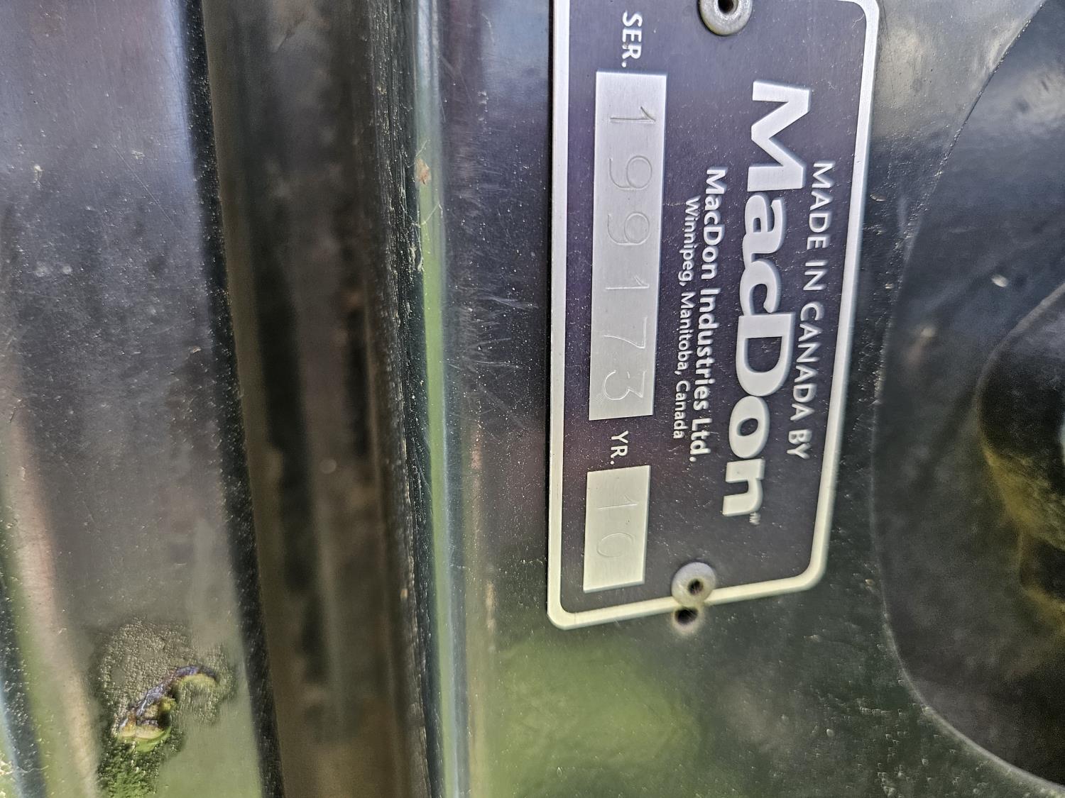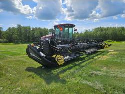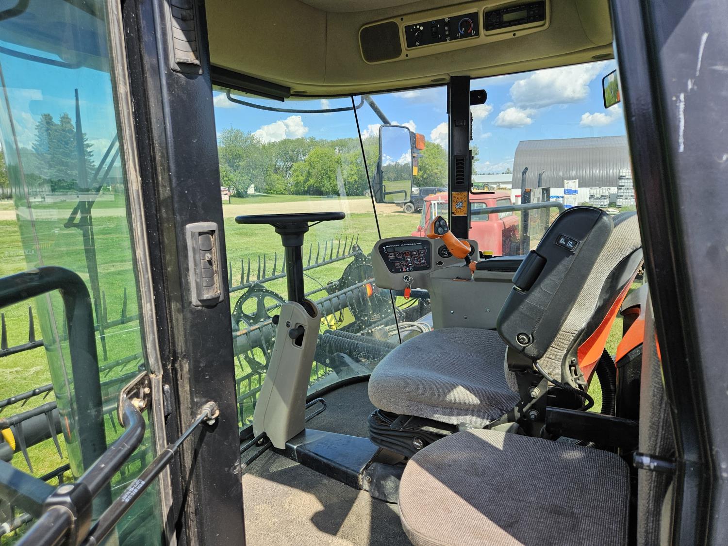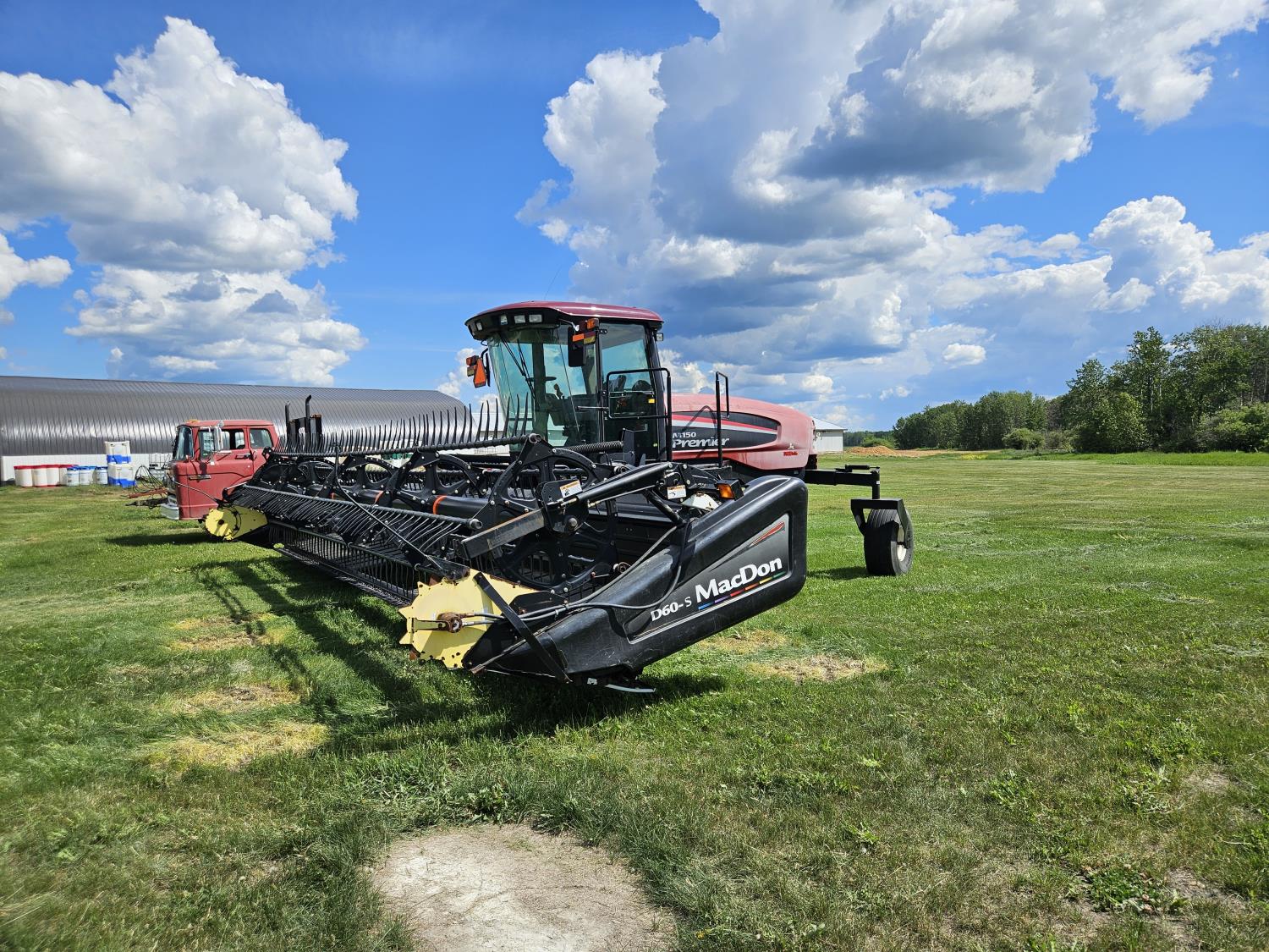 2010 MacDon D60-S triple delivery rigid draper header, pickup reel, double knife drive, fore & aft, gauge wheels, skid plates, crop dividers, Cummins 4.5 L 4 cylinder diesel engine, A/C, radio, air ride seat, buddy seat, 600/65R28 front tires, 16.5L-16.1 rear tires