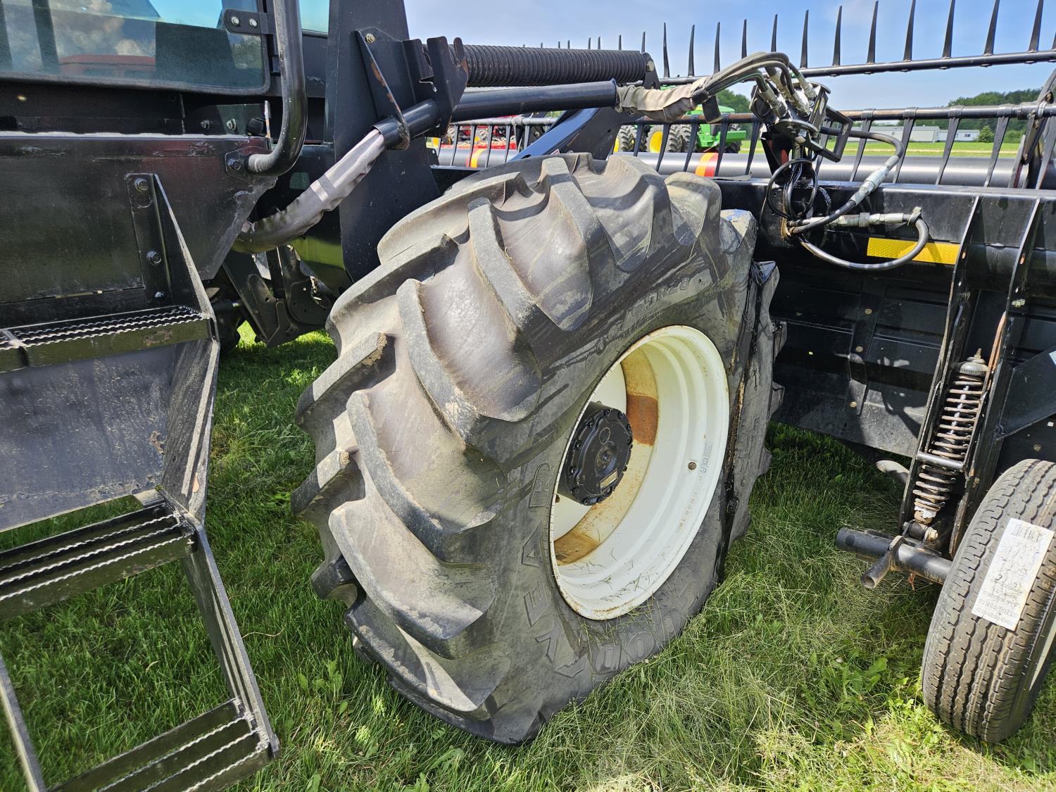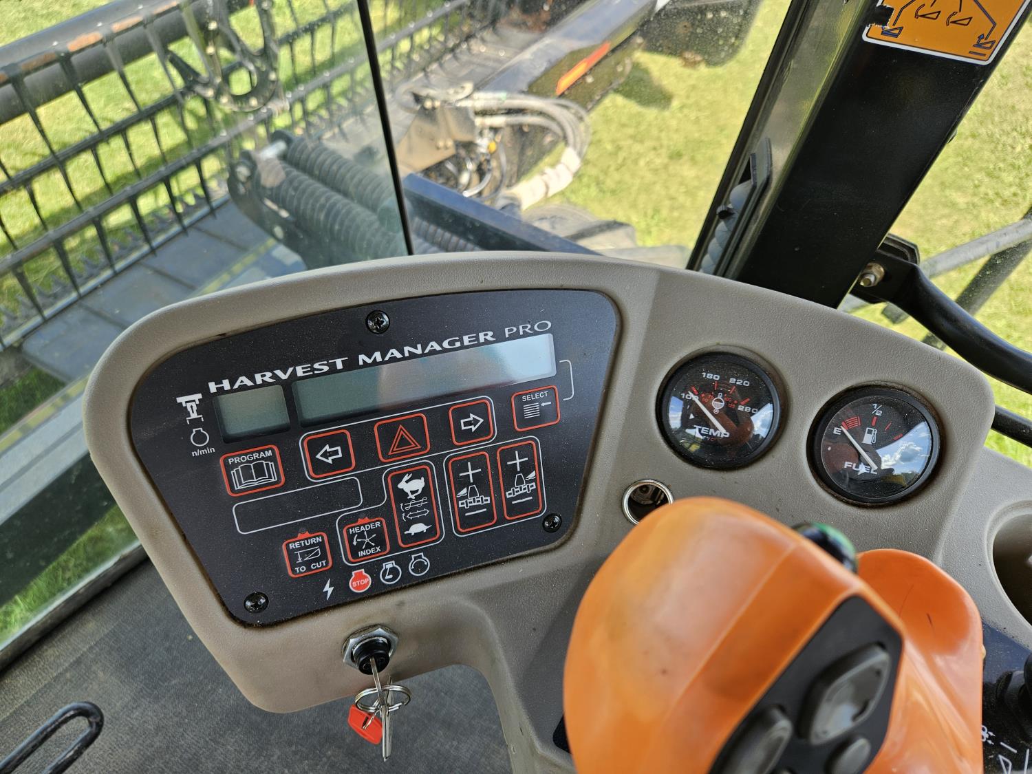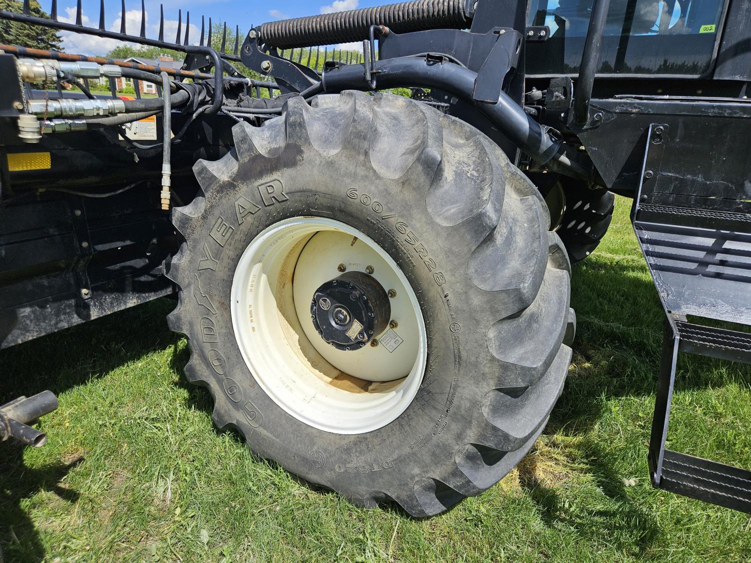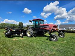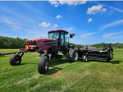 2010 MacDon D60-S triple delivery rigid draper header, pickup reel, double knife drive, fore & aft, gauge wheels, skid plates, crop dividers, Cummins 4.5 L 4 cylinder diesel engine, A/C, radio, air ride seat, buddy seat, 600/65R28 front tires, 16.5L-16.1 rear tires