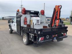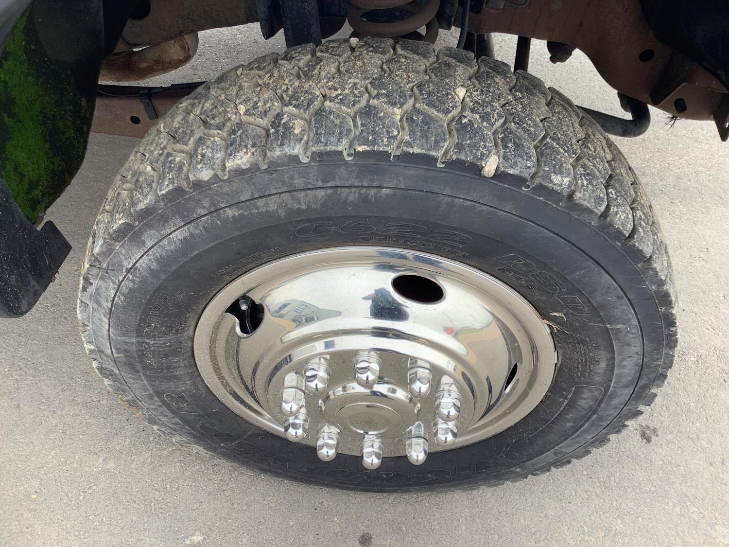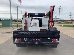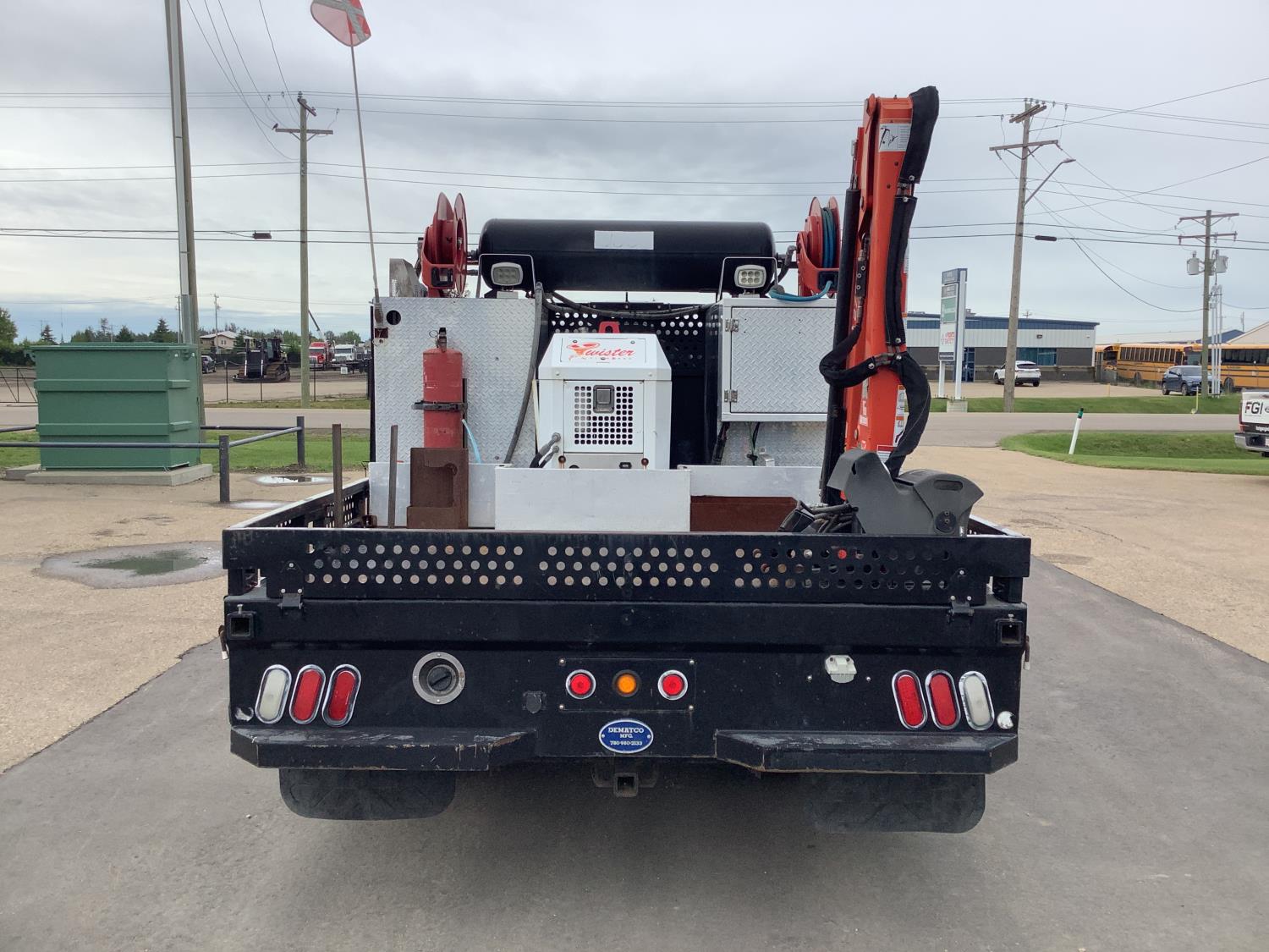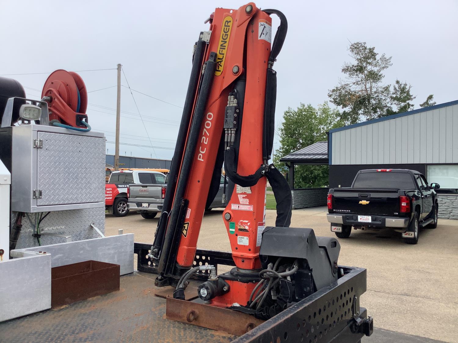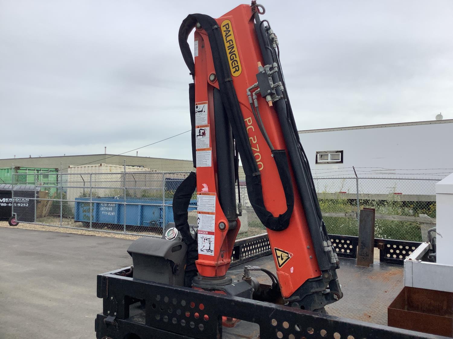 V10 6.8 liter gas engine, automatic transmission, 6 ft 9 inch flat deck, deck mounted Twister T100 air compressor, Palfinger piece2700 compact knuckle boom crane, tool cabinets, rear tow hitch, all aluminum rims, duals, 6500 lb front axle, 12,000 rear axle, 225/70R19.5