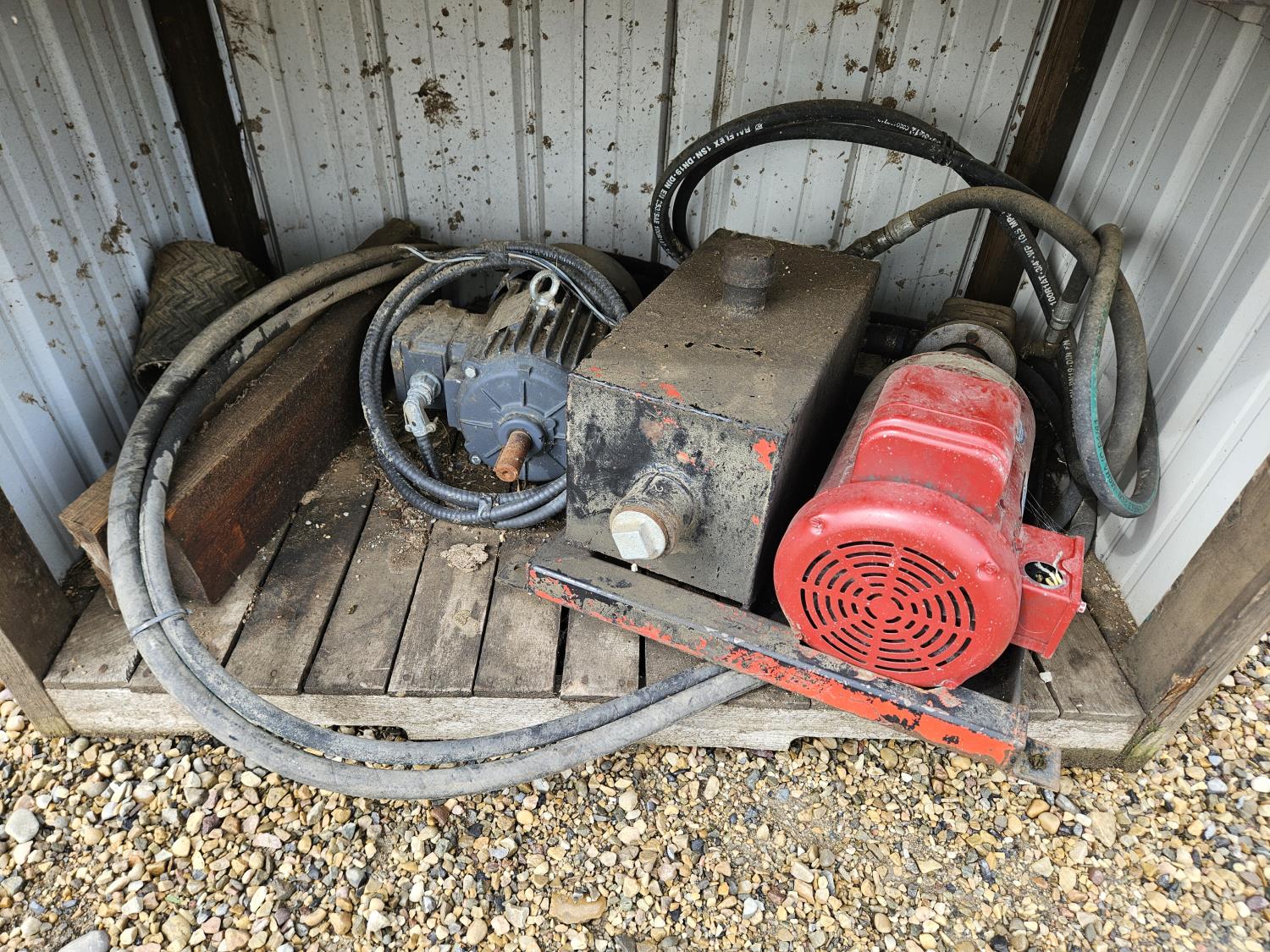 hydraulic controls, steel floor, Leeson electric 5 HP, 230 v electric motor, hydraulic power pack, c/w spare pump/electric motor