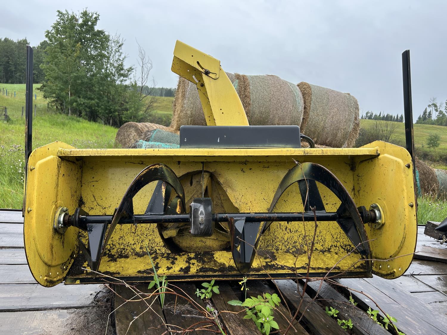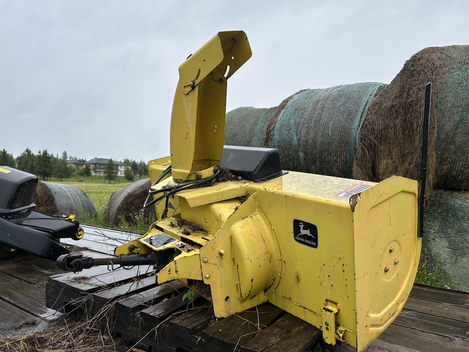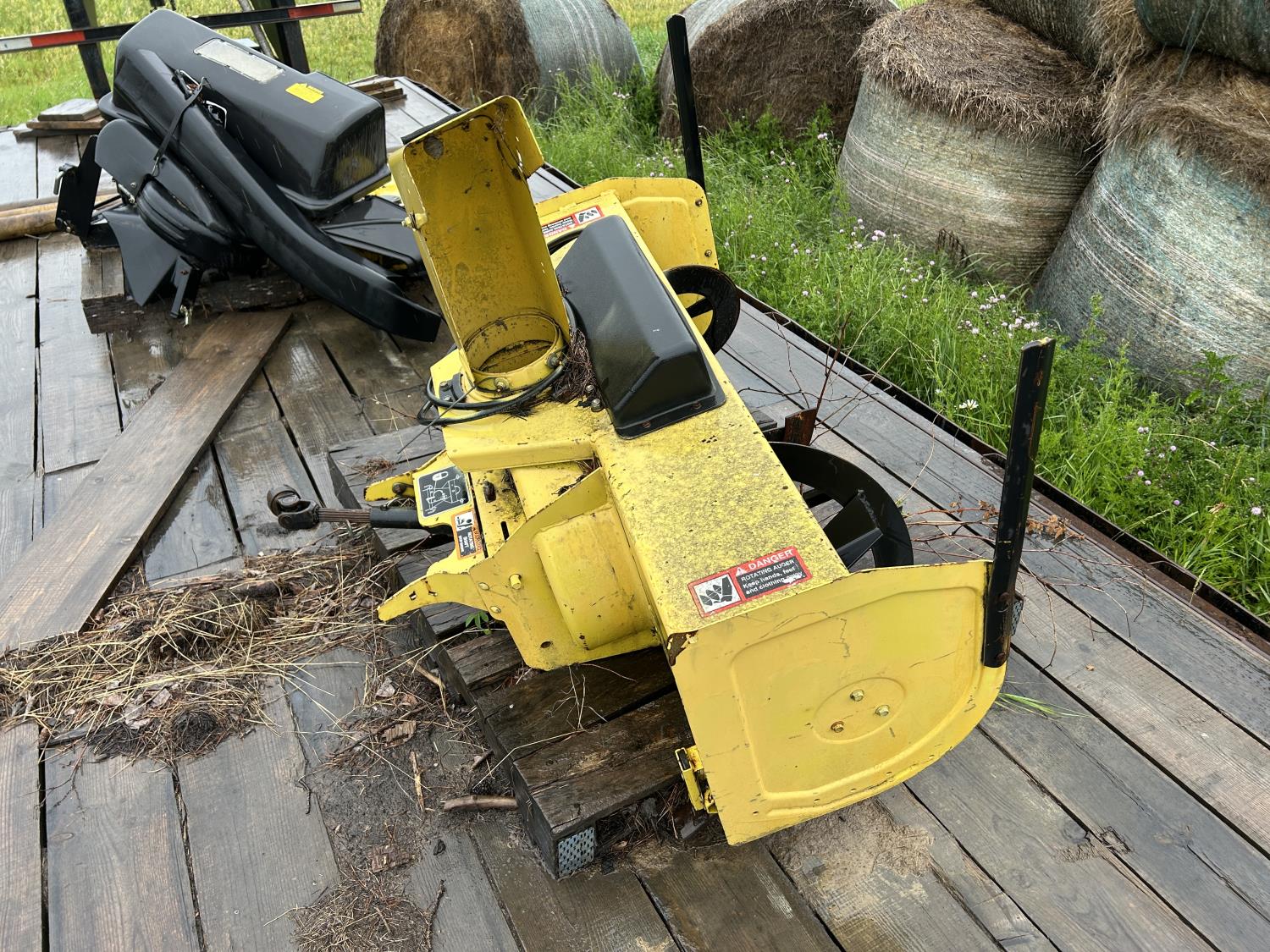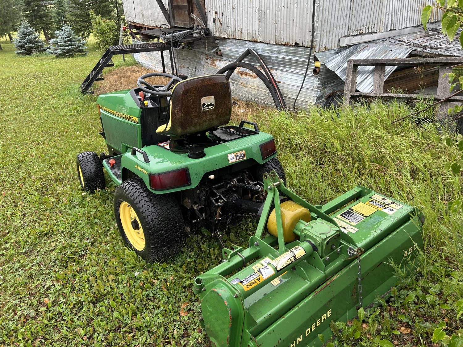 Selling as a package including 54 inch mid mount mower deck, power flow bagger (less bags), John Deere 47 inch front mount snow blower, John Deere PTO drive 450 Tiller