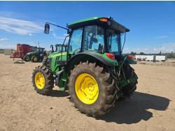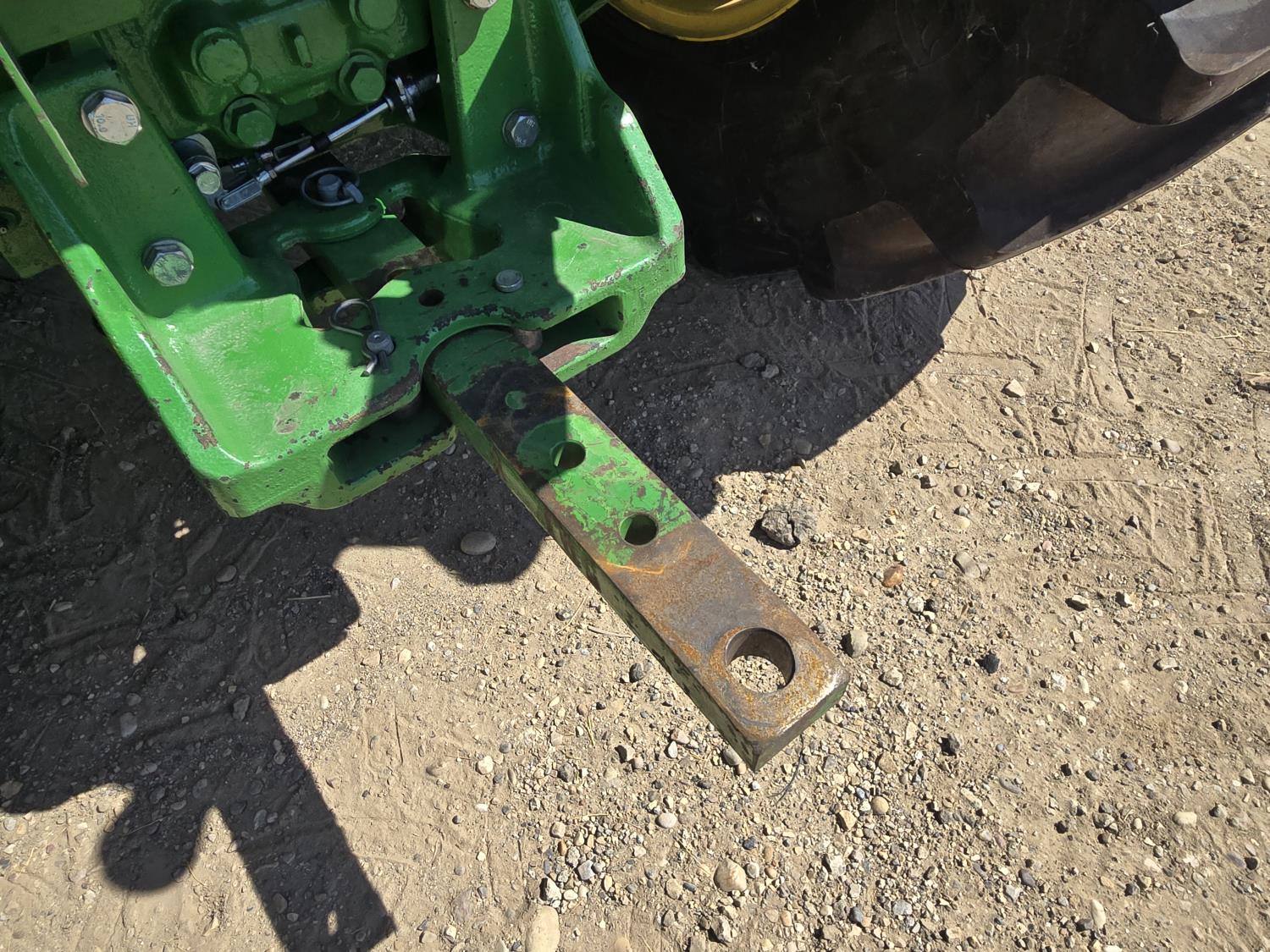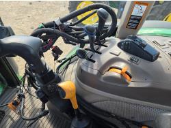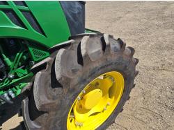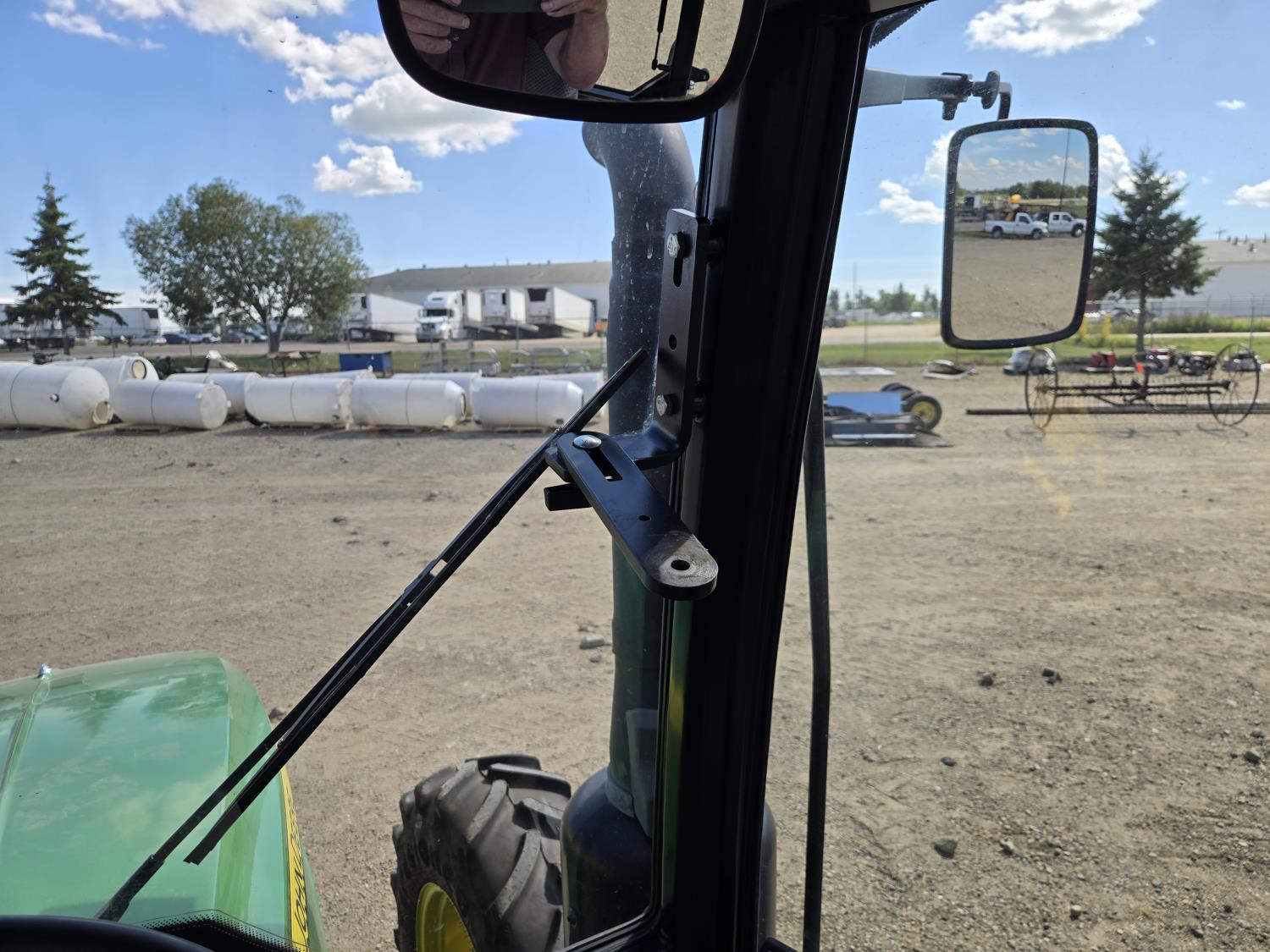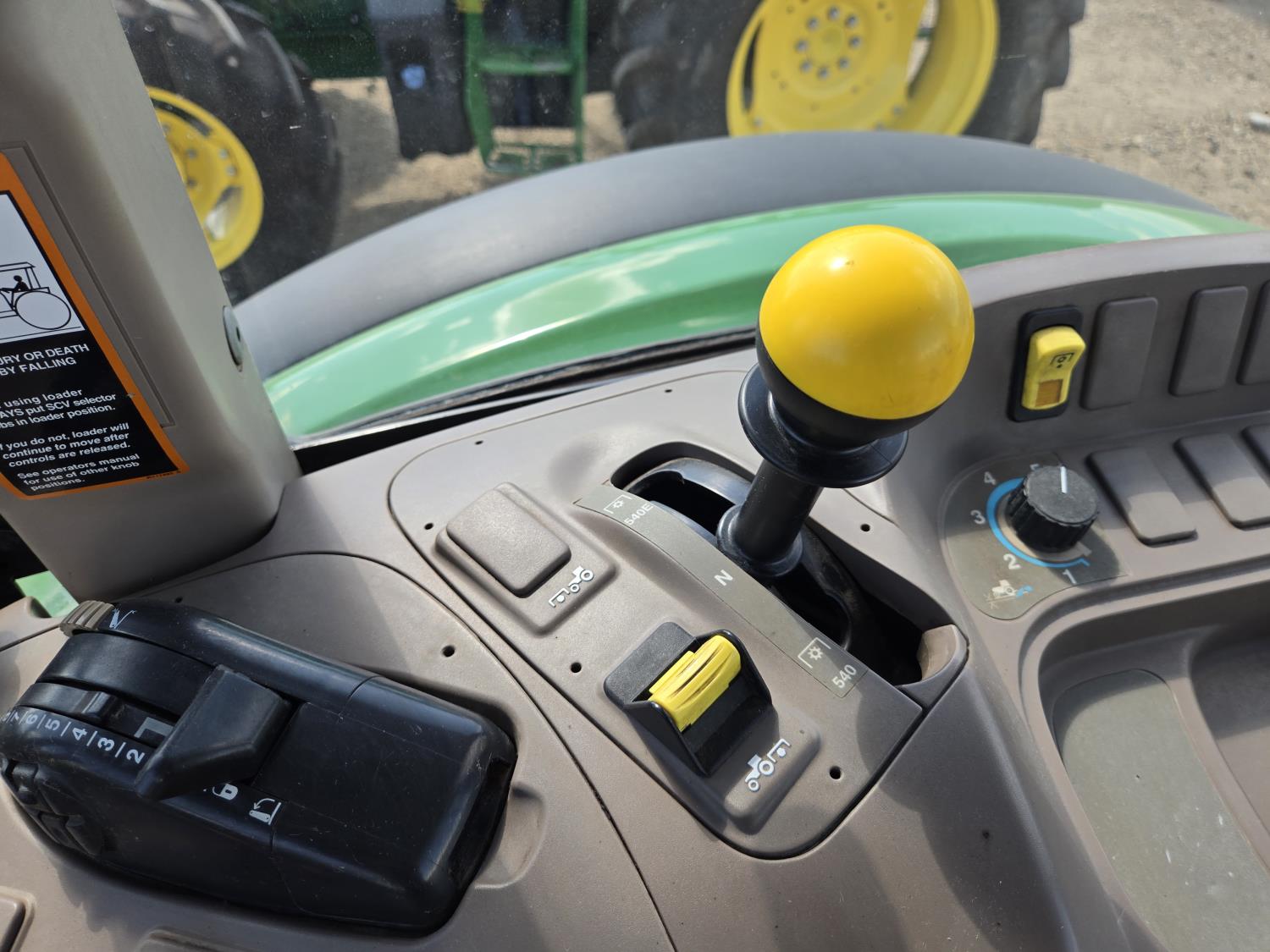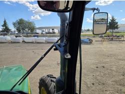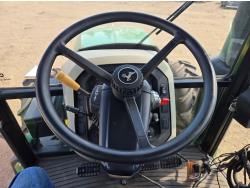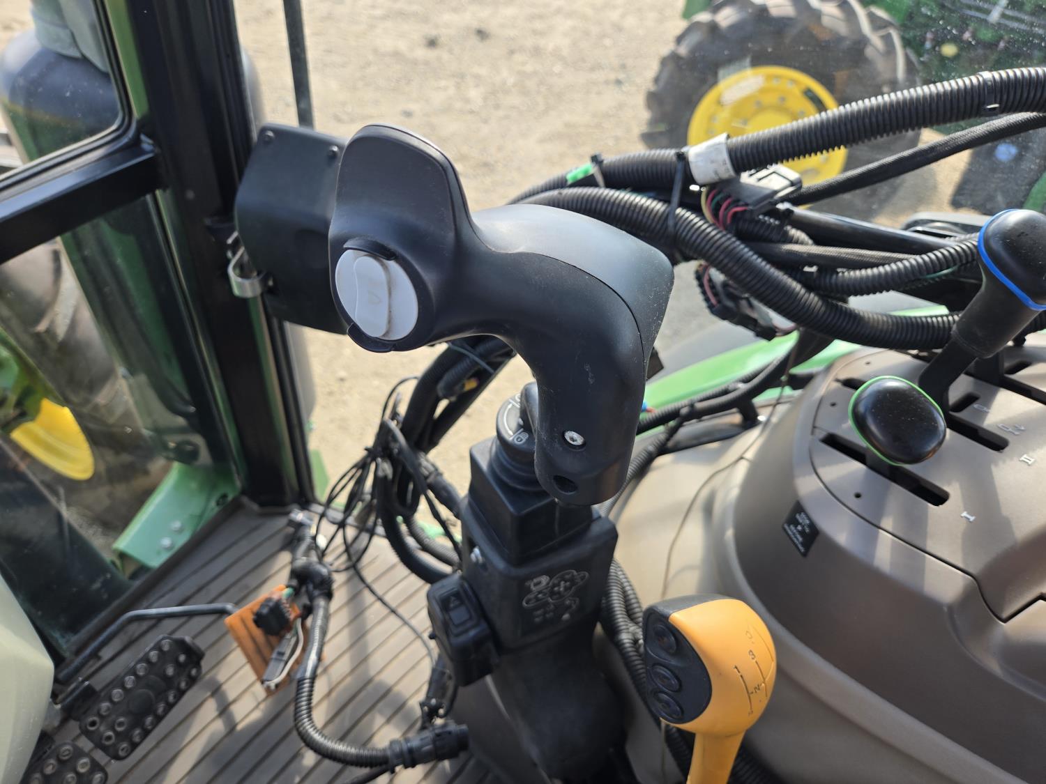 John Deere 4.5 4 cylinder 90 HP, diesel engine, 32 speed partial power shift transmission, cab, left hand reverser, rear differential lock, A/C, radio, ATV steering wheel installed, 540E / 540/1000 PTO, 3 point hitch, 3 point hitch exterior control, 3 rear hydraulic outlets, front weight bracket, joystick, (3) mid hydraulics, loader ready, 320/85R24 front tires, 460/85R30 rear tires