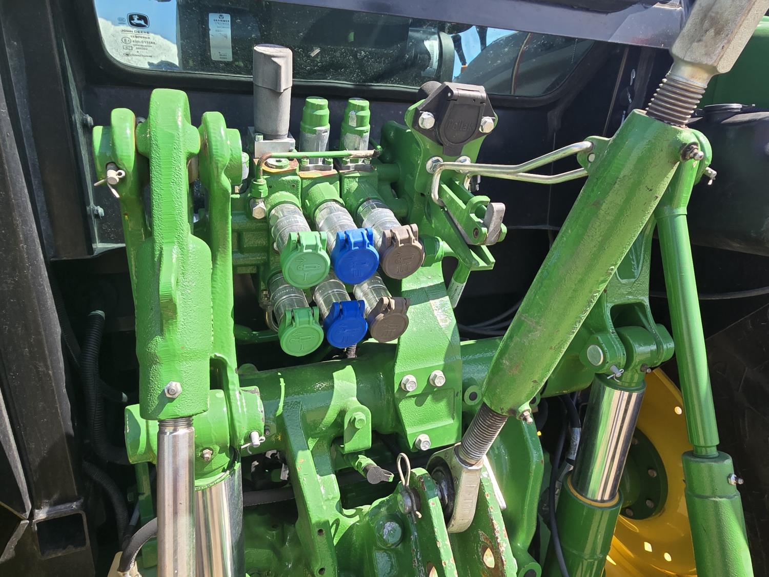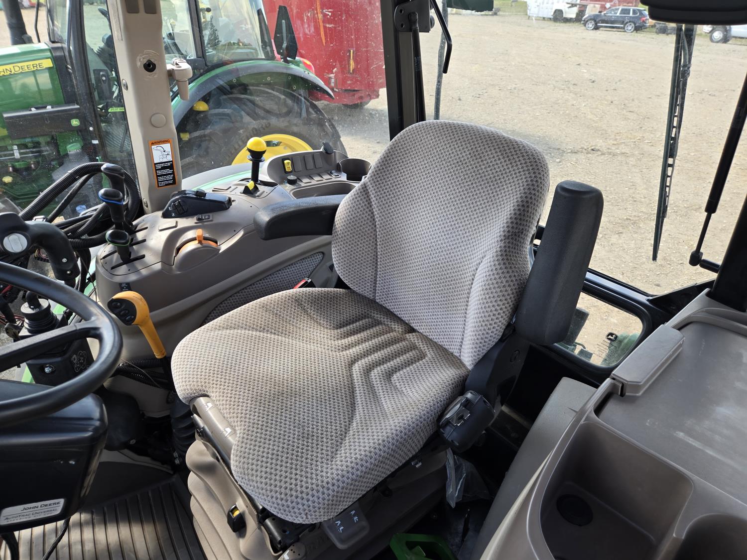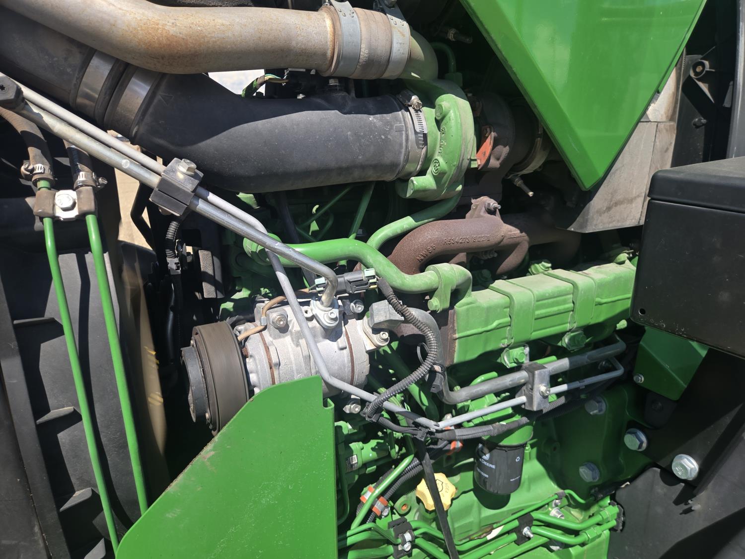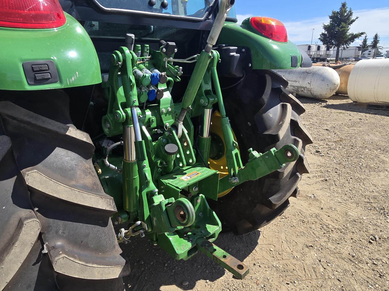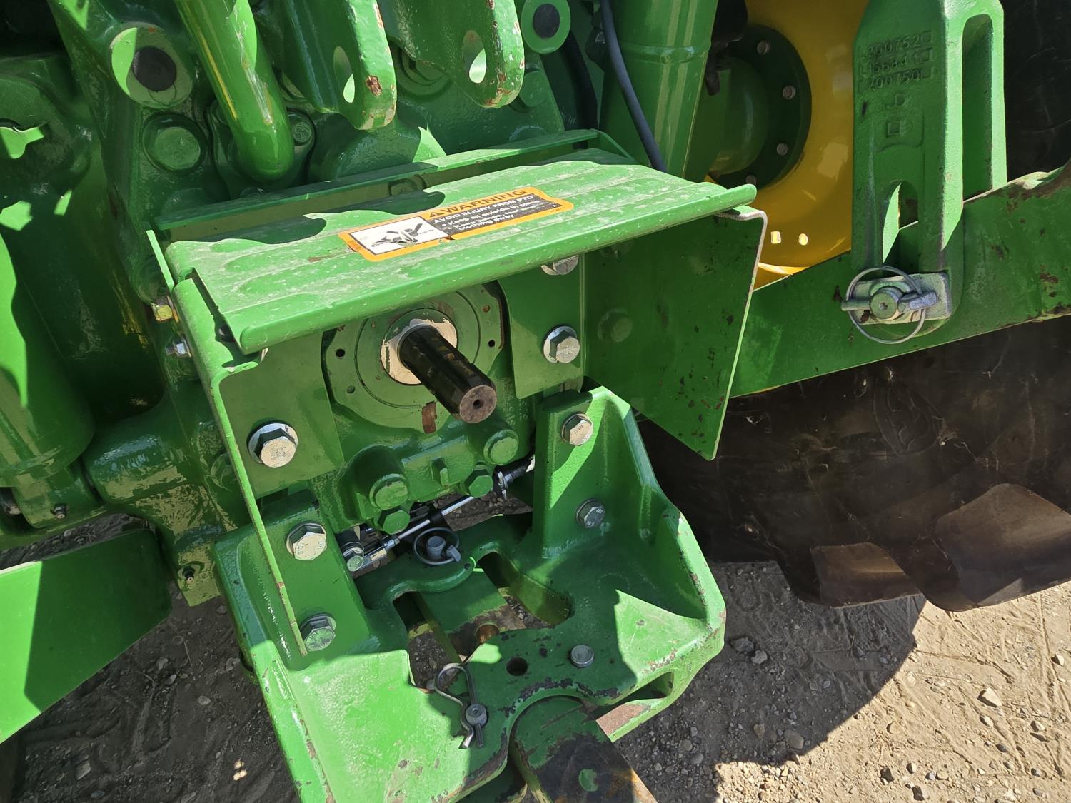 John Deere 4.5 4 cylinder 90 HP, diesel engine, 32 speed partial power shift transmission, cab, left hand reverser, rear differential lock, A/C, radio, ATV steering wheel installed, 540E / 540/1000 PTO, 3 point hitch, 3 point hitch exterior control, 3 rear hydraulic outlets, front weight bracket, joystick, (3) mid hydraulics, loader ready, 320/85R24 front tires, 460/85R30 rear tires